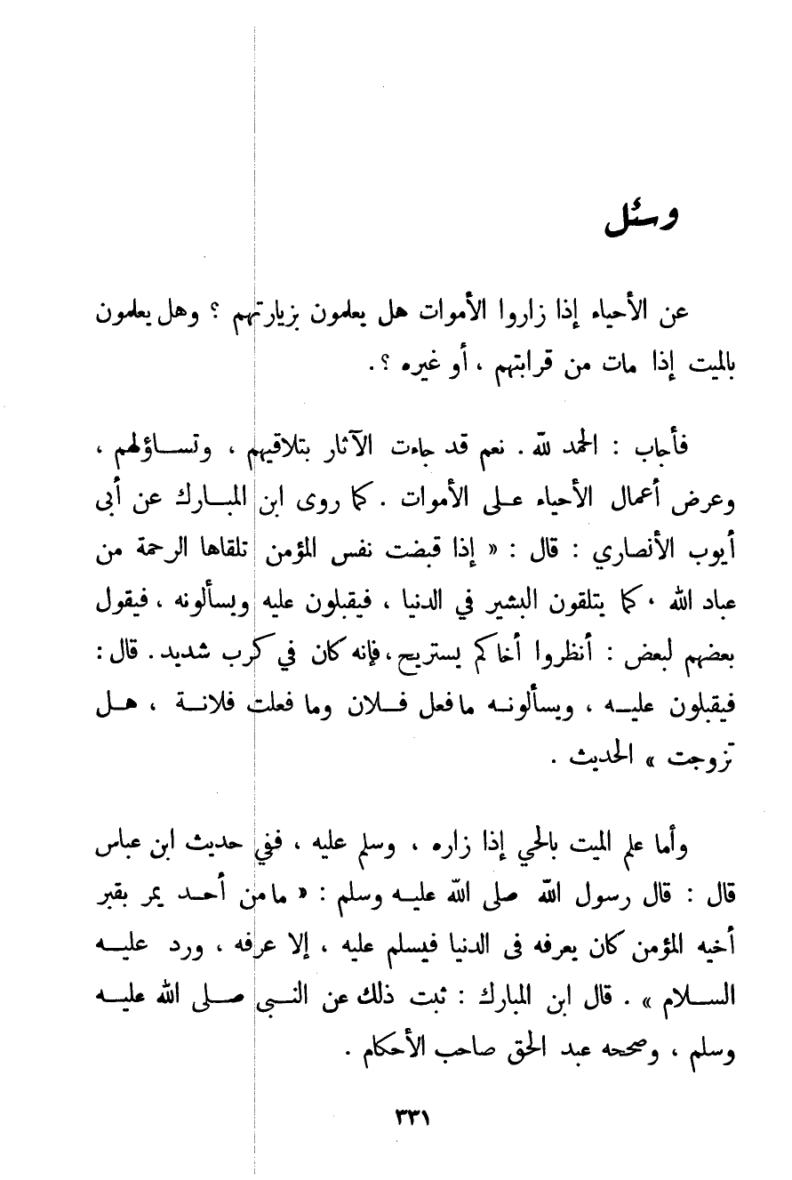 الْحَمْدُ لِلَّهِ، نَعَمْ قَدْ جَاءَتْ الْآثَارُ بِتَلَاقِيهِمْ وَتَسَاؤُلِهِمْ وَعَرْضِ أَعْمَالِ الْأَحْيَاءِ عَلَى الْأَمْوَاتِ، كَمَا رَوَى ابْنُ الْمُبَارَكِ عَنْ أَبِي أَيُّوبَ الْأَنْصَارِيِّ: قَالَ: {إذَا قُبِضَتْ نَفْسُ الْمُؤْمِنِ تَلَقَّاهَا الرَّحْمَةُ مِنْ عِبَادِ اللَّهِ كَمَا يَتَلَقَّوْنَ الْبَشِيرَ فِي الدُّنْيَا فَيُقْبِلُونَ عَلَيْهِ وَيَسْأَلُونَهُ فَيَقُولُ بَعْضُهُمْ لِبَعْضِ: أَنْظِرُوا أَخَاكُمْ يَسْتَرِيحُ فَإِنَّهُ كَانَ فِي كَرْبٍ شَدِيدٍ. قَالَ: فَيُقْبِلُونَ عَلَيْهِ وَيَسْأَلُونَهُ مَا فَعَلَ فُلَانٌ وَمَا فَعَلَتْ فُلَانَةُ هَلْ تَزَوَّجَتْ} الْحَدِيثَ. وَأَمَّا عِلْمُ الْمَيِّتِ بِالْحَيِّ إذَا زَارَهُ وَسَلَّمَ عَلَيْهِ فَفِي حَدِيثِ ابْنِ عَبَّاسٍ قَالَ: قَالَ رَسُولُ اللَّهِ صَلَّى اللَّهُ عَلَيْهِ وَسَلَّمَ {مَا مِنْ أَحَدٍ يَمُرُّ بِقَبْرِ أَخِيهِ الْمُؤْمِنِ كَانَ يَعْرِفُهُ فِي الدُّنْيَا فَيُسَلِّمُ عَلَيْهِ إلَّا عَرَفَهُ وَرَدَّ عَلَيْهِ السَّلَامَ} . قَالَ ابْنُ الْمُبَارَكِ: ثَبَتَ ذَلِكَ عَنْ النَّبِيِّ صَلَّى اللَّهُ عَلَيْهِ وَسَلَّمَ وَصَحَّحَهُ عَبْدُ الْحَقِّ صَاحِبُ الْأَحْكَامِ.