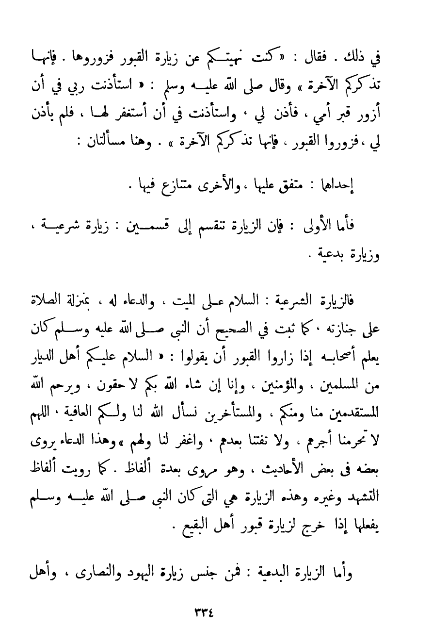 فِي ذَلِكَ. فَقَالَ: {كُنْت نَهَيْتُكُمْ عَنْ زِيَارَةِ الْقُبُورِ فَزُورُوهَا. فَإِنَّهَا تُذَكِّرُكُمْ الْآخِرَةَ} وَقَالَ صَلَّى اللَّهُ عَلَيْهِ وَسَلَّمَ {اسْتَأْذَنْت رَبِّي فِي أَنْ أَزُورَ قَبْرَ أُمِّي فَأَذِنَ لِي وَاسْتَأْذَنْت فِي أَنْ أَسْتَغْفِرَ لَهَا فَلَمْ يَأْذَنْ لِي فَزُورُوا الْقُبُورَ فَإِنَّهَا تُذَكِّرُكُمْ الْآخِرَةَ} . وَهُنَا مَسْأَلَتَانِ: إحْدَاهُمَا: مُتَّفَقٌ عَلَيْهَا وَالْأُخْرَى مُتَنَازَعٌ فِيهَا. فَأَمَّا الْأُولَى: فَإِنَّ الزِّيَارَةَ تَنْقَسِمُ إلَى قِسْمَيْنِ: زِيَارَةٌ شَرْعِيَّةٌ وَزِيَارَةٌ بِدْعِيَّةٌ. فَالزِّيَارَةُ الشَّرْعِيَّةُ: السَّلَامُ عَلَى الْمَيِّتِ وَالدُّعَاءُ لَهُ بِمَنْزِلَةِ الصَّلَاةِ عَلَى جِنَازَتِهِ كَمَا ثَبَتَ فِي الصَّحِيحِ {أَنَّ النَّبِيَّ صَلَّى اللَّهُ عَلَيْهِ وَسَلَّمَ كَانَ يُعَلِّمُ أَصْحَابَهُ إذَا زَارُوا الْقُبُورَ أَنْ يَقُولُوا: السَّلَامُ عَلَيْكُمْ أَهْلَ الدِّيَارِ مِنْ الْمُسْلِمِينَ وَالْمُؤْمِنِينَ وَإِنَّا إنْ شَاءَ اللَّهُ بِكُمْ لَاحِقُونَ وَيَرْحَمُ اللَّهُ الْمُسْتَقْدِمِينَ مِنَّا وَمِنْكُمْ وَالْمُسْتَأْخِرِين نَسْأَلُ اللَّهَ لَنَا وَلَكُمْ الْعَافِيَةَ اللَّهُمَّ لَا تَحْرِمْنَا أَجْرَهُمْ وَلَا تَفْتِنَّا بَعْدَهُمْ وَاغْفِرْ لَنَا وَلَهُمْ} وَهَذَا الدُّعَاءُ يُرْوَى بَعْضُهُ فِي بَعْضِ الْأَحَادِيثِ وَهُوَ مَرْوِيٌّ بِعِدَّةِ أَلْفَاظٍ، كَمَا رُوِيَتْ أَلْفَاظُ التَّشَهُّدِ وَغَيْرِهِ وَهَذِهِ الزِّيَارَةُ هِيَ الَّتِي كَانَ النَّبِيُّ صَلَّى اللَّهُ عَلَيْهِ وَسَلَّمَ يَفْعَلُهَا إذَا خَرَجَ لِزِيَارَةِ قُبُورِ أَهْلِ الْبَقِيعِ. وَأَمَّا الزِّيَارَةُ الْبِدْعِيَّةُ: فَمِنْ جِنْسِ زِيَارَةِ الْيَهُودِ وَالنَّصَارَى وَأَهْلِ