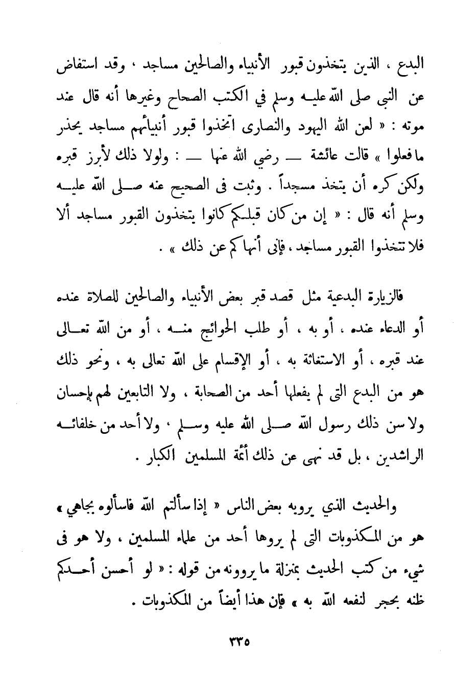 الْبِدَعِ الَّذِينَ يَتَّخِذُونَ قُبُورَ الْأَنْبِيَاءِ وَالصَّالِحِينَ مَسَاجِدَ وَقَدْ اسْتَفَاضَ عَنْ النَّبِيِّ صَلَّى اللَّهُ عَلَيْهِ وَسَلَّمَ فِي الْكُتُبِ الصِّحَاحِ وَغَيْرِهَا أَنَّهُ قَالَ عِنْدَ مَوْتِهِ: {لَعَنَ اللَّهُ الْيَهُودَ وَالنَّصَارَى اتَّخَذُوا قُبُورَ أَنْبِيَائِهِمْ مَسَاجِدَ يُحَذِّرُ مَا فَعَلُوا} قَالَتْ عَائِشَةُ - رَضِيَ اللَّهُ عَنْهَا -: وَلَوْلَا ذَلِكَ لَأُبْرِزَ قَبْرُهُ وَلَكِنْ كُرِهَ أَنْ يُتَّخَذَ مَسْجِدًا، وَثَبَتَ فِي الصَّحِيحِ عَنْهُ صَلَّى اللَّهُ عَلَيْهِ وَسَلَّمَ أَنَّهُ قَالَ: {إنَّ مَنْ كَانَ قَبْلَكُمْ كَانُوا يَتَّخِذُونَ الْقُبُورَ مَسَاجِدَ أَلَا فَلَا تَتَّخِذُوا الْقُبُورَ مَسَاجِدَ فَإِنِّي أَنْهَاكُمْ عَنْ ذَلِكَ} . فَالزِّيَارَةُ الْبِدْعِيَّةُ مِثْلُ قَصْدِ قَبْرِ بَعْضِ الْأَنْبِيَاءِ وَالصَّالِحِينَ لِلصَّلَاةِ عِنْدَهُ أَوْ الدُّعَاءِ عِنْدَهُ أَوْ بِهِ أَوْ طَلَبِ الْحَوَائِجِ مِنْهُ أَوْ مِنْ اللَّهِ تَعَالَى عِنْدَ قَبْرِهِ أَوْ الِاسْتِغَاثَةِ بِهِ أَوْ الْإِقْسَامِ عَلَى اللَّهِ تَعَالَى بِهِ وَنَحْوِ ذَلِكَ هُوَ مِنْ الْبِدَعِ الَّتِي لَمْ يَفْعَلْهَا أَحَدٌ مِنْ الصَّحَابَةِ وَلَا التَّابِعِينَ لَهُمْ بِإِحْسَانِ وَلَا سَنَّ ذَلِكَ رَسُولُ اللَّهِ صَلَّى اللَّهُ عَلَيْهِ وَسَلَّمَ وَلَا أَحَدٌ مِنْ خُلَفَائِهِ الرَّاشِدِينَ بَلْ قَدْ نَهَى عَنْ ذَلِكَ أَئِمَّةُ الْمُسْلِمِينَ الْكِبَارُ. وَالْحَدِيثُ الَّذِي يَرْوِيهِ بَعْضُ النَّاسِ " إذَا سَأَلْتُمْ اللَّهَ فَاسْأَلُوهُ بِجَاهِي " هُوَ مِنْ الْمَكْذُوبَاتِ الَّتِي لَمْ يَرْوِهَا أَحَدٌ مِنْ عُلَمَاءِ الْمُسْلِمِينَ وَلَا هُوَ فِي شَيْءٍ مِنْ كُتُبِ الْحَدِيثِ بِمَنْزِلَةِ مَا يَرْوُونَهُ مِنْ قَوْلِهِ: " لَوْ أَحْسَنَ أَحَدُكُمْ ظَنَّهُ بِحَجَرٍ لَنَفَعَهُ اللَّهُ بِهِ " فَإِنَّ هَذَا أَيْضًا مِنْ الْمَكْذُوبَاتِ.