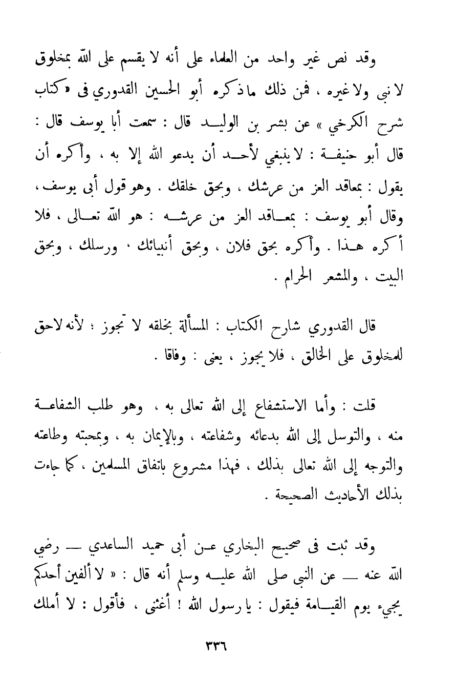 وَقَدْ نَصَّ غَيْرُ وَاحِدٍ مِنْ الْعُلَمَاءِ عَلَى أَنَّهُ لَا يُقْسَمُ عَلَى اللَّهِ بِمَخْلُوقٍ لَا نَبِيٍّ وَلَا غَيْرِهِ فَمِنْ ذَلِكَ مَا ذَكَرَهُ أَبُو الْحُسَيْنِ القدوري فِي " كِتَابِ شَرْحِ الْكَرْخِي " عَنْ بِشْرِ بْنِ الْوَلِيدِ قَالَ: سَمِعْت أَبَا يُوسُفَ قَالَ: قَالَ أَبُو حَنِيفَةَ: لَا يَنْبَغِي لِأَحَدٍ أَنْ يَدْعُوَ اللَّهَ إلَّا بِهِ وَأَكْرَهُ أَنْ يَقُولَ: بِمَعَاقِدِ الْعِزِّ مِنْ عَرْشِك وَبِحَقِّ خَلْقِك، وَهُوَ قَوْلُ أَبِي يُوسُفَ وَقَالَ أَبُو يُوسُفَ: بِمَعَاقِدِ الْعِزِّ مِنْ عَرْشِهِ: هُوَ اللَّهُ تَعَالَى فَلَا أَكْرَهُ هَذَا. وَأَكْرَهُ بِحَقِّ فُلَانٍ وَبِحَقِّ أَنْبِيَائِك وَرُسُلِك وَبِحَقِّ الْبَيْتِ وَالْمَشْعَرِ الْحَرَامِ. قَالَ القدوري شَارِحُ الْكِتَابِ: الْمَسْأَلَةُ بِخَلْقِهِ لَا تَجُوزُ؛ لِأَنَّهُ لَا حَقَّ لِلْمَخْلُوقِ عَلَى الْخَالِقِ فَلَا يَجُوزُ يَعْنِي: وِفَاقًا.