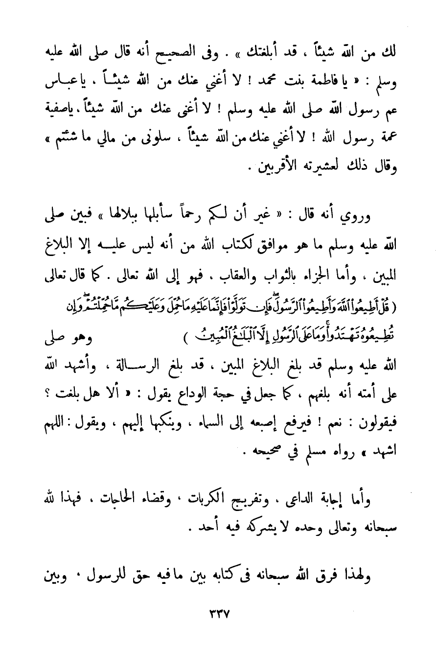 لَك مِنْ اللَّهِ شَيْئًا قَدْ أَبْلَغْتُك} . وَفِي الصَّحِيحِ أَنَّهُ قَالَ صَلَّى اللَّهُ عَلَيْهِ وَسَلَّمَ {يَا فَاطِمَةَ بِنْتَ مُحَمَّدٍ لَا أُغْنِي عَنْك مِنْ اللَّهِ شَيْئًا يَا عَبَّاسُ عَمَّ رَسُولِ اللَّهِ صَلَّى اللَّهُ عَلَيْهِ وَسَلَّمَ. لَا أُغْنِي عَنْك مِنْ اللَّهِ شَيْئًا يَا صَفِيَّةُ عَمَّةَ رَسُولِ اللَّهِ لَا أُغْنِي عَنْك مِنْ اللَّهِ شَيْئًا سَلُونِي مِنْ مَالِي مَا شِئْتُمْ} وَقَالَ ذَلِكَ لِعَشِيرَتِهِ الْأَقْرَبِينَ. وَرُوِيَ أَنَّهُ قَالَ: {غَيْرَ أَنَّ لَكُمْ رَحِمًا سَأَبُلُّهَا بِبِلَالِهَا} فَبَيَّنَ صَلَّى اللَّهُ عَلَيْهِ وَسَلَّمَ مَا هُوَ مُوَافِقٌ لِكِتَابِ اللَّهِ مِنْ أَنَّهُ لَيْسَ عَلَيْهِ إلَّا الْبَلَاغُ الْمُبِينُ وَأَمَّا الْجَزَاءُ بِالثَّوَابِ وَالْعِقَابِ فَهُوَ إلَى اللَّهِ تَعَالَى، كَمَا قَالَ تَعَالَى {قُلْ أَطِيعُوا اللَّهَ وَأَطِيعُوا الرَّسُولَ فَإِنْ تَوَلَّوْا فَإِنَّمَا عَلَيْهِ مَا حُمِّلَ وَعَلَيْكُمْ مَا حُمِّلْتُمْ وَإِنْ تُطِيعُوهُ تَهْتَدُوا وَمَا عَلَى الرَّسُولِ إلَّا الْبَلَاغُ الْمُبِينُ} وَهُوَ صَلَّى اللَّهُ عَلَيْهِ وَسَلَّمَ قَدْ بَلَّغَ الْبَلَاغَ الْمُبِينَ قَدْ بَلَّغَ الرِّسَالَةَ وَأَشْهَدَ اللَّهَ عَلَى أُمَّتِهِ أَنَّهُ بَلَّغَهُمْ كَمَا جَعَلَ فِي حَجَّةِ الْوَدَاعِ يَقُولُ: {أَلَا هَلْ بَلَّغْت؟ فَيَقُولُونَ: نَعَمْ فَيَرْفَعُ إصْبَعَهُ إلَى السَّمَاءِ وَيَنْكُتُهَا إلَيْهِمْ وَيَقُولُ: اللَّهُمَّ اشْهَدْ} رَوَاهُ مُسْلِمٌ فِي صَحِيحِهِ. وَأَمَّا إجَابَةُ الدَّاعِي وَتَفْرِيجُ الْكُرُبَاتِ وَقَضَاءُ الْحَاجَاتِ فَهَذَا لِلَّهِ سُبْحَانَهُ وَتَعَالَى وَحْدَهُ لَا يَشْرَكُهُ فِيهِ أَحَدٌ. وَلِهَذَا فَرَّقَ اللَّهُ سُبْحَانَهُ فِي كِتَابِهِ بَيْنَ مَا فِيهِ حَقٌّ لِلرَّسُولِ