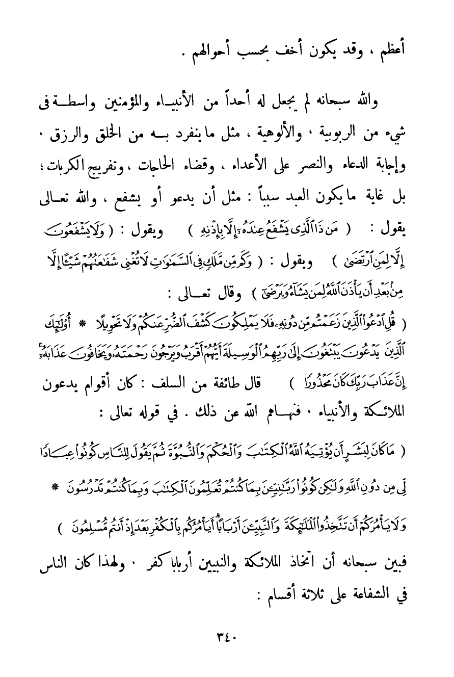 أَعْظَمَ وَقَدْ يَكُونُ أَخَفَّ بِحَسَبِ أَحْوَالِهِمْ. وَاَللَّهُ سُبْحَانَهُ لَمْ يَجْعَلْ لَهُ أَحَدًا مِنْ الْأَنْبِيَاءِ وَالْمُؤْمِنِينَ وَاسِطَةً فِي شَيْءٍ مِنْ الرُّبُوبِيَّةِ وَالْأُلُوهِيَّةِ مِثْلَ مَا يَنْفَرِدُ بِهِ مِنْ الْخَلْقِ وَالرِّزْقِ وَإِجَابَةِ الدُّعَاءِ وَالنَّصْرِ عَلَى الْأَعْدَاءِ وَقَضَاءِ الْحَاجَاتِ وَتَفْرِيجِ الْكُرُبَاتِ؛ بَلْ غَايَةُ مَا يَكُونُ الْعَبْدُ سَبَبًا: مِثْلُ أَنْ يَدْعُوَ أَوْ يَشْفَعَ وَاَللَّهُ تَعَالَى يَقُولُ: {مَنْ ذَا الَّذِي يَشْفَعُ عِنْدَهُ إلَّا بِإِذْنِهِ} وَيَقُولُ: {وَلَا يَشْفَعُونَ إلَّا لِمَنِ ارْتَضَى} وَيَقُولُ: {وَكَمْ مِنْ مَلَكٍ فِي السَّمَاوَاتِ لَا تُغْنِي شَفَاعَتُهُمْ شَيْئًا إلَّا مِنْ بَعْدِ أَنْ يَأْذَنَ اللَّهُ لِمَنْ يَشَاءُ وَيَرْضَى} وَقَالَ تَعَالَى: {قُلِ ادْعُوا الَّذِينَ زَعَمْتُمْ مِنْ دُونِهِ فَلَا يَمْلِكُونَ كَشْفَ الضُّرِّ عَنْكُمْ وَلَا تَحْوِيلًا} {أُولَئِكَ الَّذِينَ يَدْعُونَ يَبْتَغُونَ إلَى رَبِّهِمُ الْوَسِيلَةَ أَيُّهُمْ أَقْرَبُ وَيَرْجُونَ رَحْمَتَهُ وَيَخَافُونَ عَذَابَهُ إنَّ عَذَابَ رَبِّكَ كَانَ مَحْذُورًا} قَالَ طَائِفَةٌ مِنْ السَّلَفِ: كَانَ أَقْوَامٌ يَدْعُونَ الْمَلَائِكَةَ وَالْأَنْبِيَاءَ فَنَهَاهُمْ اللَّهُ عَنْ ذَلِكَ. فِي قَوْله تَعَالَى {مَا كَانَ لِبَشَرٍ أَنْ يُؤْتِيَهُ اللَّهُ الْكِتَابَ وَالْحُكْمَ وَالنُّبُوَّةَ ثُمَّ يَقُولَ لِلنَّاسِ كُونُوا عِبَادًا لِي مِنْ دُونِ اللَّهِ وَلَكِنْ كُونُوا رَبَّانِيِّينَ بِمَا كُنْتُمْ تُعَلِّمُونَ الْكِتَابَ وَبِمَا كُنْتُمْ تَدْرُسُونَ} {وَلَا يَأْمُرَكُمْ أَنْ تَتَّخِذُوا الْمَلَائِكَةَ وَالنَّبِيِّينَ أَرْبَابًا أَيَأْمُرُكُمْ بِالْكُفْرِ بَعْدَ إذْ أَنْتُمْ مُسْلِمُونَ} فَبَيَّنَ سُبْحَانَهُ أَنَّ اتِّخَاذَ الْمَلَائِكَةِ وَالنَّبِيِّينَ أَرْبَابًا كُفْرٌ وَلِهَذَا كَانَ النَّاسُ فِي الشَّفَاعَةِ عَلَى ثَلَاثَةِ أَقْسَامٍ: