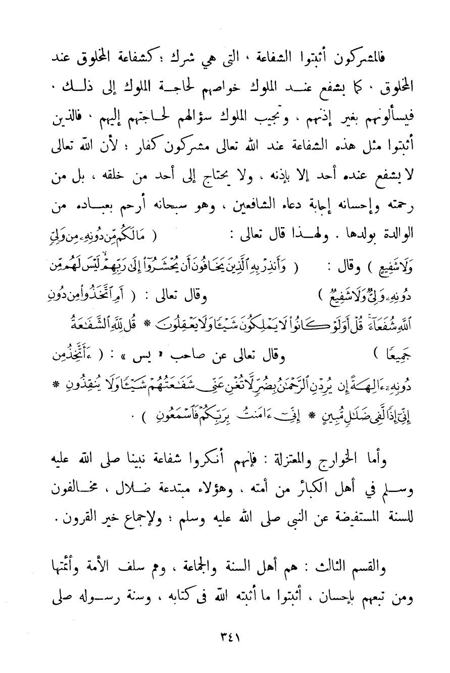 فَالْمُشْرِكُونَ أَثْبَتُوا الشَّفَاعَةَ الَّتِي هِيَ شِرْكٌ؛ كَشَفَاعَةِ الْمَخْلُوقِ عِنْدَ الْمَخْلُوقِ كَمَا يَشْفَعُ عِنْدَ الْمُلُوكِ خَوَّاصُهُمْ لِحَاجَةِ الْمُلُوكِ إلَى ذَلِكَ فَيَسْأَلُونَهُمْ بِغَيْرِ إذْنِهِمْ وَتُجِيبُ الْمُلُوكُ سُؤَالَهُمْ لِحَاجَتِهِمْ إلَيْهِمْ فَاَلَّذِينَ أَثْبَتُوا مِثْلَ هَذِهِ الشَّفَاعَةِ عِنْدَ اللَّهِ تَعَالَى مُشْرِكُونَ كُفَّارٌ؛ لِأَنَّ اللَّهَ تَعَالَى لَا يَشْفَعُ عِنْدَهُ أَحَدٌ إلَّا بِإِذْنِهِ وَلَا يَحْتَاجُ إلَى أَحَدٍ مِنْ خَلْقِهِ بَلْ مِنْ رَحْمَتِهِ وَإِحْسَانِهِ إجَابَةُ دُعَاءِ الشَّافِعِينَ وَهُوَ سُبْحَانَهُ أَرْحَمُ بِعِبَادِهِ مِنْ الْوَالِدَةِ بِوَلَدِهَا. وَلِهَذَا قَالَ تَعَالَى: {مَا لَكُمْ مِنْ دُونِهِ مِنْ وَلِيٍّ وَلَا شَفِيعٍ} وَقَالَ: {وَأَنْذِرْ بِهِ الَّذِينَ يَخَافُونَ أَنْ يُحْشَرُوا إلَى رَبِّهِمْ لَيْسَ لَهُمْ مِنْ دُونِهِ وَلِيٌّ وَلَا شَفِيعٌ} وَقَالَ تَعَالَى: {أَمِ اتَّخَذُوا مِنْ دُونِ اللَّهِ شُفَعَاءَ قُلْ أَوَلَوْ كَانُوا لَا يَمْلِكُونَ شَيْئًا وَلَا يَعْقِلُونَ} {قُلْ لِلَّهِ الشَّفَاعَةُ جَمِيعًا} وَقَالَ تَعَالَى عَنْ صَاحِبِ " يس ": {أَأَتَّخِذُ مِنْ دُونِهِ آلِهَةً إنْ يُرِدْنِ الرَّحْمَنُ بِضُرٍّ لَا تُغْنِ عَنِّي شَفَاعَتُهُمْ شَيْئًا وَلَا يُنْقِذُونِ} {إنِّي إذًا لَفِي ضَلَالٍ مُبِينٍ} {إنِّي آمَنْتُ بِرَبِّكُمْ فَاسْمَعُونِ} . وَأَمَّا الْخَوَارِجُ وَالْمُعْتَزِلَةُ: فَإِنَّهُمْ أَنْكَرُوا شَفَاعَةَ نَبِيِّنَا صَلَّى اللَّهُ عَلَيْهِ وَسَلَّمَ فِي أَهْلِ الْكَبَائِرِ مِنْ أُمَّتِهِ وَهَؤُلَاءِ مُبْتَدِعَةٌ ضُلَّالٌ مُخَالِفُونَ لِلسُّنَّةِ الْمُسْتَفِيضَةِ عَنْ النَّبِيِّ صَلَّى اللَّهُ عَلَيْهِ وَسَلَّمَ وَلِإِجْمَاعِ خَيْرِ الْقُرُونِ. وَالْقِسْمُ الثَّالِثُ: هُمْ أَهْلُ السُّنَّةِ وَالْجَمَاعَةِ وَهُمْ سَلَفُ الْأُمَّةِ وَأَئِمَّتُهَا وَمَنْ تَبِعَهُمْ بِإِحْسَانِ أَثْبَتُوا مَا أَثْبَتَهُ اللَّهُ فِي كِتَابِهِ وَسُنَّةِ رَسُولِهِ