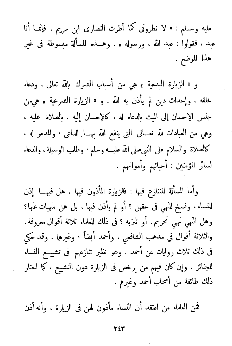 وَأَمَّا الْمَسْأَلَةُ الْمُتَنَازَعُ فِيهَا: فَالزِّيَارَةُ الْمَأْذُونُ فِيهَا هَلْ فِيهَا إذْنٌ لِلنِّسَاءِ وَنَسْخٌ لِلنَّهْيِ فِي حَقِّهِنَّ؟ أَوْ لَمْ يَأْذَنْ فِيهَا بَلْ هُنَّ مَنْهِيَّاتٌ عَنْهَا؟ وَهَلْ النَّهْيُ نَهْيُ تَحْرِيمٍ أَوْ تَنْزِيهٍ؟ فِي ذَلِكَ لِلْعُلَمَاءِ ثَلَاثَةُ أَقْوَالٍ مَعْرُوفَةٍ وَالثَّلَاثَةُ أَقْوَالٌ فِي مَذْهَبِ الشَّافِعِيِّ وَأَحْمَد أَيْضًا وَغَيْرِهِمَا. وَقَدْ حُكِيَ فِي ذَلِكَ ثَلَاثُ رِوَايَاتٍ عَنْ أَحْمَد، وَهُوَ نَظِيرُ تَنَازُعِهِمْ فِي تَشْيِيعِ النِّسَاءِ لِلْجَنَائِزِ وَإِنْ كَانَ فِيهِمْ مَنْ يُرَخِّصُ فِي الزِّيَارَةِ دُونَ التَّشْيِيعِ كَمَا اخْتَارَ ذَلِكَ طَائِفَةٌ مِنْ أَصْحَابِ أَحْمَد وَغَيْرِهِمْ. فَمِنْ الْعُلَمَاءِ مَنْ اعْتَقَدَ أَنَّ النِّسَاءَ مَأْذُونٌ لَهُنَّ فِي الزِّيَارَةِ وَأَنَّهُ أَذِنَ