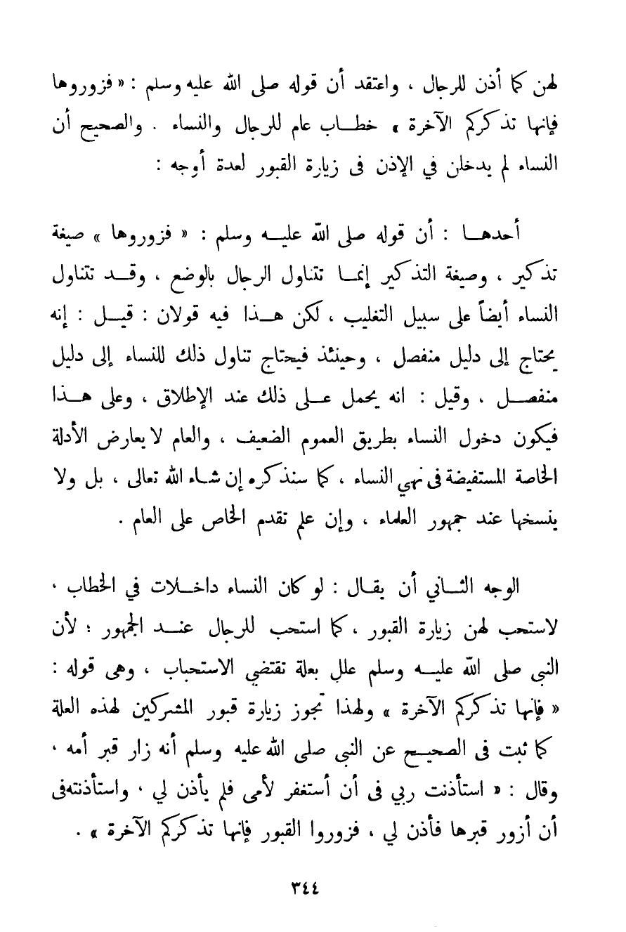 لَهُنَّ كَمَا أَذِنَ لِلرِّجَالِ وَاعْتَقَدَ أَنَّ قَوْلَهُ صَلَّى اللَّهُ عَلَيْهِ وَسَلَّمَ {فَزُورُوهَا فَإِنَّهَا تُذَكِّرُكُمْ الْآخِرَةَ} خِطَابٌ عَامٌّ لِلرِّجَالِ وَالنِّسَاءِ، وَالصَّحِيحُ أَنَّ النِّسَاءَ لَمْ يَدْخُلْنَ فِي الْإِذْنِ فِي زِيَارَةِ الْقُبُورِ لِعِدَّةِ أَوْجُهٍ: أَحَدُهَا: أَنَّ قَوْلَهُ صَلَّى اللَّهُ عَلَيْهِ وَسَلَّمَ " فَزُورُوهَا " صِيغَةُ تَذْكِيرٍ وَصِيغَةُ التَّذْكِيرِ إنَّمَا تَتَنَاوَلُ الرِّجَالَ بِالْوَضْعِ وَقَدْ تَتَنَاوَلُ النِّسَاءَ أَيْضًا عَلَى سَبِيلِ التَّغْلِيبِ لَكِنَّ هَذَا فِيهِ قَوْلَانِ: قِيلَ: إنَّهُ يَحْتَاجُ إلَى دَلِيلٍ مُنْفَصِلٍ وَحِينَئِذٍ فَيَحْتَاجُ تَنَاوُلُ ذَلِكَ لِلنِّسَاءِ إلَى دَلِيلٍ مُنْفَصِلٍ وَقِيلَ: إنَّهُ يُحْمَلُ عَلَى ذَلِكَ عِنْدَ الْإِطْلَاقِ وَعَلَى هَذَا فَيَكُونُ دُخُولُ النِّسَاءِ بِطَرِيقِ الْعُمُومِ الضَّعِيفِ وَالْعَامِّ لَا يُعَارِضُ الْأَدِلَّةَ الْخَاصَّةَ الْمُسْتَفِيضَةَ فِي نَهْيِ النِّسَاءِ كَمَا سَنَذْكُرُهُ إنْ شَاءَ اللَّهُ تَعَالَى بَلْ وَلَا يَنْسَخُهَا عِنْدَ جُمْهُورِ الْعُلَمَاءِ وَإِنْ عُلِمَ تَقَدُّمُ الْخَاصِّ عَلَى الْعَامِّ. الْوَجْهُ الثَّانِي أَنْ يُقَالَ: لَوْ كَانَ النِّسَاءُ دَاخِلَاتٍ فِي الْخِطَابِ لَاسْتَحَبَّ لَهُنَّ زِيَارَةَ الْقُبُورِ كَمَا اسْتَحَبَّ لِلرِّجَالِ عِنْدَ الْجُمْهُورِ؛ لِأَنَّ النَّبِيَّ صَلَّى اللَّهُ عَلَيْهِ وَسَلَّمَ عَلَّلَ بِعِلَّةٍ تَقْتَضِي الِاسْتِحْبَابَ وَهِيَ قَوْلُهُ: {فَإِنَّهَا تُذَكِّرُكُمْ الْآخِرَةَ} وَلِهَذَا تَجُوزُ زِيَارَةُ قُبُورِ الْمُشْرِكِينَ لِهَذِهِ الْعِلَّةِ كَمَا ثَبَتَ فِي الصَّحِيحِ عَنْ النَّبِيِّ صَلَّى اللَّهُ عَلَيْهِ وَسَلَّمَ أَنَّهُ زَارَ قَبْرَ أُمِّهِ وَقَالَ: {اسْتَأْذَنْت رَبِّي فِي أَنْ أَسْتَغْفِرَ لِأُمِّي فَلَمْ يَأْذَنْ لِي وَاسْتَأْذَنْته فِي أَنْ أَزُورَ قَبْرَهَا فَأَذِنَ لِي فَزُورُوا الْقُبُورَ فَإِنَّهَا تُذَكِّرُكُمْ الْآخِرَةَ} .
