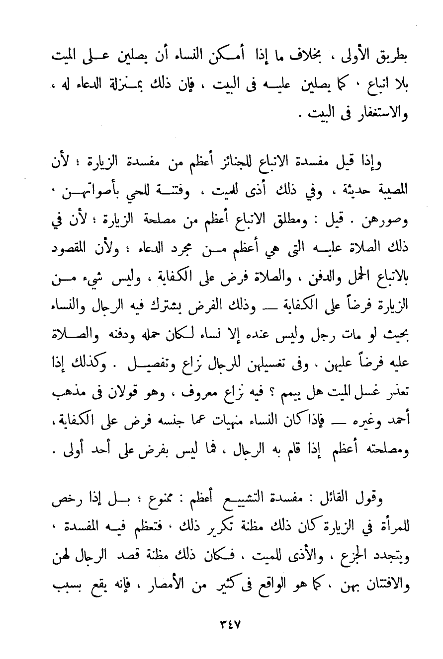 الْأَوْلَى بِخِلَافِ مَا إذَا أَمْكَنَ النِّسَاءَ أَنْ يُصَلِّينَ عَلَى الْمَيِّتِ بِلَا اتِّبَاعٍ كَمَا يُصَلِّينَ عَلَيْهِ فِي الْبَيْتِ فَإِنَّ ذَلِكَ بِمَنْزِلَةِ الدُّعَاءِ لَهُ وَالِاسْتِغْفَارِ فِي الْبَيْتِ. وَإِذَا قِيلَ مَفْسَدَةُ الِاتِّبَاعِ لِلْجَنَائِزِ أَعْظَمُ مِنْ مَفْسَدَةِ الزِّيَارَةِ؛ لِأَنَّ الْمُصِيبَةَ حَدِيثَةٌ وَفِي ذَلِكَ أَذًى لِلْمَيِّتِ وَفِتْنَةٌ لِلْحَيِّ بِأَصْوَاتِهِنَّ وَصُوَرِهِنَّ. قِيلَ: وَمُطْلَقُ الِاتِّبَاعِ أَعْظَمُ مِنْ مَصْلَحَةِ الزِّيَارَةِ؛ لِأَنَّ فِي ذَلِكَ الصَّلَاةَ عَلَيْهِ الَّتِي هِيَ أَعْظَمُ مِنْ مُجَرَّدِ الدُّعَاءِ؛ وَلِأَنَّ الْمَقْصُودَ بِالِاتِّبَاعِ الْحَمْلُ وَالدَّفْنُ وَالصَّلَاةُ فَرْضٌ عَلَى الْكِفَايَةِ وَلَيْسَ شَيْءٌ مِنْ الزِّيَارَةِ فَرْضًا عَلَى الْكِفَايَةِ - وَذَلِكَ الْفَرْضُ يَشْتَرِكُ فِيهِ الرِّجَالُ وَالنِّسَاءُ بِحَيْثُ لَوْ مَاتَ رَجُلٌ وَلَيْسَ عِنْدَهُ إلَّا نِسَاءٌ لَكَانَ حَمْلُهُ وَدَفْنُهُ وَالصَّلَاةُ عَلَيْهِ فَرْضًا عَلَيْهِنَّ وَفِي تَغْسِيلِهِنَّ لِلرِّجَالِ نِزَاعٌ وَتَفْصِيلٌ. وَكَذَلِكَ إذَا تَعَذَّرَ غُسْلُ الْمَيِّتِ هَلْ يُيَمَّمُ؟ فِيهِ نِزَاعٌ مَعْرُوفٌ وَهُوَ قَوْلَانِ فِي مَذْهَبِ أَحْمَد وَغَيْرِهِ - فَإِذَا كَانَ النِّسَاءُ مَنْهِيَّاتٍ عَمَّا جِنْسُهُ فَرْضٌ عَلَى الْكِفَايَةِ وَمَصْلَحَتُهُ أَعْظَمُ إذَا قَامَ بِهِ الرِّجَالُ فَمَا لَيْسَ بِفَرْضٍ عَلَى أَحَدٍ أَوْلَى. وَقَوْلُ الْقَائِلِ: مَفْسَدَةُ التَّشْيِيعِ أَعْظَمُ: مَمْنُوعٌ؛ بَلْ إذَا رُخِّصَ لِلْمَرْأَةِ فِي الزِّيَارَةِ كَانَ ذَلِكَ مَظِنَّةَ تَكْرِيرِ ذَلِكَ فَتَعْظُمُ فِيهِ الْمَفْسَدَةُ وَيَتَجَدَّدُ الْجَزَعُ وَالْأَذَى لِلْمَيِّتِ فَكَانَ ذَلِكَ مَظِنَّةَ قَصْدِ الرِّجَالِ لَهُنَّ وَالِافْتِتَانِ بِهِنَّ كَمَا هُوَ الْوَاقِعُ فِي كَثِيرٍ مِنْ الْأَمْصَارِ فَإِنَّهُ يَقَعُ بِسَبَبِ