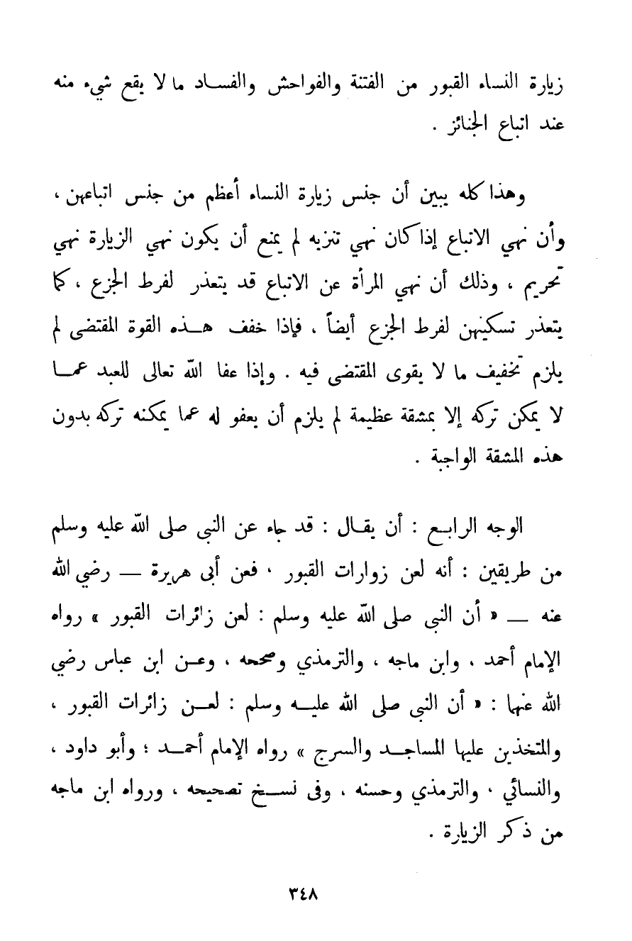 زِيَارَةِ النِّسَاءِ الْقُبُورَ مِنْ الْفِتْنَةِ وَالْفَوَاحِشِ وَالْفَسَادِ مَا لَا يَقَعُ شَيْءٌ مِنْهُ عِنْدَ اتِّبَاعِ الْجَنَائِزِ. وَهَذَا كُلُّهُ يُبَيِّنُ أَنَّ جِنْسَ زِيَارَةِ النِّسَاءِ أَعْظَمُ مِنْ جِنْسِ اتِّبَاعِهِنَّ وَأَنَّ نَهْيَ الِاتِّبَاعِ إذَا كَانَ نَهْيَ تَنْزِيهٍ لَمْ يَمْنَعْ أَنْ يَكُونَ نَهْيُ الزِّيَارَةِ نَهْيَ تَحْرِيمٍ وَذَلِكَ أَنَّ نَهْيَ الْمَرْأَةِ عَنْ الِاتِّبَاعِ قَدْ يَتَعَذَّرُ لِفَرْطِ الْجَزَعِ كَمَا يَتَعَذَّرُ تَسْكِينُهُنَّ لِفَرْطِ الْجَزَعِ أَيْضًا فَإِذَا خَفَّفَ هَذِهِ الْقُوَّةَ الْمُقْتَضِي لَمْ يَلْزَمْ تَخْفِيفُ مَا لَا يَقْوَى الْمُقْتَضَى فِيهِ. وَإِذَا عَفَا اللَّهُ تَعَالَى لِلْعَبْدِ عَمَّا لَا يُمْكِنُ تَرْكُهُ إلَّا بِمَشَقَّةٍ عَظِيمَةٍ لَمْ يَلْزَمْ أَنْ يَعْفُوَ لَهُ عَمَّا يُمْكِنُهُ تَرْكُهُ بِدُونِ هَذِهِ الْمَشَقَّةِ الْوَاجِبَةِ. الْوَجْهُ الرَّابِعُ: أَنْ يُقَالَ: قَدْ جَاءَ عَنْ النَّبِيِّ صَلَّى اللَّهُ عَلَيْهِ وَسَلَّمَ مِنْ طَرِيقَيْنِ: أَنَّهُ لَعَنَ زَوَّارَاتِ الْقُبُورِ فَعَنْ أَبِي هُرَيْرَةَ - رَضِيَ اللَّهُ عَنْهُ - {أَنَّ النَّبِيَّ صَلَّى اللَّهُ عَلَيْهِ وَسَلَّمَ لَعَنَ زَائِرَاتِ الْقُبُورِ} رَوَاهُ الْإِمَامُ أَحْمَد وَابْنُ مَاجَه وَالتِّرْمِذِي وَصَحَّحَهُ وَعَنْ ابْنِ عَبَّاسٍ رَضِيَ اللَّهُ عَنْهُمَا {أَنَّ النَّبِيَّ صَلَّى اللَّهُ عَلَيْهِ وَسَلَّمَ لَعَنَ زَائِرَاتِ الْقُبُورِ وَالْمُتَّخِذِينَ عَلَيْهَا الْمَسَاجِدَ وَالسُّرُجَ} رَوَاهُ الْإِمَامُ أَحْمَد؛ وَأَبُو دَاوُد وَالنَّسَائِي وَالتِّرْمِذِي وَحَسَّنَهُ وَفِي نُسَخٍ تَصْحِيحُهُ وَرَوَاهُ ابْنُ مَاجَه مِنْ ذِكْرِ الزِّيَارَةِ.