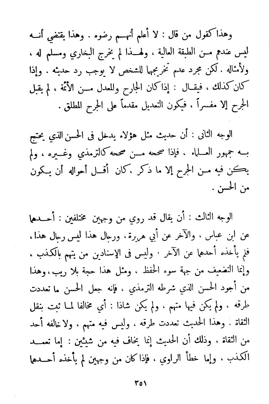 وَهَذَا كَقَوْلِ مَنْ قَالَ: لَا أَعْلَمُ أَنَّهُمْ رَضُوهُ، وَهَذَا يَقْتَضِي أَنَّهُ لَيْسَ عِنْدَهُمْ مِنْ الطَّبَقَةِ الْعَالِيَةِ وَلِهَذَا لَمْ يُخَرِّجْ الْبُخَارِيُّ وَمُسْلِمٌ لَهُ وَلِأَمْثَالِهِ، لَكِنَّ مُجَرَّدَ عَدَمِ تَخْرِيجِهِمَا لِلشَّخْصِ لَا يُوجِبُ رَدَّ حَدِيثِهِ، وَإِذَا كَانَ كَذَلِكَ فَيُقَالُ: إذَا كَانَ الْجَارِحُ وَالْمُعَدِّلُ مِنْ الْأَئِمَّةِ لَمْ يُقْبَلْ الْجَرْحُ إلَّا مُفَسَّرًا فَيَكُونُ التَّعْدِيلُ مُقَدَّمًا عَلَى الْجَرْحِ الْمُطْلَقِ. الْوَجْهُ الثَّانِي: أَنَّ حَدِيثَ مِثْلِ هَؤُلَاءِ يَدْخُلُ فِي الْحَسَنِ الَّذِي يَحْتَجُّ بِهِ جُمْهُورُ الْعُلَمَاءِ فَإِذَا صَحَّحَهُ مَنْ صَحَّحَهُ كَالتِّرْمِذِيِّ وَغَيْرِهِ وَلَمْ يَكُنْ فِيهِ مِنْ الْجَرْحِ إلَّا مَا ذُكِرَ كَانَ أَقَلَّ أَحْوَالِهِ أَنْ يَكُونَ مِنْ الْحَسَنِ. الْوَجْهُ الثَّالِثُ: أَنْ يُقَالَ قَدْ رُوِيَ مِنْ وَجْهَيْنِ مُخْتَلِفَيْنِ: أَحَدُهُمَا عَنْ ابْنِ عَبَّاسٍ وَالْآخَرُ عَنْ أَبِي هُرَيْرَةَ وَرِجَالُ هَذَا لَيْسَ رِجَالَ هَذَا فَلَمْ يَأْخُذْهُ أَحَدُهُمَا عَنْ الْآخَرِ وَلَيْسَ فِي الْإِسْنَادَيْنِ مَنْ يُتَّهَمُ بِالْكَذِبِ وَإِنَّمَا التَّضْعِيفُ مِنْ جِهَةِ سُوءِ الْحِفْظِ وَمِثْلُ هَذَا حُجَّةٌ بِلَا رَيْبٍ وَهَذَا مِنْ أَجْوَدِ الْحَسَنِ الَّذِي شَرَطَهُ التِّرْمِذِيُّ فَإِنَّهُ جَعَلَ الْحَسَنَ مَا تَعَدَّدَتْ طُرُقُهُ وَلَمْ يَكُنْ فِيهَا مُتَّهَمٌ وَلَمْ يَكُنْ شَاذًّا: أَيْ مُخَالِفًا لِمَا ثَبَتَ بِنَقْلِ الثقاة. وَهَذَا الْحَدِيثُ تَعَدَّدَتْ طُرُقُهُ وَلَيْسَ فِيهِ مُتَّهَمٌ وَلَا خَالَفَهُ أَحَدٌ مِنْ الثقاة وَذَلِكَ أَنَّ الْحَدِيثَ إنَّمَا يُخَافُ فِيهِ مِنْ شَيْئَيْنِ: إمَّا تَعَمُّدُ الْكَذِبِ وَإِمَّا خَطَأُ الرَّاوِي فَإِذَا كَانَ مِنْ وَجْهَيْنِ لَمْ يَأْخُذْهُ أَحَدُهُمَا