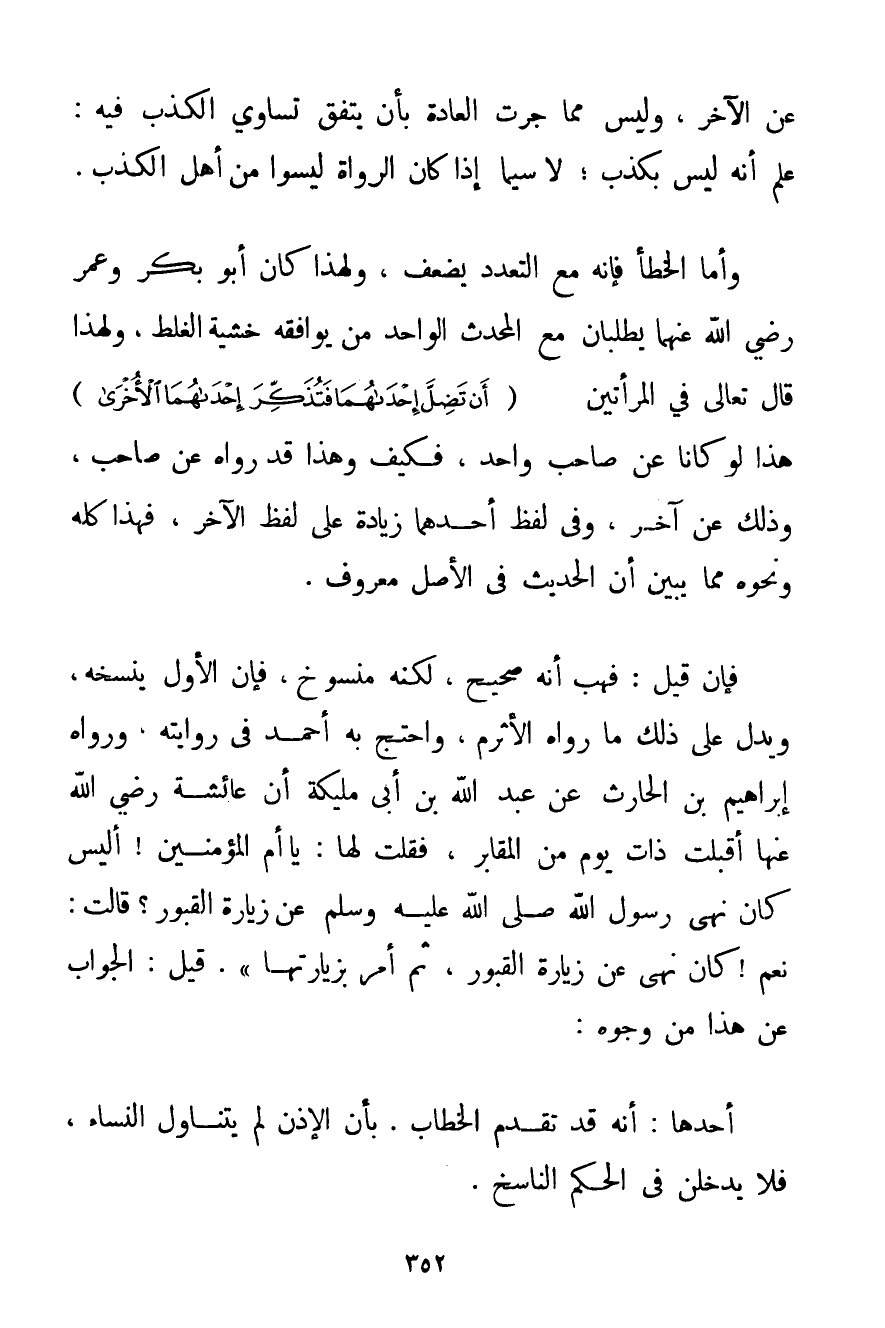 عَنْ الْآخَرِ وَلَيْسَ مِمَّا جَرَتْ الْعَادَةُ بِأَنْ يَتَّفِقَ تَسَاوِي الْكَذِبِ فِيهِ: عُلِمَ أَنَّهُ لَيْسَ بِكَذِبِ؛ لَا سِيَّمَا إذَا كَانَ الرُّوَاةُ لَيْسُوا مِنْ أَهْلِ الْكَذِبِ. وَأَمَّا الْخَطَأُ فَإِنَّهُ مَعَ التَّعَدُّدِ يَضْعُفُ وَلِهَذَا كَانَ أَبُو بَكْرٍ وَعُمَرُ رَضِيَ اللَّهُ عَنْهُمَا يَطْلُبَانِ مَعَ الْمُحَدِّثِ الْوَاحِدِ مَنْ يُوَافِقُهُ خَشْيَةَ الْغَلَطِ وَلِهَذَا قَالَ تَعَالَى فِي الْمَرْأَتَيْنِ {أَنْ تَضِلَّ إحْدَاهُمَا فَتُذَكِّرَ إحْدَاهُمَا الْأُخْرَى} هَذَا لَوْ كَانَا عَنْ صَاحِبٍ وَاحِدٍ فَكَيْفَ وَهَذَا قَدْ رَوَاهُ عَنْ صَاحِبٍ وَذَلِكَ عَنْ آخَرَ وَفِي لَفْظِ أَحَدِهِمَا زِيَادَةٌ عَلَى لَفْظِ الْآخَرِ فَهَذَا كُلُّهُ وَنَحْوُهُ مِمَّا يُبَيِّنُ أَنَّ الْحَدِيثَ فِي الْأَصْلِ مَعْرُوفٌ. فَإِنْ قِيلَ: فَهَبْ أَنَّهُ صَحِيحٌ لَكِنَّهُ مَنْسُوخٌ فَإِنَّ الْأَوَّلَ يَنْسَخُهُ وَيَدُلُّ عَلَى ذَلِكَ مَا رَوَاهُ الْأَثْرَمُ وَاحْتَجَّ بِهِ أَحْمَد فِي رِوَايَتِهِ وَرَوَاهُ إبْرَاهِيمُ بْنُ الْحَارِثِ عَنْ عَبْدِ اللَّهِ بْنِ أَبِي مُلَيْكَةَ {أَنَّ عَائِشَةَ رَضِيَ اللَّهُ عَنْهَا أَقْبَلَتْ ذَاتَ يَوْمٍ مِنْ الْمَقَابِرِ فَقُلْت لَهَا: يَا أُمَّ الْمُؤْمِنِينَ أَلَيْسَ كَانَ نَهَى رَسُولُ اللَّهِ صَلَّى اللَّهُ عَلَيْهِ وَسَلَّمَ عَنْ زِيَارَةِ الْقُبُورِ؟ قَالَتْ: نَعَمْ كَانَ نَهَى عَنْ زِيَارَةِ الْقُبُورِ ثُمَّ أَمَرَ بِزِيَارَتِهَا} . قِيلَ: الْجَوَابُ عَنْ هَذَا مِنْ وُجُوهٍ: أَحَدُهَا: أَنَّهُ قَدْ تَقَدَّمَ الْخِطَابُ بِأَنَّ الْإِذْنَ لَمْ يَتَنَاوَلْ النِّسَاءَ فَلَا يَدْخُلْنَ فِي الْحُكْمِ النَّاسِخِ.