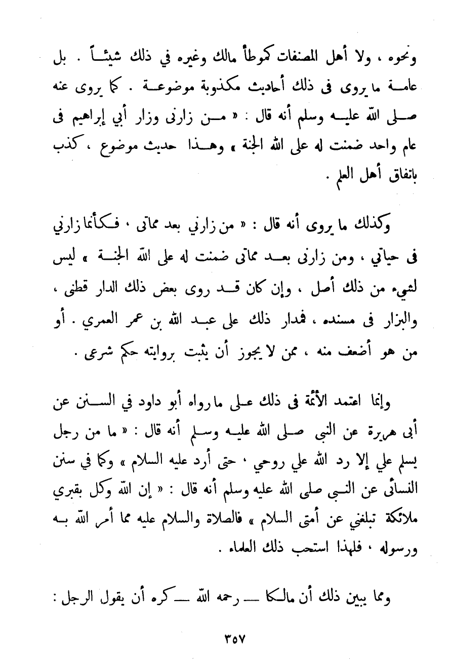 وَنَحْوِهِ وَلَا أَهْلُ الْمُصَنَّفَاتِ كَمُوَطَّأِ مَالِكٍ وَغَيْرِهِ فِي ذَلِكَ شَيْئًا بَلْ عَامَّةُ مَا يُرْوَى فِي ذَلِكَ أَحَادِيثُ مَكْذُوبَةٌ مَوْضُوعَةٌ، كَمَا يُرْوَى عَنْهُ صَلَّى اللَّهُ عَلَيْهِ وَسَلَّمَ أَنَّهُ قَالَ: {مَنْ زَارَنِي وَزَارَ أَبِي إبْرَاهِيمَ فِي عَامٍ وَاحِدٍ ضَمِنْت لَهُ عَلَى اللَّهِ الْجَنَّةَ} وَهَذَا حَدِيثٌ مَوْضُوعٌ كَذِبٌ بِاتِّفَاقِ أَهْلِ الْعِلْمِ. وَكَذَلِكَ مَا يُرْوَى أَنَّهُ قَالَ: {مَنْ زَارَنِي بَعْدَ مَمَاتِي فَكَأَنَّمَا زَارَنِي فِي حَيَاتِي وَمَنْ زَارَنِي بَعْدَ مَمَاتِي ضَمِنْت لَهُ عَلَى اللَّهِ الْجَنَّةَ} لَيْسَ لِشَيْءٍ مِنْ ذَلِكَ أَصْلٌ وَإِنْ كَانَ قَدْ رَوَى بَعْضَ ذَلِكَ الدارقطني وَالْبَزَّارُ فِي مُسْنَدِهِ فَمَدَارُ ذَلِكَ عَلَى عَبْدِ اللَّهِ بْنِ عُمَرَ الْعُمَرِيِّ، أَوْ مَنْ هُوَ أَضْعَفُ مِنْهُ مِمَّنْ لَا يَجُوزُ أَنْ يَثْبُتَ بِرِوَايَتِهِ حُكْمٌ شَرْعِيٌّ. وَإِنَّمَا اعْتَمَدَ الْأَئِمَّةُ فِي ذَلِكَ عَلَى مَا رَوَاهُ أَبُو دَاوُد فِي السُّنَنِ عَنْ أَبِي هُرَيْرَةَ عَنْ النَّبِيِّ صَلَّى اللَّهُ عَلَيْهِ وَسَلَّمَ أَنَّهُ قَالَ: {مَا مِنْ رَجُلٍ يُسَلِّمُ عَلَيَّ إلَّا رَدَّ اللَّهُ عَلَيَّ رُوحِي حَتَّى أَرُدَّ عَلَيْهِ السَّلَامَ} وَكَمَا فِي سُنَنِ النَّسَائِي عَنْ النَّبِيِّ صَلَّى اللَّهُ عَلَيْهِ وَسَلَّمَ أَنَّهُ قَالَ: {إنَّ اللَّهَ وَكَّلَ بِقَبْرِي مَلَائِكَةً تُبَلِّغُنِي عَنْ أُمَّتِي السَّلَامَ} فَالصَّلَاةُ وَالسَّلَامُ عَلَيْهِ مِمَّا أَمَرَ اللَّهُ بِهِ وَرَسُولُهُ فَلِهَذَا اسْتَحَبَّ ذَلِكَ الْعُلَمَاءُ. وَمِمَّا يُبَيِّنُ ذَلِكَ أَنَّ مَالِكًا - رَحِمَهُ اللَّهُ - كَرِهَ أَنْ يَقُولَ الرَّجُلُ: