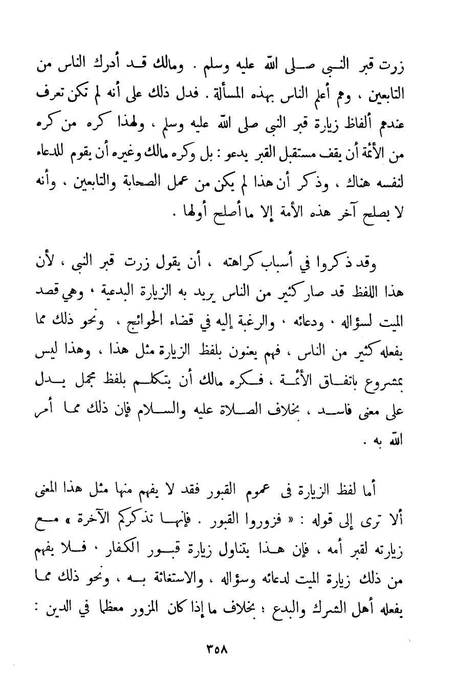 زُرْت قَبْرَ النَّبِيِّ صَلَّى اللَّهُ عَلَيْهِ وَسَلَّمَ وَمَالِكٌ قَدْ أَدْرَكَ النَّاسَ مِنْ التَّابِعِينَ وَهُمْ أَعْلَمُ النَّاسِ بِهَذِهِ الْمَسْأَلَةِ، فَدَلَّ ذَلِكَ عَلَى أَنَّهُ لَمْ تَكُنْ تُعْرَفُ عِنْدَهُمْ أَلْفَاظُ زِيَارَةِ قَبْرِ النَّبِيِّ صَلَّى اللَّهُ عَلَيْهِ وَسَلَّمَ وَلِهَذَا كَرِهَ مَنْ كَرِهَ مِنْ الْأَئِمَّةِ أَنْ يَقِفَ مُسْتَقْبِلَ الْقَبْرِ يَدْعُو: بَلْ وَكَرِهَ مَالِكٌ وَغَيْرُهُ أَنْ يَقُومَ لِلدُّعَاءِ لِنَفْسِهِ هُنَاكَ وَذَكَرَ أَنَّ هَذَا لَمْ يَكُنْ مِنْ عَمَلِ الصَّحَابَةِ وَالتَّابِعِينَ وَأَنَّهُ لَا يُصْلِحُ آخِرَ هَذِهِ الْأُمَّةِ إلَّا مَا أَصْلَحَ أَوَّلَهَا. وَقَدْ ذَكَرُوا فِي أَسْبَابِ كَرَاهَتِهِ أَنْ يَقُولَ زُرْت قَبْرَ النَّبِيِّ لِأَنَّ هَذَا اللَّفْظَ قَدْ صَارَ كَثِيرٌ مِنْ النَّاسِ يُرِيدُ بِهِ الزِّيَارَةَ الْبِدْعِيَّةَ وَهِيَ قَصْدُ الْمَيِّتِ لِسُؤَالِهِ وَدُعَائِهِ وَالرَّغْبَةِ إلَيْهِ فِي قَضَاءِ الْحَوَائِجِ وَنَحْوِ ذَلِكَ مِمَّا يَفْعَلُهُ كَثِيرٌ مِنْ النَّاسِ فَهُمْ يَعْنُونَ بِلَفْظِ الزِّيَارَةِ مِثْلَ هَذَا وَهَذَا لَيْسَ بِمَشْرُوعٍ بِاتِّفَاقِ الْأَئِمَّةِ فَكَرِهَ مَالِكٌ أَنْ يُتَكَلَّمَ بِلَفْظٍ مُجْمَلٍ يَدُلُّ عَلَى مَعْنًى فَاسِدٍ بِخِلَافِ الصَّلَاةِ عَلَيْهِ وَالسَّلَامِ فَإِنَّ ذَلِكَ مِمَّا أَمَرَ اللَّهُ بِهِ. أَمَّا لَفْظُ الزِّيَارَةِ فِي عُمُومِ الْقُبُورِ فَقَدْ لَا يُفْهَمُ مِنْهَا مِثْلُ هَذَا الْمَعْنَى أَلَا تَرَى إلَى قَوْلِهِ: {فَزُورُوا الْقُبُورَ. فَإِنَّهَا تُذَكِّرُكُمْ الْآخِرَةَ} مَعَ زِيَارَتِهِ لِقَبْرِ أُمِّهِ فَإِنَّ هَذَا يَتَنَاوَلُ زِيَارَةَ قُبُورِ الْكُفَّارِ فَلَا يُفْهَمُ مِنْ ذَلِكَ زِيَارَةُ الْمَيِّتِ لِدُعَائِهِ وَسُؤَالِهِ وَالِاسْتِغَاثَةِ بِهِ وَنَحْوِ ذَلِكَ مِمَّا يَفْعَلُهُ أَهْلُ الشِّرْكِ وَالْبِدَعِ؛ بِخِلَافِ مَا إذَا كَانَ الْمَزُورُ مُعَظَّمًا فِي الدِّينِ: