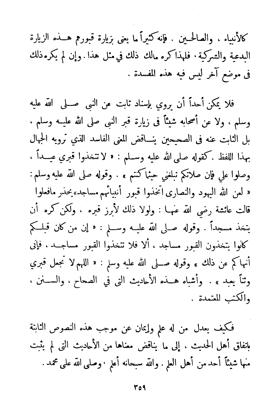 كَالْأَنْبِيَاءِ وَالصَّالِحِينَ، فَإِنَّهُ كَثِيرًا مَا يَعْنِي بِزِيَارَةِ قُبُورِهِمْ هَذِهِ الزِّيَارَةَ الْبِدْعِيَّةَ وَالشَّرِكِيَّةَ فَلِهَذَا كَرِهَ مَالِكٌ ذَلِكَ فِي مِثْلِ هَذَا، وَإِنْ لَمْ يَكْرَهْ ذَلِكَ فِي مَوْضِعٍ آخَرَ لَيْسَ فِيهِ هَذِهِ الْمَفْسَدَةُ. فَلَا يُمْكِنُ أَحَدًا أَنْ يَرْوِيَ بِإِسْنَادٍ ثَابِتٍ عَنْ النَّبِيِّ صَلَّى اللَّهُ عَلَيْهِ وَسَلَّمَ وَلَا عَنْ أَصْحَابِهِ شَيْئًا فِي زِيَارَةِ قَبْرِ النَّبِيِّ صَلَّى اللَّهُ عَلَيْهِ وَسَلَّمَ بَلْ الثَّابِتُ عَنْهُ فِي الصَّحِيحَيْنِ يُنَاقِضُ الْمَعْنَى الْفَاسِدَ الَّذِي تَرْوِيهِ الْجُهَّالُ بِهَذَا اللَّفْظِ. كَقَوْلِهِ صَلَّى اللَّهُ عَلَيْهِ وَسَلَّمَ {لَا تَتَّخِذُوا قَبْرِي عِيدًا وَصَلُّوا عَلَيَّ فَإِنَّ صَلَاتَكُمْ تَبْلُغُنِي حَيْثُمَا كُنْتُمْ} . وَقَوْلِهِ صَلَّى اللَّهُ عَلَيْهِ وَسَلَّمَ {لَعَنَ اللَّهُ الْيَهُودَ وَالنَّصَارَى اتَّخَذُوا قُبُورَ أَنْبِيَائِهِمْ مَسَاجِدَ} يُحَذِّرُ مَا فَعَلُوا قَالَتْ عَائِشَةُ رَضِيَ اللَّهُ عَنْهَا وَلَوْلَا ذَلِكَ لَأُبْرِزَ قَبْرُهُ وَلَكِنْ كُرِهَ أَنْ يُتَّخَذَ مَسْجِدًا. وَقَوْلِهِ صَلَّى اللَّهُ عَلَيْهِ وَسَلَّمَ {إنَّ مَنْ كَانَ قَبْلَكُمْ كَانُوا يَتَّخِذُونَ الْقُبُورَ مَسَاجِدَ أَلَا فَلَا تَتَّخِذُوا الْقُبُورَ مَسَاجِدَ فَإِنِّي أَنْهَاكُمْ عَنْ ذَلِكَ} وَقَوْلِهِ صَلَّى اللَّهُ عَلَيْهِ وَسَلَّمَ {اللَّهُمَّ لَا تَجْعَلُ قَبْرِي وَثَنًا يُعْبَدُ} . وَأَشْبَاهُ هَذِهِ الْأَحَادِيثِ الَّتِي فِي الصِّحَاحِ وَالسُّنَنِ وَالْكُتُبِ الْمُعْتَمَدَةِ. فَكَيْفَ يَعْدِلُ مَنْ لَهُ عِلْمٌ وَإِيمَانٌ عَنْ مُوجِبِ هَذِهِ النُّصُوصِ الثَّابِتَةِ بِاتِّفَاقِ أَهْلِ الْحَدِيثِ إلَى مَا يُنَاقِضُ مَعْنَاهَا مِنْ الْأَحَادِيثِ الَّتِي لَمْ يُثْبِتْ مِنْهَا شَيْئًا أَحَدٌ مِنْ أَهْلِ الْعِلْمِ، وَاَللَّهُ سُبْحَانَهُ أَعْلَمُ وَصَلَّى اللَّهُ عَلَى مُحَمَّدٍ.