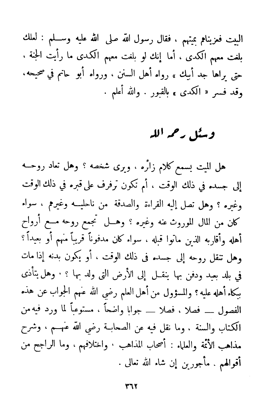 هَلْ الْمَيِّتُ يَسْمَعُ كَلَامَ زَائِرِهِ وَيَرَى شَخْصَهُ؟ وَهَلْ تُعَادُ رُوحُهُ إلَى جَسَدِهِ فِي ذَلِكَ الْوَقْتِ أَمْ تَكُونُ تُرَفْرِفُ عَلَى قَبْرِهِ فِي ذَلِكَ الْوَقْتِ وَغَيْرِهِ؟ وَهَلْ تَصِلُ إلَيْهِ الْقِرَاءَةُ وَالصَّدَقَةُ مِنْ نَاحِلِيهِ وَغَيْرِهِمْ سَوَاءٌ كَانَ مِنْ الْمَالِ الْمَوْرُوثِ عَنْهُ وَغَيْرِهِ؟ وَهَلْ تُجْمَعُ رُوحُهُ مَعَ أَرْوَاحِ أَهْلِهِ وَأَقَارِبِهِ الَّذِينَ مَاتُوا قَبْلَهُ سَوَاءٌ كَانَ مَدْفُونًا قَرِيبًا مِنْهُمْ أَوْ بَعِيدًا؟ وَهَلْ تُنْقَلُ رُوحُهُ إلَى جَسَدِهِ فِي ذَلِكَ الْوَقْتِ أَوْ يَكُونُ بَدَنُهُ إذَا مَاتَ فِي بَلَدٍ بَعِيدٍ وَدُفِنَ بِهَا يُنْقَلُ إلَى الْأَرْضِ الَّتِي وُلِدَ بِهَا؟ وَهَلْ يَتَأَذَّى بِبُكَاءِ أَهْلِهِ عَلَيْهِ؟ وَالْمَسْئُولُ مِنْ أَهْلِ الْعِلْمِ رَضِيَ اللَّهُ عَنْهُمْ الْجَوَابَ عَنْ هَذِهِ الْفُصُولِ - فَصْلًا فَصْلًا - جَوَابًا وَاضِحًا مُسْتَوْعِبًا لِمَا وَرَدَ فِيهِ مِنْ الْكِتَابِ وَالسُّنَّةِ وَمَا نُقِلَ فِيهِ عَنْ الصَّحَابَةِ رَضِيَ اللَّهُ عَنْهُمْ وَشَرْحَ مَذَاهِبِ الْأَئِمَّةِ وَالْعُلَمَاءِ: أَصْحَابِ الْمَذَاهِبِ وَاخْتِلَافِهِمْ وَمَا الرَّاجِحُ مِنْ أَقْوَالِهِمْ مَأْجُورِينَ إنْ شَاءَ اللَّهُ تَعَالَى.