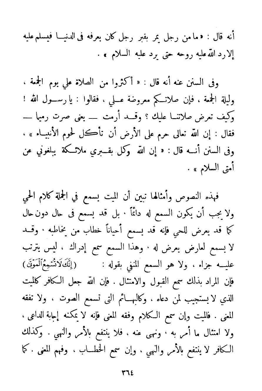 أَنَّهُ قَالَ: {مَا مِنْ رَجُلٍ يَمُرُّ بِقَبْرِ رَجُلٍ كَانَ يَعْرِفُهُ فِي الدُّنْيَا فَيُسَلِّمُ عَلَيْهِ إلَّا رَدَّ اللَّهُ عَلَيْهِ رُوحَهُ حَتَّى يَرُدَّ عَلَيْهِ السَّلَامَ.} . وَفِي السُّنَنِ عَنْهُ أَنَّهُ قَالَ: {أَكْثِرُوا مِنْ الصَّلَاةِ عَلَيَّ يَوْمَ الْجُمُعَةِ وَلَيْلَةَ الْجُمُعَةِ فَإِنَّ صَلَاتَكُمْ مَعْرُوضَةٌ عَلَيَّ فَقَالُوا: يَا رَسُولَ اللَّهِ وَكَيْفَ تُعْرَضُ صَلَاتُنَا عَلَيْك؟ وَقَدْ أَرَمْت - يَعْنِي صِرْت رَمِيمًا - فَقَالَ: إنَّ اللَّهَ تَعَالَى حَرَّمَ عَلَى الْأَرْضِ أَنْ تَأْكُلَ لُحُومَ الْأَنْبِيَاءِ} وَفِي السُّنَنِ أَنَّهُ قَالَ: {إنَّ اللَّهَ وَكَّلَ بِقَبْرِي مَلَائِكَةً يُبَلِّغُونِي عَنْ أُمَّتِي السَّلَامَ.} . فَهَذِهِ النُّصُوصُ وَأَمْثَالُهَا تُبَيِّنُ أَنَّ الْمَيِّتَ يَسْمَعُ فِي الْجُمْلَةِ كَلَامَ الْحَيِّ وَلَا يَجِبُ أَنْ يَكُونَ السَّمْعُ لَهُ دَائِمًا بَلْ قَدْ يَسْمَعُ فِي حَالٍ دُونَ حَالٍ كَمَا قَدْ يَعْرِضُ لِلْحَيِّ فَإِنَّهُ قَدْ يَسْمَعُ أَحْيَانًا خِطَابَ مَنْ يُخَاطِبُهُ وَقَدْ لَا يَسْمَعُ لِعَارِضٍ يَعْرِضُ لَهُ وَهَذَا السَّمْعُ سَمْعُ إدْرَاكٍ لَيْسَ يَتَرَتَّبُ عَلَيْهِ جَزَاءٌ وَلَا هُوَ السَّمْعُ الْمَنْفِيُّ بِقَوْلِهِ: {إنَّكَ لَا تُسْمِعُ الْمَوْتَى} فَإِنَّ الْمُرَادَ بِذَلِكَ سَمْعُ الْقَبُولِ وَالِامْتِثَالِ، فَإِنَّ اللَّهَ جَعَلَ الْكَافِرَ كَالْمَيِّتِ الَّذِي لَا يَسْتَجِيبُ لِمَنْ دَعَاهُ وَكَالْبَهَائِمِ الَّتِي تَسْمَعُ الصَّوْتَ وَلَا تَفْقَهُ الْمَعْنَى، فَالْمَيِّتُ وَإِنْ سَمِعَ الْكَلَامَ وَفَقِهَ الْمَعْنَى فَإِنَّهُ لَا يُمْكِنُهُ إجَابَةُ الدَّاعِي وَلَا امْتِثَالُ مَا أَمَرَ بِهِ وَنَهَى عَنْهُ فَلَا يَنْتَفِعُ بِالْأَمْرِ وَالنَّهْيِ، وَكَذَلِكَ الْكَافِرُ لَا يَنْتَفِعُ بِالْأَمْرِ وَالنَّهْيِ وَإِنْ سَمِعَ الْخِطَابَ وَفَهِمَ الْمَعْنَى، كَمَا