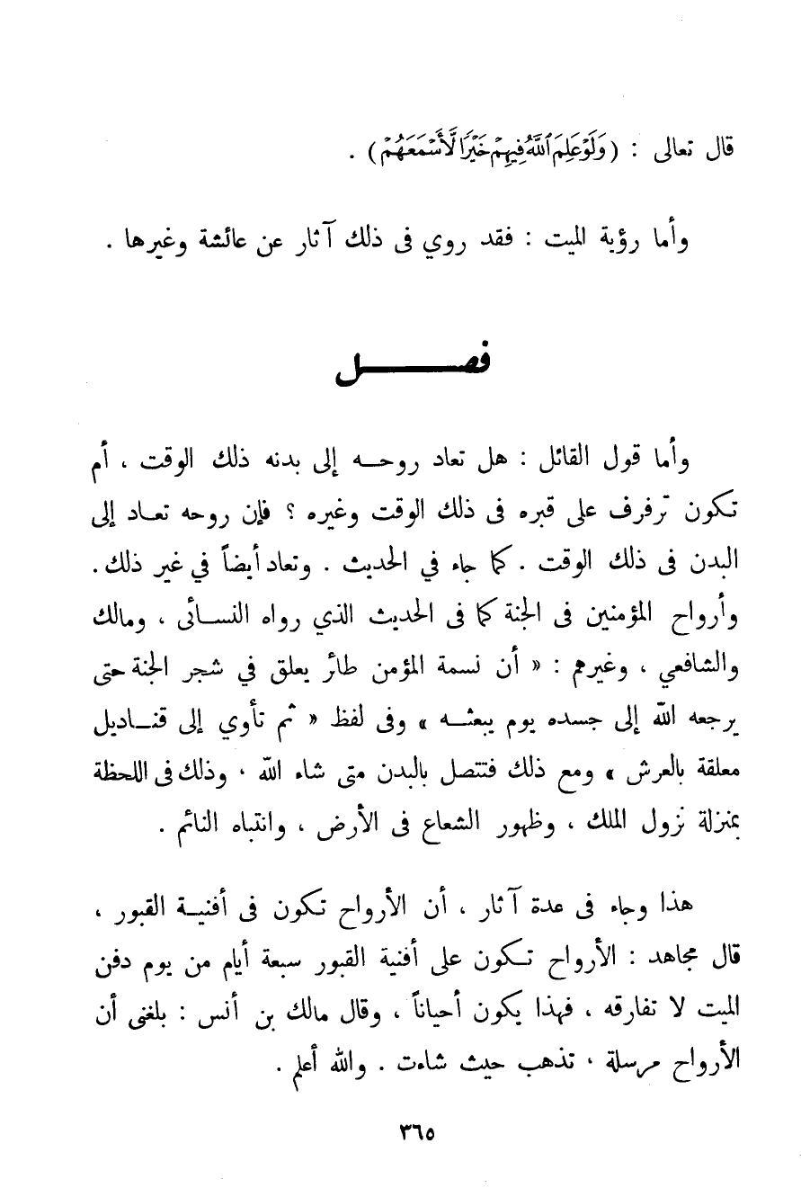قَالَ تَعَالَى: {وَلَوْ عَلِمَ اللَّهُ فِيهِمْ خَيْرًا لَأَسْمَعَهُمْ.} . وَأَمَّا رُؤْيَةُ الْمَيِّتِ: فَقَدْ رُوِيَ فِي ذَلِكَ آثَارٌ عَنْ عَائِشَةَ وَغَيْرِهَا.