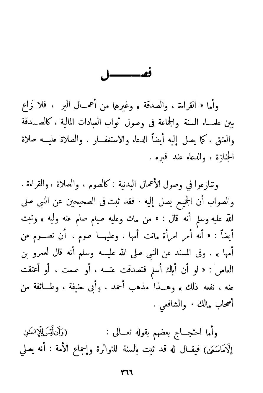 وَأَمَّا " الْقِرَاءَةُ وَالصَّدَقَةُ " وَغَيْرُهُمَا مِنْ أَعْمَالِ الْبِرِّ فَلَا نِزَاعَ بَيْنَ عُلَمَاءِ السُّنَّةِ وَالْجَمَاعَةِ فِي وُصُولِ ثَوَابِ الْعِبَادَاتِ الْمَالِيَّةِ كَالصَّدَقَةِ وَالْعِتْقِ كَمَا يَصِلُ إلَيْهِ أَيْضًا الدُّعَاءُ وَالِاسْتِغْفَارُ وَالصَّلَاةُ عَلَيْهِ صَلَاةُ الْجِنَازَةِ وَالدُّعَاءُ عِنْدَ قَبْرِهِ. وَتَنَازَعُوا فِي وُصُولِ الْأَعْمَالِ الْبَدَنِيَّةِ: كَالصَّوْمِ وَالصَّلَاةِ وَالْقِرَاءَةِ. وَالصَّوَابُ أَنَّ الْجَمِيعَ يَصِلُ إلَيْهِ فَقَدْ ثَبَتَ فِي الصَّحِيحَيْنِ عَنْ النَّبِيِّ صَلَّى اللَّهُ عَلَيْهِ وَسَلَّمَ أَنَّهُ قَالَ: {مَنْ مَاتَ وَعَلَيْهِ صِيَامٌ صَامَ عَنْهُ وَلِيُّهُ} وَثَبَتَ أَيْضًا: {أَنَّهُ أَمَرَ امْرَأَةً مَاتَتْ أُمُّهَا وَعَلَيْهَا صَوْمٌ أَنْ تَصُومَ عَنْ أُمِّهَا} . وَفِي الْمُسْنَدِ عَنْ النَّبِيِّ صَلَّى اللَّهُ عَلَيْهِ وَسَلَّمَ أَنَّهُ قَالَ لِعَمْرِو بْنِ العاص: {لَوْ أَنَّ أَبَاك أَسْلَمَ فَتَصَدَّقْت عَنْهُ أَوْ صُمْت أَوْ أَعْتَقْت عَنْهُ نَفَعَهُ ذَلِكَ} وَهَذَا مَذْهَبُ أَحْمَد وَأَبِي حَنِيفَةَ وَطَائِفَةٍ مِنْ أَصْحَابِ مَالِكٍ وَالشَّافِعِيِّ. وَأَمَّا احْتِجَاجُ بَعْضِهِمْ بِقَوْلِهِ تَعَالَى: {وَأَنْ لَيْسَ لِلْإِنْسَانِ إلَّا مَا سَعَى} فَيُقَالُ لَهُ قَدْ ثَبَتَ بِالسُّنَّةِ الْمُتَوَاتِرَةِ وَإِجْمَاعِ الْأُمَّةِ: أَنَّهُ يُصَلَّى