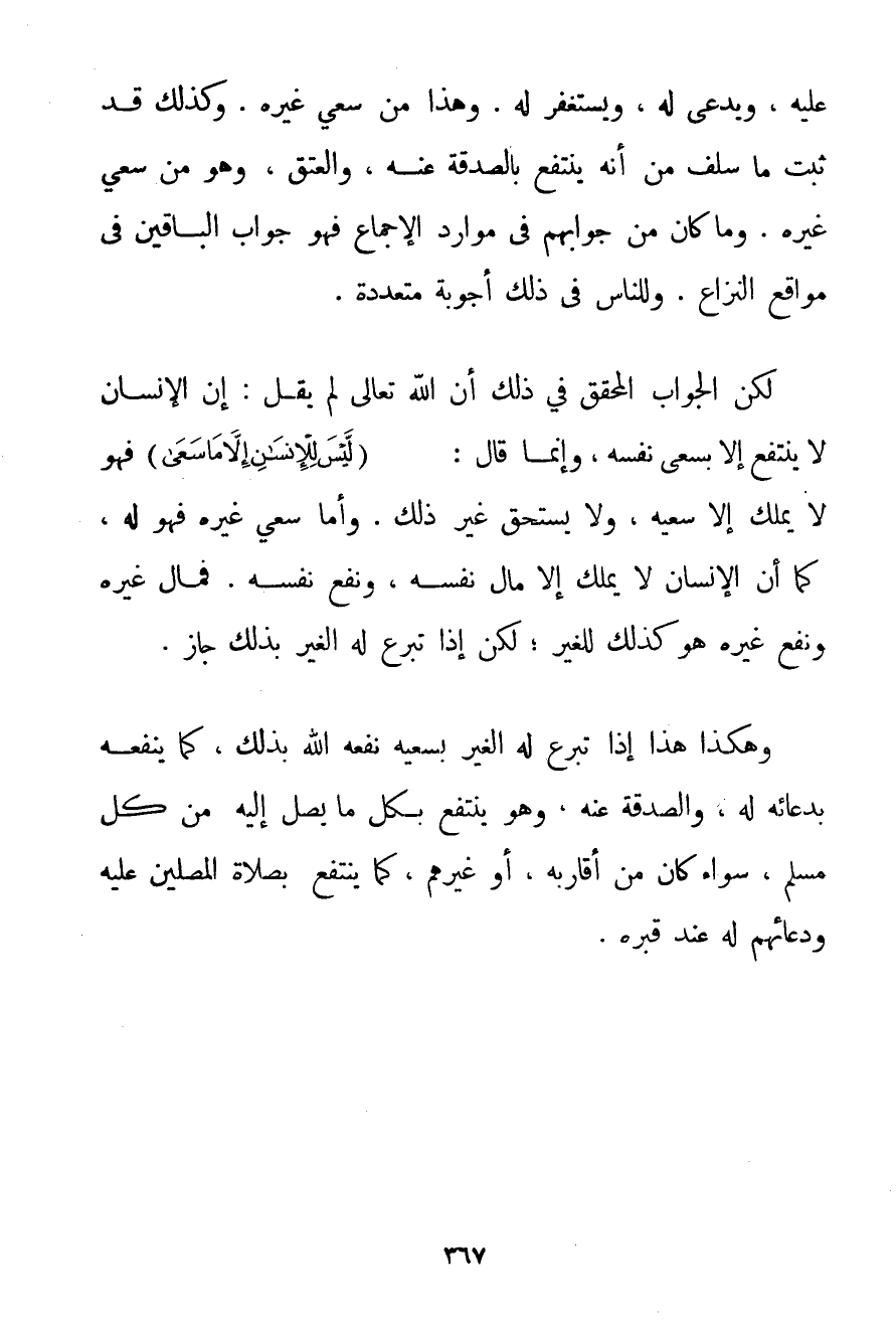 عَلَيْهِ وَيُدْعَى لَهُ وَيُسْتَغْفَرُ لَهُ، وَهَذَا مِنْ سَعْيِ غَيْرِهِ، وَكَذَلِكَ قَدْ ثَبَتَ مَا سَلَفَ مِنْ أَنَّهُ يَنْتَفِعُ بِالصَّدَقَةِ عَنْهُ وَالْعِتْقِ وَهُوَ مِنْ سَعْيِ غَيْرِهِ، وَمَا كَانَ مِنْ جَوَابِهِمْ فِي مَوَارِدِ الْإِجْمَاعِ فَهُوَ جَوَابُ الْبَاقِينَ فِي مَوَاقِعِ النِّزَاعِ. وَلِلنَّاسِ فِي ذَلِكَ أَجْوِبَةٌ مُتَعَدِّدَةٌ. لَكِنَّ الْجَوَابَ الْمُحَقَّقَ فِي ذَلِكَ أَنَّ اللَّهَ تَعَالَى لَمْ يَقُلْ: إنَّ الْإِنْسَانَ لَا يَنْتَفِعُ إلَّا بِسَعْيِ نَفْسِهِ وَإِنَّمَا قَالَ: {لَيْسَ لِلْإِنْسَانِ إلَّا مَا سَعَى} فَهُوَ لَا يَمْلِكُ إلَّا سَعْيَهُ وَلَا يَسْتَحِقُّ غَيْرَ ذَلِكَ. وَأَمَّا سَعْيُ غَيْرِهِ فَهُوَ لَهُ كَمَا أَنَّ الْإِنْسَانَ لَا يَمْلِكُ إلَّا مَالَ نَفْسِهِ وَنَفْعَ نَفْسِهِ، فَمَالُ غَيْرِهِ وَنَفْعُ غَيْرِهِ هُوَ كَذَلِكَ لِلْغَيْرِ؛ لَكِنْ إذَا تَبَرَّعَ لَهُ الْغَيْرُ بِذَلِكَ جَازَ. وَهَكَذَا هَذَا إذَا تَبَرَّعَ لَهُ الْغَيْرُ بِسَعْيِهِ نَفَعَهُ اللَّهُ بِذَلِكَ كَمَا يَنْفَعُهُ بِدُعَائِهِ لَهُ وَالصَّدَقَةِ عَنْهُ وَهُوَ يَنْتَفِعُ بِكُلِّ مَا يَصِلُ إلَيْهِ مِنْ كُلِّ مُسْلِمٍ سَوَاءٌ كَانَ مِنْ أَقَارِبِهِ أَوْ غَيْرِهِمْ كَمَا يَنْتَفِعُ بِصَلَاةِ الْمُصَلِّينَ عَلَيْهِ وَدُعَائِهِمْ لَهُ عِنْدَ قَبْرِهِ.