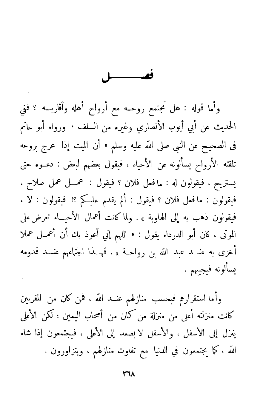 وَأَمَّا قَوْلُهُ: هَلْ تَجْتَمِعُ رُوحُهُ مَعَ أَرْوَاحِ أَهْلِهِ وَأَقَارِبِهِ؟ فَفِي الْحَدِيثِ عَنْ أبي أيوب الأنصاري وغيره من السلف ورواه أبو حاتم في الصحيح عن النبي صَلَّى اللَّهُ عَلَيْهِ وَسَلَّمَ {أَنَّ الْمَيِّتَ إذَا عُرِجَ بِرُوحِهِ تَلَقَّتْهُ الْأَرْوَاحُ يَسْأَلُونَهُ عَنْ الْأَحْيَاءِ فَيَقُولُ بَعْضُهُمْ لِبَعْضِ: دَعُوهُ حَتَّى يَسْتَرِيحَ فَيَقُولُونَ لَهُ: مَا فَعَلَ فُلَانٌ؟ فَيَقُولُ: عَمِلَ عَمَلَ صَلَاحٍ فَيَقُولُونَ: مَا فَعَلَ فُلَانٌ؟ فَيَقُولُ: أَلَمْ يَقْدَمْ عَلَيْكُمْ فَيَقُولُونَ: لَا فَيَقُولُونَ ذُهِبَ بِهِ إلَى الْهَاوِيَةِ} . وَلَمَّا كَانَتْ أَعْمَالُ الْأَحْيَاءِ تُعْرَضُ عَلَى الْمَوْتَى كَانَ أَبُو الدَّرْدَاءِ يَقُولُ: " اللَّهُمَّ إنِّي أَعُوذُ بِك أَنْ أَعْمَلَ عَمَلًا أُخْزَى بِهِ عِنْدَ عَبْدِ اللَّهِ بْنِ رَوَاحَةَ ". فَهَذَا اجْتِمَاعُهُمْ عِنْدَ قُدُومِهِ يَسْأَلُونَهُ فَيُجِيبُهُمْ. وَمَا اسْتِقْرَارُهُمْ فَبِحَسَبِ مَنَازِلِهِمْ عِنْدَ اللَّهِ فَمَنْ كَانَ مِنْ الْمُقَرَّبِينَ كَانَتْ مَنْزِلَتُهُ أَعْلَى مِنْ مَنْزِلَةِ مَنْ كَانَ مِنْ أَصْحَابِ الْيَمِينِ؛ لَكِنَّ الْأَعْلَى يَنْزِلُ إلَى الْأَسْفَلِ وَالْأَسْفَلَ لَا يَصْعَدُ إلَى الْأَعْلَى فَيَجْتَمِعُونَ إذَا شَاءَ اللَّهُ كَمَا يَجْتَمِعُونَ فِي الدُّنْيَا مَعَ تَفَاوُتِ مَنَازِلِهِمْ وَيَتَزَاوَرُونَ.