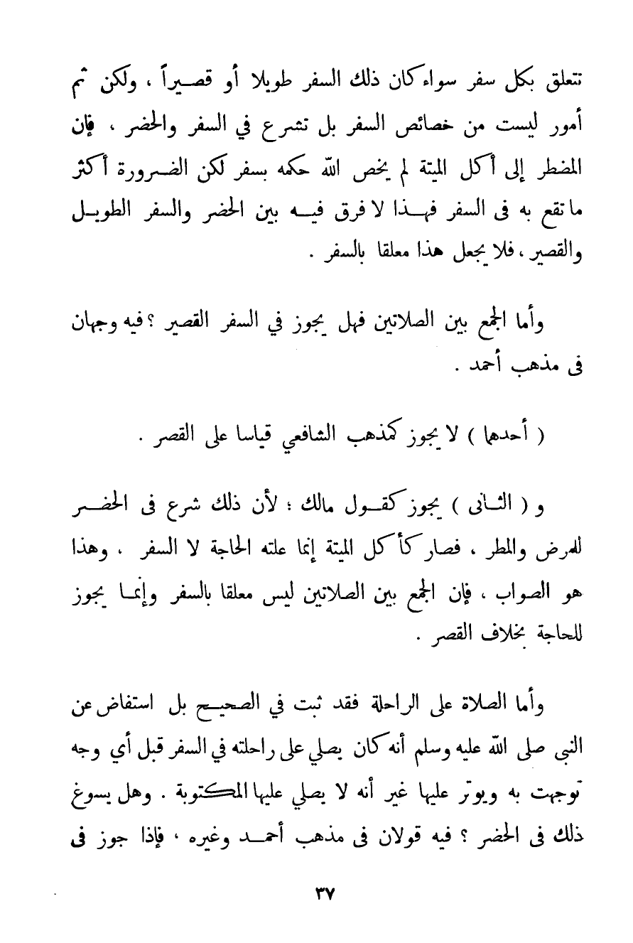تَتَعَلَّقُ بِكُلِّ سَفَرٍ سَوَاءٌ كَانَ ذَلِكَ السَّفَرُ طَوِيلًا أَوْ قَصِيرًا وَلَكِنْ ثَمَّ أُمُورٌ لَيْسَتْ مِنْ خَصَائِصِ السَّفَرِ بَلْ تُشْرَعُ فِي السَّفَرِ وَالْحَضَرِ فَإِنَّ الْمُضْطَرَّ إلَى أَكْلِ الْمَيْتَةِ لَمْ يَخُصَّ اللَّهُ حُكْمَهُ بِسَفَرٍ لَكِنَّ الضَّرُورَةَ أَكْثَرُ مَا تَقَعُ بِهِ فِي السَّفَرِ فَهَذَا لَا فَرْقَ فِيهِ بَيْنَ الْحَضَرِ وَالسَّفَرِ الطَّوِيلِ وَالْقَصِيرِ فَلَا يُجْعَلُ هَذَا مُعَلَّقًا بِالسَّفَرِ. وَأَمَّا الْجَمْعُ بَيْنَ الصَّلَاتَيْنِ فَهَلْ يَجُوزُ فِي السَّفَرِ الْقَصِيرِ؟ فِيهِ وَجْهَانِ فِي مَذْهَبِ أَحْمَد. (أَحَدُهُمَا لَا يَجُوزُ كَمَذْهَبِ الشَّافِعِيِّ قِيَاسًا عَلَى الْقَصْرِ. وَ (الثَّانِي يَجُوزُ كَقَوْلِ مَالِكٍ؛ لِأَنَّ ذَلِكَ شُرِعَ فِي الْحَضَرِ لِلْمَرَضِ وَالْمَطَرِ فَصَارَ كَأَكْلِ الْمَيْتَةِ إنَّمَا عِلَّتُهُ الْحَاجَةُ لَا السَّفَرُ وَهَذَا هُوَ الصَّوَابُ فَإِنَّ الْجَمْعَ بَيْنَ الصَّلَاتَيْنِ لَيْسَ مُعَلَّقًا بِالسَّفَرِ وَإِنَّمَا يَجُوزُ لِلْحَاجَةِ بِخِلَافِ الْقَصْرِ. وَأَمَّا الصَّلَاةُ عَلَى الرَّاحِلَةِ فَقَدْ ثَبَتَ فِي الصَّحِيحِ بَلْ {اسْتَفَاضَ عَنْ النَّبِيِّ صَلَّى اللَّهُ عَلَيْهِ وَسَلَّمَ أَنَّهُ كَانَ يُصَلِّي عَلَى رَاحِلَتِهِ فِي السَّفَرِ قِبَلَ أَيِّ وَجْهٍ تَوَجَّهَتْ بِهِ وَيُوتِرُ عَلَيْهَا غَيْرَ أَنَّهُ لَا يُصَلِّي عَلَيْهَا الْمَكْتُوبَةَ} . وَهَلْ يَسُوغُ ذَلِكَ فِي الْحَضَرِ؟ فِيهِ قَوْلَانِ فِي مَذْهَبِ أَحْمَد وَغَيْرِهِ فَإِذَا جُوِّزَ