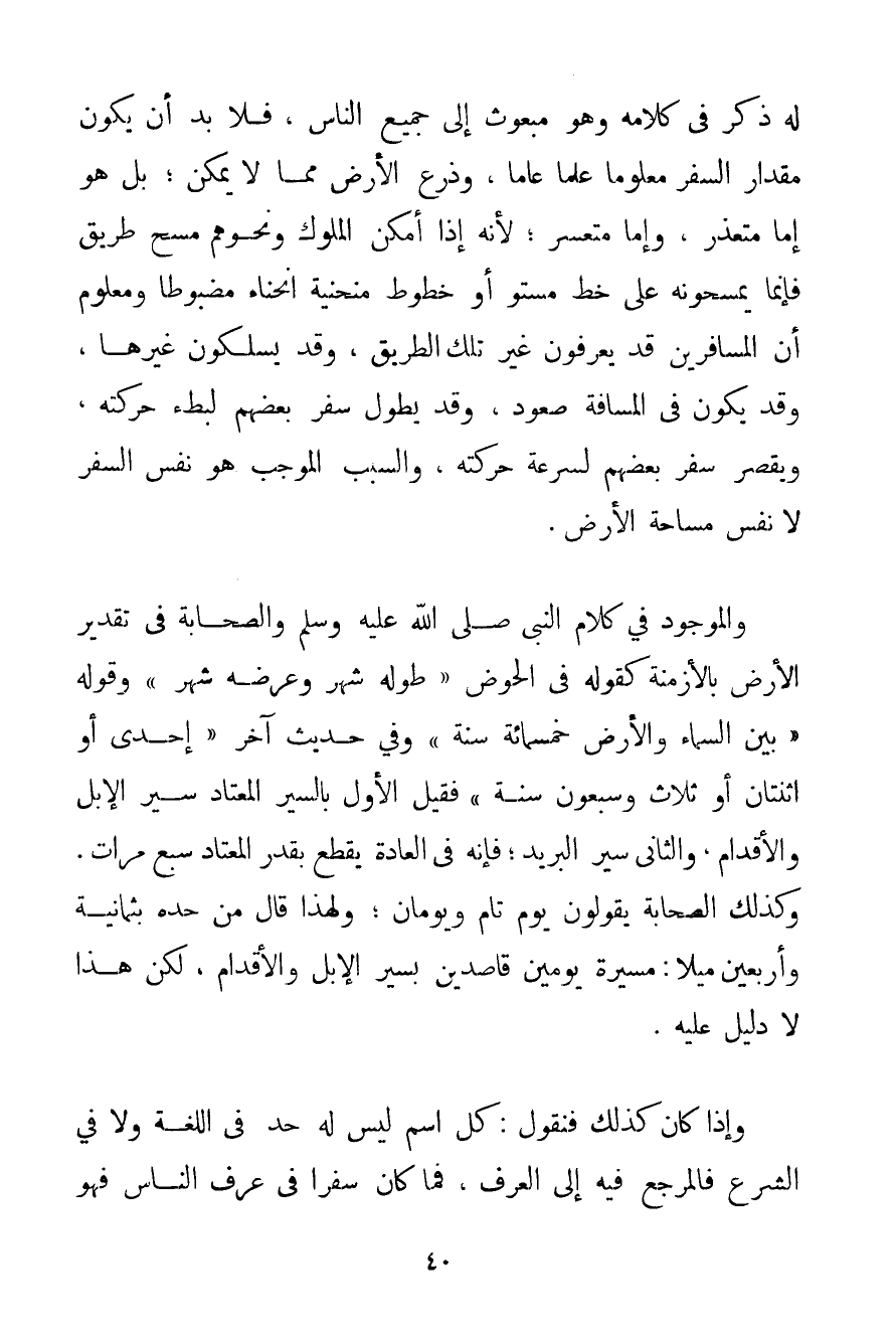 لَهُ ذِكْرٌ فِي كَلَامِهِ وَهُوَ مَبْعُوثٌ إلَى جَمِيعِ النَّاسِ فَلَا بُدَّ أَنْ يَكُونَ مِقْدَارُ السَّفَرِ مَعْلُومًا عِلْمًا عَامًّا وَذَرْعُ الْأَرْضِ مِمَّا لَا يُمْكِنُ؛ بَلْ هُوَ إمَّا مُتَعَذَّرٌ وَإِمَّا مُتَعَسِّرٌ؛ لِأَنَّهُ إذَا أَمْكَنَ الْمُلُوكَ وَنَحْوَهُمْ مَسْحُ طَرِيقٍ فَإِنَّمَا يَمْسَحُونَهُ عَلَى خَطٍّ مُسْتَوٍ أَوْ خُطُوطٍ مُنْحَنِيَةٍ انْحِنَاءً مَضْبُوطًا وَمَعْلُومٌ أَنَّ الْمُسَافِرِينَ قَدْ يَعْرِفُونَ غَيْرَ تِلْكَ الطَّرِيقِ وَقَدْ يَسْلُكُونَ غَيْرَهَا وَقَدْ يَكُونُ فِي الْمَسَافَةِ صُعُودٌ وَقَدْ يَطُولُ سَفَرُ بَعْضِهِمْ لِبُطْءِ حَرَكَتِهِ وَيَقْصُرُ سَفَرُ بَعْضِهِمْ لِسُرْعَةِ حَرَكَتِهِ وَالسَّبَبُ الْمُوجِبُ هُوَ نَفْسُ السَّفَرِ لَا نَفْسُ مِسَاحَةِ الْأَرْضِ. وَالْمَوْجُودُ فِي كَلَامِ النَّبِيِّ صَلَّى اللَّهُ عَلَيْهِ وَسَلَّمَ وَالصَّحَابَةِ فِي تَقْدِيرِ الْأَرْضِ بِالْأَزْمِنَةِ كَقَوْلِهِ فِي الْحَوْضِ {طُولُهُ شَهْرٌ وَعَرْضُهُ شَهْرٌ} وَقَوْلِهِ {بَيْنَ السَّمَاءِ وَالْأَرْضِ خَمْسُمِائَةِ سَنَةٍ} وَفِي حَدِيثٍ آخَرَ {إحْدَى أَوْ اثْنَتَانِ أَوْ ثَلَاثٌ وَسَبْعُونَ سَنَةً} فَقِيلَ الْأَوَّلُ بِالسَّيْرِ الْمُعْتَادِ سَيْرُ الْإِبِلِ وَالْأَقْدَامِ وَالثَّانِي سَيْرُ الْبَرِيدِ؛ فَإِنَّهُ فِي الْعَادَةِ يُقْطَعُ بِقَدْرِ الْمُعْتَادِ سَبْعَ مَرَّاتٍ. وَكَذَلِكَ الصَّحَابَةُ يَقُولُونَ يَوْمٌ تَامٌّ وَيَوْمَانِ؛ وَلِهَذَا قَالَ مَنْ حَدَّهُ بِثَمَانِيَةِ وَأَرْبَعِينَ مِيلًا: مَسِيرَةُ يَوْمَيْنِ قَاصِدِينَ بِسَيْرِ الْإِبِلِ وَالْأَقْدَامِ لَكِنَّ هَذَا لَا دَلِيلَ عَلَيْهِ. وَإِذَا كَانَ كَذَلِكَ فَنَقُولُ: كُلُّ اسْمٍ لَيْسَ لَهُ حَدٌّ فِي اللُّغَةِ وَلَا فِي الشَّرْعِ فَالْمَرْجِعُ فِيهِ إلَى الْعُرْفِ فَمَا كَانَ سَفَرًا فِي عُرْفِ النَّاسِ فَهُوَ