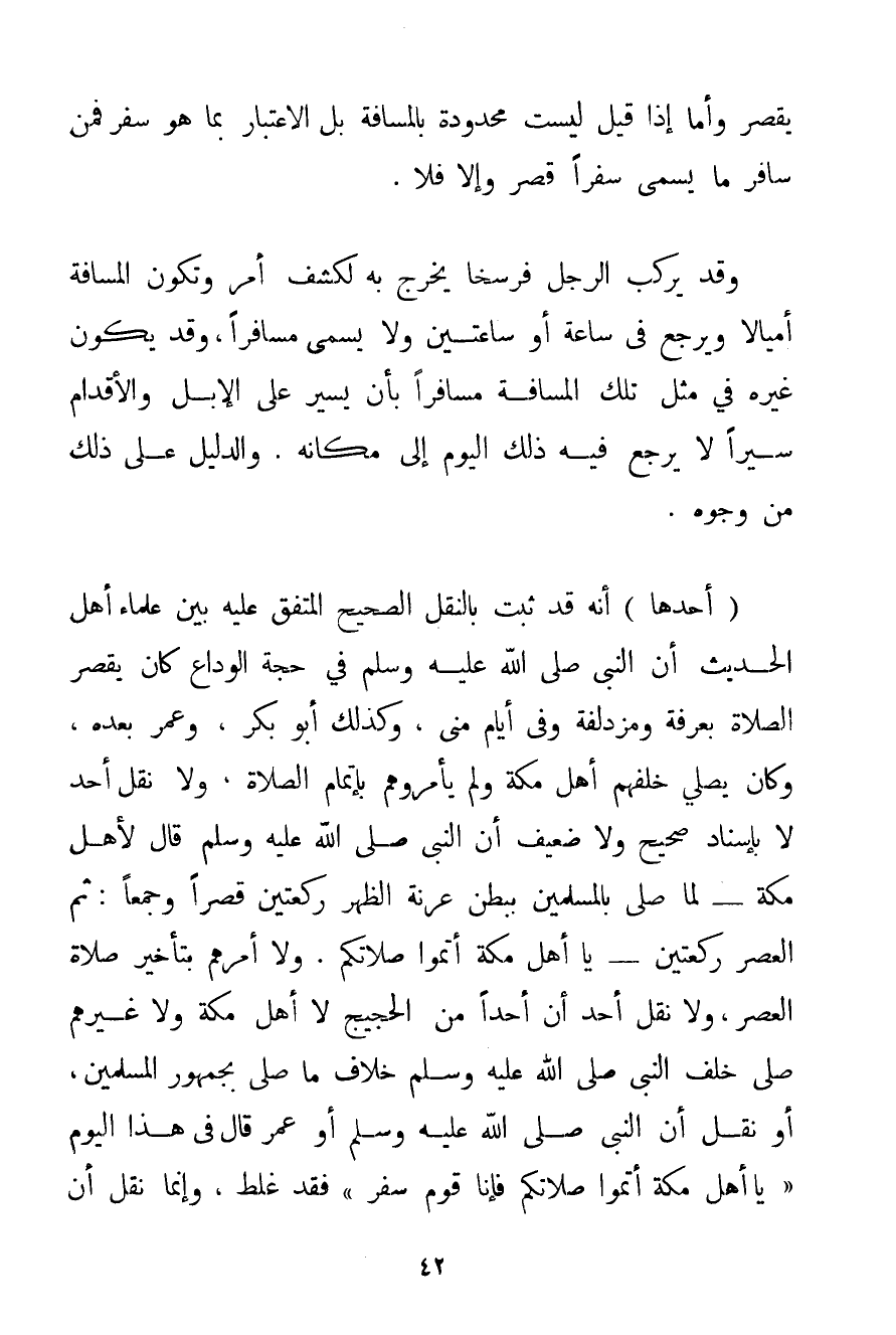 أَحَدُهَا أَنَّهُ قَدْ ثَبَتَ بِالنَّقْلِ الصَّحِيحِ الْمُتَّفَقِ عَلَيْهِ بَيْنَ عُلَمَاءِ أَهْلِ الْحَدِيثِ أَنَّ النَّبِيَّ صَلَّى اللَّهُ عَلَيْهِ وَسَلَّمَ فِي حِجَّةِ الْوَدَاعِ كَانَ يَقْصُرُ الصَّلَاةَ بِعَرَفَةَ وَمُزْدَلِفَةَ وَفِي أَيَّامِ مِنًى وَكَذَلِكَ أَبُو بَكْرٍ وَعُمَرُ بَعْدَهُ وَكَانَ يُصَلِّي خَلْفَهُمْ أَهْلُ مَكَّةَ وَلَمْ يَأْمُرُوهُمْ بِإِتْمَامِ الصَّلَاةِ وَلَا نَقَلَ أَحَدٌ لَا بِإِسْنَادٍ صَحِيحٍ وَلَا ضَعِيفٍ أَنَّ النَّبِيَّ صَلَّى اللَّهُ عَلَيْهِ وَسَلَّمَ قَالَ لِأَهْلِ مَكَّةَ - لَمَّا صَلَّى بِالْمُسْلِمِينَ بِبَطْنِ عرنة الظُّهْرَ رَكْعَتَيْنِ قَصْرًا وَجَمْعًا: ثُمَّ الْعَصْرَ رَكْعَتَيْنِ - يَا أَهْلَ مَكَّةَ أَتِمُّوا صَلَاتَكُمْ. وَلَا أَمَرَهُمْ بِتَأْخِيرِ صَلَاةِ الْعَصْرِ وَلَا نَقَلَ أَحَدٌ أَنَّ أَحَدًا مِنْ الْحَجِيجِ لَا أَهْلَ مَكَّةَ وَلَا غَيْرَهُمْ صَلَّى خَلْفَ النَّبِيِّ صَلَّى اللَّهُ عَلَيْهِ وَسَلَّمَ خِلَافَ مَا صَلَّى بِجُمْهُورِ الْمُسْلِمِينَ أَوْ نَقَلَ أَنَّ النَّبِيَّ صَلَّى اللَّهُ عَلَيْهِ وَسَلَّمَ أَوْ عُمَرَ قَالَ فِي هَذَا الْيَوْمِ " يَا أَهْلَ مَكَّةَ أَتِمُّوا صَلَاتَكُمْ فَإِنَّا قَوْمٌ سَفْرٌ " فَقَدْ غَلِطَ وَإِنَّمَا نُقِلَ أَنَّ
