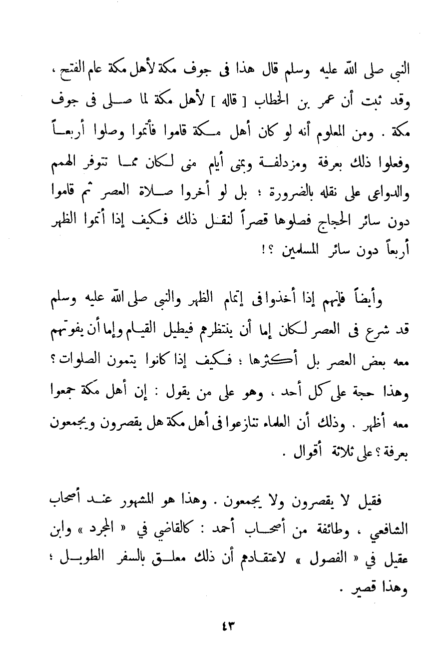 النَّبِيَّ صَلَّى اللَّهُ عَلَيْهِ وَسَلَّمَ قَالَ هَذَا فِي جَوْفِ مَكَّةَ لِأَهْلِ مَكَّةَ عَامَ الْفَتْحِ وَقَدْ ثَبَتَ أَنَّ عُمَرَ بْنَ الْخَطَّابِ قَالَهُ لِأَهْلِ مَكَّةَ لَمَّا صَلَّى فِي جَوْفِ مَكَّةَ. وَمِنْ الْمَعْلُومِ أَنَّهُ لَوْ كَانَ أَهْلُ مَكَّةَ قَامُوا فَأَتَمُّوا وَصَلَّوْا أَرْبَعًا وَفَعَلُوا ذَلِكَ بِعَرَفَةَ وَمُزْدَلِفَةَ وَبِمِنًى أَيَّامَ مِنًى لَكَانَ مِمَّا تَتَوَفَّرُ الْهِمَمُ وَالدَّوَاعِي عَلَى نَقْلِهِ بِالضَّرُورَةِ؛ بَلْ لَوْ أَخَّرُوا صَلَاةَ الْعَصْرِ ثُمَّ قَامُوا دُونَ سَائِرِ الْحُجَّاجِ فَصَلَّوْهَا قَصْرًا لَنُقِلَ ذَلِكَ فَكَيْفَ إذَا أَتَمُّوا الظُّهْرَ أَرْبَعًا دُونَ سَائِرِ الْمُسْلِمِينَ وَأَيْضًا فَإِنَّهُمْ إذَا أَخَذُوا فِي إتْمَامِ الظُّهْرِ وَالنَّبِيُّ صَلَّى اللَّهُ عَلَيْهِ وَسَلَّمَ قَدْ شَرَعَ فِي الْعَصْرِ لَكَانَ إمَّا أَنْ يَنْتَظِرَهُمْ فَيُطِيلَ الْقِيَامَ وَإِمَّا أَنْ يَفُوتَهُمْ مَعَهُ بَعْضُ الْعَصْرِ بَلْ أَكْثَرُهَا؛ فَكَيْفَ إذَا كَانُوا يُتِمُّونَ الصَّلَوَاتِ؟ وَهَذَا حُجَّةٌ عَلَى كُلِّ أَحَدٍ وَهُوَ عَلَى مَنْ يَقُولُ: إنَّ أَهْلَ مَكَّةَ جَمَعُوا مَعَهُ أَظْهَرُ. وَذَلِكَ أَنَّ الْعُلَمَاءَ تَنَازَعُوا فِي أَهْلِ مَكَّةَ هَلْ يَقْصُرُونَ وَيَجْمَعُونَ بِعَرَفَةَ؟ عَلَى ثَلَاثَةِ أَقْوَالٍ. فَقِيلَ لَا يَقْصُرُونَ وَلَا يَجْمَعُونَ. وَهَذَا هُوَ الْمَشْهُورُ عِنْدَ أَصْحَابِ الشَّافِعِيِّ وَطَائِفَةٍ مِنْ أَصْحَابِ أَحْمَد: كَالْقَاضِي فِي " الْمُجَرَّدِ " وَابْنِ عَقِيلٍ فِي " الْفُصُولِ " لِاعْتِقَادِهِمْ أَنَّ ذَلِكَ مُعَلَّقٌ بِالسَّفَرِ الطَّوِيلِ؛ وَهَذَا قَصِيرٌ.