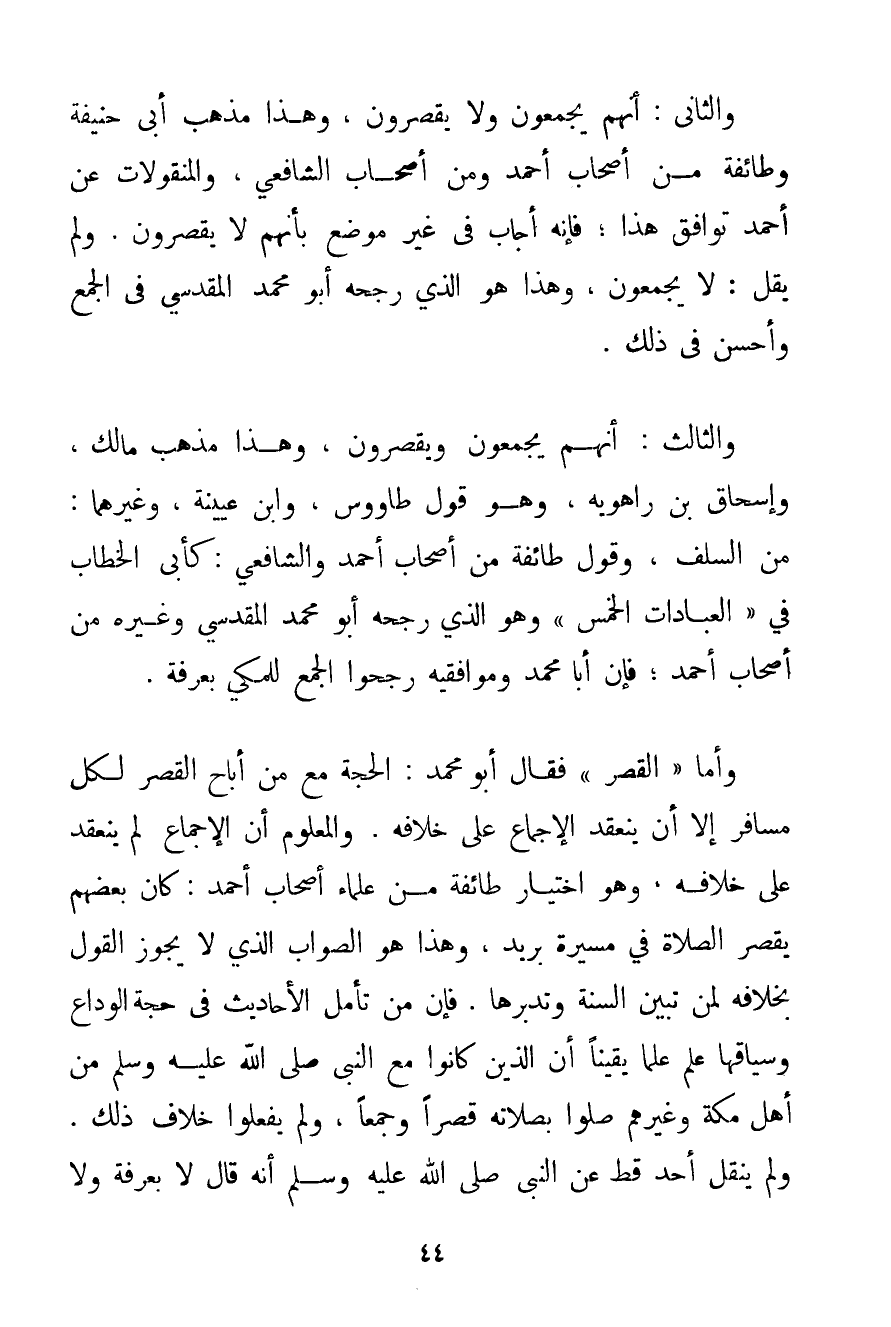 وَالثَّانِي: أَنَّهُمْ يَجْمَعُونَ وَلَا يَقْصُرُونَ وَهَذَا مَذْهَبُ أَبِي حَنِيفَةَ وَطَائِفَةٍ مِنْ أَصْحَابِ أَحْمَد وَمِنْ أَصْحَابِ الشَّافِعِيِّ وَالْمَنْقُولَاتُ عَنْ أَحْمَد تُوَافِقُ هَذَا؛ فَإِنَّهُ أَجَابَ فِي غَيْرِ مَوْضِعٍ بِأَنَّهُمْ لَا يَقْصُرُونَ. وَلَمْ يَقُلْ: لَا يَجْمَعُونَ وَهَذَا هُوَ الَّذِي رَجَّحَهُ أَبُو مُحَمَّدٍ المقدسي فِي الْجَمْعِ وَأَحْسَنَ فِي ذَلِكَ. وَالثَّالِثُ: أَنَّهُمْ يَجْمَعُونَ وَيَقْصُرُونَ وَهَذَا مَذْهَبُ مَالِكٍ وَإِسْحَاقَ بْنِ رَاهَوَيْه وَهُوَ قَوْلُ طَاوُوسٍ وَابْنِ عُيَيْنَة وَغَيْرِهِمَا: مِنْ السَّلَفِ وَقَوْلُ طَائِفَةٍ مِنْ أَصْحَابِ أَحْمَد وَالشَّافِعِيِّ: كَأَبِي الْخَطَّابِ فِي " الْعِبَادَاتِ الْخَمْسِ " وَهُوَ الَّذِي رَجَّحَهُ أَبُو مُحَمَّدٍ المقدسي وَغَيْرُهُ مِنْ أَصْحَابِ أَحْمَد؛ فَإِنَّ أَبَا مُحَمَّدٍ وَمُوَافِقِيهِ رَجَّحُوا الْجَمْعَ لِلْمَكِّيِّ بِعَرَفَةَ. وَأَمَّا " الْقَصْرُ " فَقَالَ أَبُو مُحَمَّدٍ: الْحُجَّةُ مَعَ مَنْ أَبَاحَ الْقَصْرَ لِكُلِّ مُسَافِرٍ إلَّا أَنْ يَنْعَقِدَ الْإِجْمَاعُ عَلَى خِلَافِهِ. وَالْمَعْلُومُ أَنَّ الْإِجْمَاعَ لَمْ يَنْعَقِدْ عَلَى خِلَافِهِ وَهُوَ اخْتِيَارُ طَائِفَةٍ مِنْ عُلَمَاءِ أَصْحَابِ أَحْمَد: كَانَ بَعْضُهُمْ يَقْصُرُ الصَّلَاةَ فِي مَسِيرَةِ بَرِيدٍ وَهَذَا هُوَ الصَّوَابُ الَّذِي لَا يَجُوزُ الْقَوْلُ بِخِلَافِهِ لِمَنْ تَبَيَّنَ السُّنَّةَ وَتَدَبَّرَهَا. فَإِنَّ مَنْ تَأَمَّلَ الْأَحَادِيثَ فِي حِجَّةِ الْوَدَاعِ وَسِيَاقَهَا عَلِمَ عِلْمًا يَقِينًا أَنَّ الَّذِينَ كَانُوا مَعَ النَّبِيِّ صَلَّى اللَّهُ عَلَيْهِ وَسَلَّمَ مِنْ أَهْلِ مَكَّةَ وَغَيْرِهِمْ صَلَّوْا بِصَلَاتِهِ قَصْرًا وَجَمْعًا وَلَمْ يَفْعَلُوا خِلَافَ ذَلِكَ. وَلَمْ يَنْقُلْ أَحَدٌ قَطُّ عَنْ النَّبِيِّ صَلَّى اللَّهُ عَلَيْهِ وَسَلَّمَ أَنَّهُ قَالَ لَا بِعَرَفَةَ وَلَا