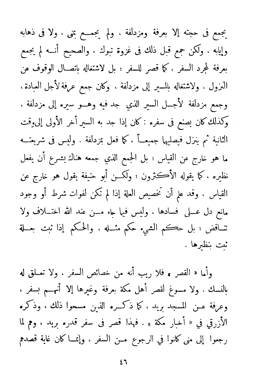 يَجْمَعُ فِي حَجَّتِهِ إلَّا بِعَرَفَةَ وَمُزْدَلِفَةَ وَلَمْ يَجْمَعْ بِمِنًى وَلَا فِي ذَهَابِهِ وَإِيَابِهِ وَلَكِنْ جَمَعَ قَبْلَ ذَلِكَ فِي غَزْوَةِ تَبُوكَ وَالصَّحِيحُ أَنَّهُ لَمْ يَجْمَعْ بِعَرَفَةَ لِمُجَرَّدِ السَّفَرِ كَمَا قَصَرَ لِلسَّفَرِ؛ بَلْ لِاشْتِغَالِهِ بِاتِّصَالِ الْوُقُوفِ عَنْ النُّزُولِ وَلِاشْتِغَالِهِ بِالْمَسِيرِ إلَى مُزْدَلِفَةَ وَكَانَ جَمْعُ عَرَفَةَ لِأَجْلِ الْعِبَادَةِ وَجَمْعُ مُزْدَلِفَةَ لِأَجْلِ السَّيْرِ الَّذِي جَدَّ فِيهِ وَهُوَ سَيْرُهُ إلَى مُزْدَلِفَةَ وَكَذَلِكَ كَانَ يَصْنَعُ فِي سَفَرِهِ: كَانَ إذَا جَدَّ بِهِ السَّيْرُ أَخَّرَ الْأُولَى إلَى وَقْتِ الثَّانِيَةِ ثُمَّ يَنْزِلُ فَيُصَلِّيهِمَا جَمِيعًا كَمَا فَعَلَ بمزدلفة. وَلَيْسَ فِي شَرِيعَتِهِ مَا هُوَ خَارِجٌ عَنْ الْقِيَاسِ؛ بَلْ الْجَمْعُ الَّذِي جَمَعَهُ هُنَاكَ يُشْرَعُ أَنْ يُفْعَلَ نَظِيرُهُ كَمَا يَقُولُهُ الْأَكْثَرُونَ؛ وَلَكِنْ أَبُو حَنِيفَةَ يَقُولَ هُوَ خَارِجٌ عَنْ الْقِيَاسِ وَقَدْ عُلِمَ أَنَّ تَخْصِيصَ الْعِلَّةِ إذَا لَمْ تَكُنْ لِفَوَاتِ شَرْطٍ أَوْ وُجُودِ مَانِعٍ دَلَّ عَلَى فَسَادِهَا وَلَيْسَ فِيمَا جَاءَ مِنْ عِنْدِ اللَّهِ اخْتِلَافٌ وَلَا تَنَاقُضٌ؛ بَلْ حُكْمُ الشَّيْءِ حُكْمُ مِثْلِهِ وَالْحُكْمُ إذَا ثَبَتَ بِعِلَّةٍ ثَبَتَ بِنَظِيرِهَا. وَأَمَّا " الْقَصْرُ " فَلَا رَيْبَ أَنَّهُ مِنْ خَصَائِصِ السَّفَرِ وَلَا تَعَلُّقَ لَا بِالنُّسُكِ وَلَا مُسَوِّغَ لِقَصْرِ أَهْلِ مَكَّةَ بِعَرَفَةَ وَغَيْرِهَا إلَّا أَنَّهُمْ بِسَفَرِ وَعَرَفَةُ عَنْ الْمَسْجِدِ بَرِيدٌ كَمَا ذَكَرَهُ الَّذِينَ مَسَحُوا ذَلِكَ وَذَكَرَهُ الأزرقي فِي " أَخْبَارِ مَكَّةَ ". فَهَذَا قَصْرٌ فِي سَفَرٍ قَدْرُهُ بَرِيدٌ وَهُمْ لَمَّا رَجَعُوا إلَى مِنًى كَانُوا فِي الرُّجُوعِ مِنْ السَّفَرِ وَإِنَّمَا كَانَ غَايَةُ قَصْدِهِمْ