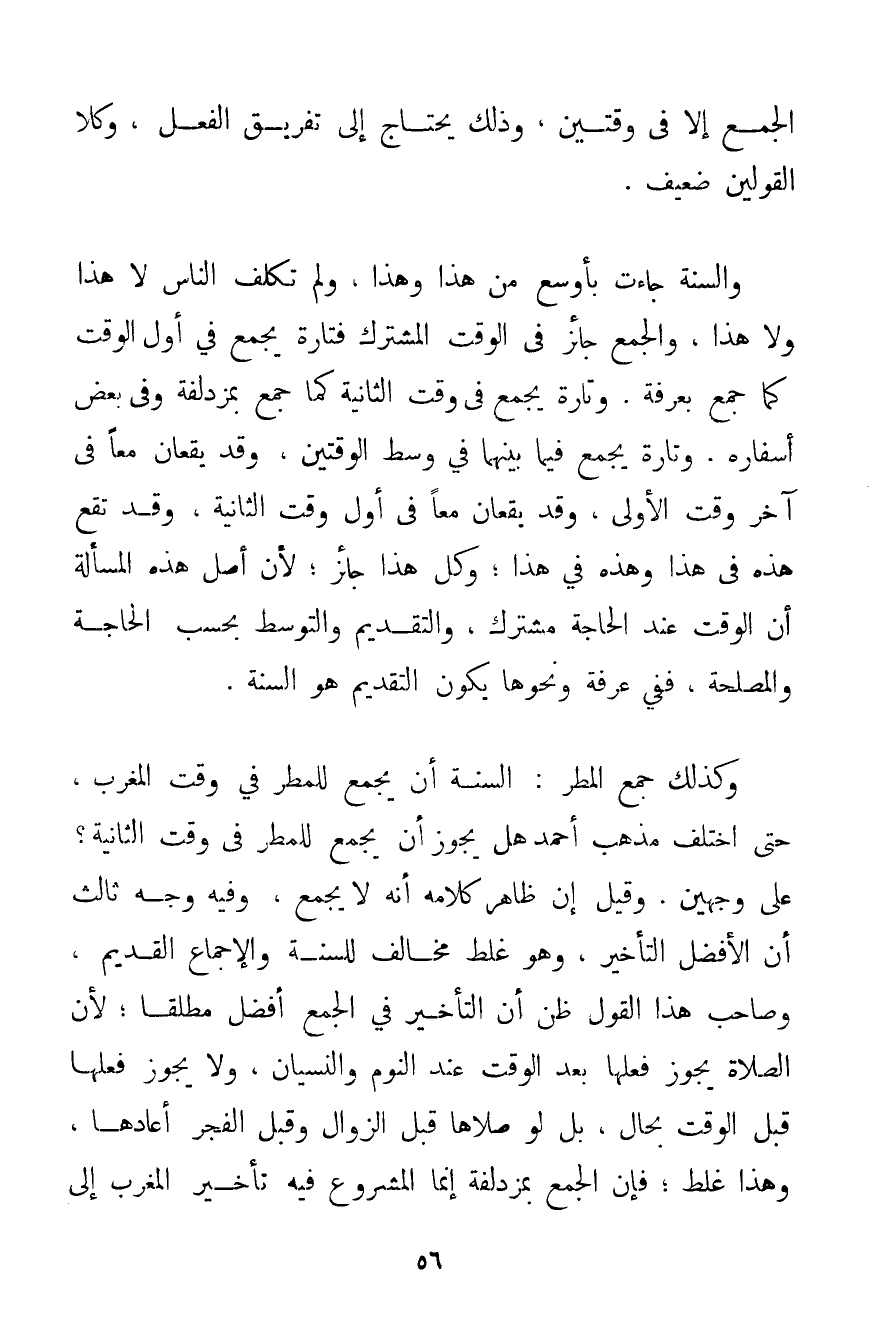 الْجَمْعُ إلَّا فِي وَقْتَيْنِ وَذَلِكَ يَحْتَاجُ إلَى تَفْرِيقِ الْفِعْلِ وَكِلَا الْقَوْلَيْنِ ضَعِيفٌ. وَالسُّنَّةُ جَاءَتْ بِأَوْسَعَ مِنْ هَذَا وَهَذَا وَلَمْ تُكَلِّفْ النَّاسَ لَا هَذَا وَلَا هَذَا وَالْجَمْعُ جَائِزٌ فِي الْوَقْتِ الْمُشْتَرِكِ فَتَارَةً يَجْمَعُ فِي أَوَّلِ الْوَقْتِ كَمَا جَمَعَ بِعَرَفَةَ. وَتَارَةً يَجْمَعُ فِي وَقْتِ الثَّانِيَةِ كَمَا جَمَعَ بمزدلفة وَفِي بَعْضِ أَسْفَارِهِ. وَتَارَةً يَجْمَعُ فِيمَا بَيْنَهُمَا فِي وَسَطِ الْوَقْتَيْنِ وَقَدْ يَقَعَانِ مَعًا فِي آخِرِ وَقْتِ الْأُولَى وَقَدْ يَقَعَانِ مَعًا فِي أَوَّلِ وَقْتِ الثَّانِيَةِ وَقَدْ تَقَعُ هَذِهِ فِي هَذَا وَهَذِهِ فِي هَذَا؛ وَكُلُّ هَذَا جَائِزٌ؛ لِأَنَّ أَصْلَ هَذِهِ الْمَسْأَلَةِ أَنَّ الْوَقْتَ عِنْدَ الْحَاجَةِ مُشْتَرَكٌ وَالتَّقْدِيمُ وَالتَّوَسُّطُ بِحَسَبِ الْحَاجَةِ وَالْمَصْلَحَةِ فَفِي عَرَفَةَ وَنَحْوِهَا يَكُونُ التَّقْدِيمُ هُوَ السُّنَّةَ.
