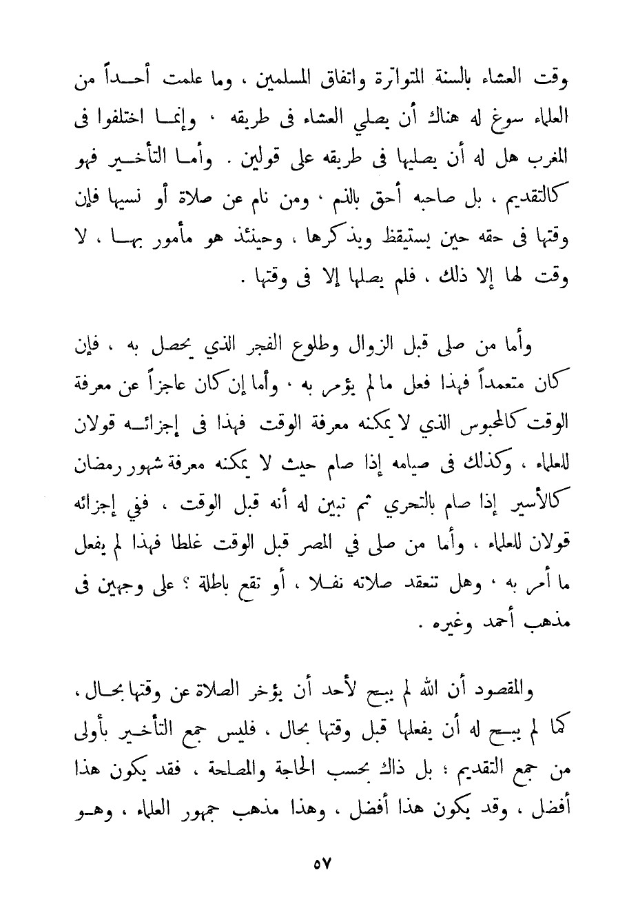 وَقْتِ الْعِشَاءِ بِالسُّنَّةِ الْمُتَوَاتِرَةِ وَاتِّفَاقِ الْمُسْلِمِينَ وَمَا عَلِمْت أَحَدًا مِنْ الْعُلَمَاءِ سَوَّغَ لَهُ هُنَاكَ أَنْ يُصَلِّيَ الْعِشَاءَ فِي طَرِيقِهِ وَإِنَّمَا اخْتَلَفُوا فِي الْمَغْرِبِ هَلْ لَهُ أَنْ يُصَلِّيَهَا فِي طَرِيقِهِ عَلَى قَوْلَيْنِ. وَأَمَّا التَّأْخِيرُ فَهُوَ كَالتَّقْدِيمِ بَلْ صَاحِبُهُ أَحَقُّ بِالذَّمِّ وَمَنْ نَامَ عَنْ صَلَاةٍ أَوْ نَسِيَهَا فَإِنَّ وَقْتَهَا فِي حَقِّهِ حِينَ يَسْتَيْقِظُ وَيَذْكُرُهَا وَحِينَئِذٍ هُوَ مَأْمُورٌ بِهَا لَا وَقْتَ لَهَا إلَّا ذَلِكَ فَلَمْ يُصَلِّهَا إلَّا فِي وَقْتِهَا. وَأَمَّا مَنْ صَلَّى قَبْلَ الزَّوَالِ وَطُلُوعِ الْفَجْرِ الَّذِي يَحْصُلُ بِهِ فَإِنْ كَانَ مُتَعَمِّدًا فَهَذَا فَعَلَ مَا لَمْ يُؤْمَرْ بِهِ وَأَمَّا إنْ كَانَ عَاجِزًا عَنْ مَعْرِفَةِ الْوَقْتِ كَالْمَحْبُوسِ الَّذِي لَا يُمْكِنُهُ مَعْرِفَةُ الْوَقْتِ فَهَذَا فِي إجْزَائِهِ قَوْلَانِ لِلْعُلَمَاءِ وَكَذَلِكَ فِي صِيَامِهِ إذَا صَامَ حَيْثُ لَا يُمْكِنُهُ مَعْرِفَةُ شُهُورِ رَمَضَانَ كَالْأَسِيرِ إذَا صَامَ بِالتَّحَرِّي ثُمَّ تَبَيَّنَ لَهُ أَنَّهُ قَبْلَ الْوَقْتِ فَفِي إجْزَائِهِ قَوْلَانِ لِلْعُلَمَاءِ وَأَمَّا مَنْ صَلَّى فِي الْمِصْرِ قَبْلَ الْوَقْتِ غَلَطًا فَهَذَا لَمْ يَفْعَلْ مَا أُمِرَ بِهِ وَهَلْ تَنْعَقِدُ صَلَاتُهُ نَفْلًا أَوْ تَقَعُ بَاطِلَةً؟ عَلَى وَجْهَيْنِ فِي مَذْهَبِ أَحْمَد وَغَيْرِهِ. وَالْمَقْصُودُ أَنَّ اللَّهَ لَمْ يُبِحْ لِأَحَدٍ أَنْ يُؤَخِّرَ الصَّلَاةَ عَنْ وَقْتِهَا بِحَالِ كَمَا لَمْ يُبِحْ لَهُ أَنْ يَفْعَلَهَا قَبْلَ وَقْتِهَا بِحَالِ فَلَيْسَ جَمْعُ التَّأْخِيرِ بِأَوْلَى مِنْ جَمْعِ التَّقْدِيمِ؛ بَلْ ذَاكَ بِحَسَبِ الْحَاجَةِ وَالْمَصْلَحَةِ فَقَدْ يَكُونُ هَذَا أَفْضَلَ وَقَدْ يَكُونُ هَذَا أَفْضَلَ وَهَذَا مَذْهَبُ جُمْهُورِ الْعُلَمَاءِ وَهُوَ