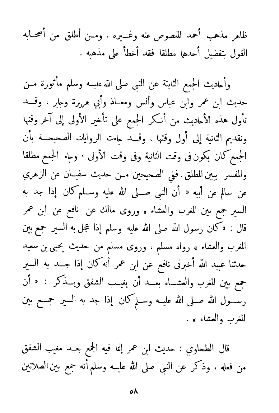 ظَاهِرُ مَذْهَبِ أَحْمَد الْمَنْصُوصِ عَنْهُ وَغَيْرِهِ. وَمَنْ أَطْلَقَ مِنْ أَصْحَابِهِ الْقَوْلَ بِتَفْضِيلِ أَحَدِهِمَا مُطْلَقًا فَقَدْ أَخْطَأَ عَلَى مَذْهَبِهِ. وَأَحَادِيثُ الْجَمْعِ الثَّابِتَةُ عَنْ النَّبِيِّ صَلَّى اللَّهُ عَلَيْهِ وَسَلَّمَ مَأْثُورَةٌ مِنْ حَدِيثِ ابْنِ عُمَرَ وَابْنِ عَبَّاسٍ وَأَنَسٍ وَمُعَاذٍ وَأَبِي هُرَيْرَةَ وَجَابِرٍ وَقَدْ تَأَوَّلَ هَذِهِ الْأَحَادِيثَ مَنْ أَنْكَرَ الْجَمْعَ عَلَى تَأْخِيرِ الْأُولَى إلَى آخِرِ وَقْتِهَا وَتَقْدِيمِ الثَّانِيَةِ إلَى أَوَّلِ وَقْتِهَا وَقَدْ جَاءَتْ الرِّوَايَاتُ الصَّحِيحَةُ بِأَنَّ الْجَمْعَ كَانَ يَكُونُ فِي وَقْتِ الثَّانِيَةِ وَفِي وَقْتِ الْأُولَى وَجَاءَ الْجَمْعُ مُطْلَقًا وَالْمُفَسَّرُ يُبَيِّنُ الْمُطْلَقَ. فَفِي الصَّحِيحَيْنِ مِنْ حَدِيثِ سُفْيَانَ عَنْ الزُّهْرِيِّ عَنْ سَالِمٍ عَنْ أَبِيهِ {أَنَّ النَّبِيَّ صَلَّى اللَّهُ عَلَيْهِ وَسَلَّمَ كَانَ إذَا جَدَّ بِهِ السَّيْرُ جَمَعَ بَيْنَ الْمَغْرِبِ وَالْعِشَاءِ} وَرَوَى مَالِكٌ عَنْ نَافِعٍ عَنْ ابْنِ عُمَرَ قَالَ: {كَانَ رَسُولُ اللَّهِ صَلَّى اللَّهُ عَلَيْهِ وَسَلَّمَ إذَا عَجَّلَ بِهِ السَّيْرُ جَمَعَ بَيْنَ الْمَغْرِبِ وَالْعِشَاءِ} رَوَاهُ مُسْلِمٌ وَرَوَى مُسْلِمٌ مِنْ حَدِيثِ يَحْيَى بْنِ سَعِيدٍ حَدَّثَنَا عُبَيْدُ اللَّهِ أَخْبَرَنِي نَافِعٌ عَنْ ابْنِ عُمَرَ أَنَّهُ كَانَ إذَا جَدَّ بِهِ السَّيْرُ جَمَعَ بَيْنَ الْمَغْرِبِ وَالْعِشَاءِ بَعْدَ أَنْ يَغِيبَ الشَّفَقُ وَيَذْكُرُ: {أَنَّ رَسُولَ اللَّهِ صَلَّى اللَّهُ عَلَيْهِ وَسَلَّمَ كَانَ إذَا جَدَّ بِهِ السَّيْرُ جَمَعَ بَيْنَ الْمَغْرِبِ وَالْعِشَاءِ} . قَالَ الطَّحَاوِي: حَدِيثُ ابْنِ عُمَرَ إنَّمَا فِيهِ الْجَمْعُ بَعْدَ مَغِيبِ الشَّفَقِ مَنْ فَعَلَهُ وَذَكَرَ عَنْ النَّبِيِّ صَلَّى اللَّهُ عَلَيْهِ وَسَلَّمَ أَنَّهُ جَمَعَ بَيْنَ الصَّلَاتَيْنِ