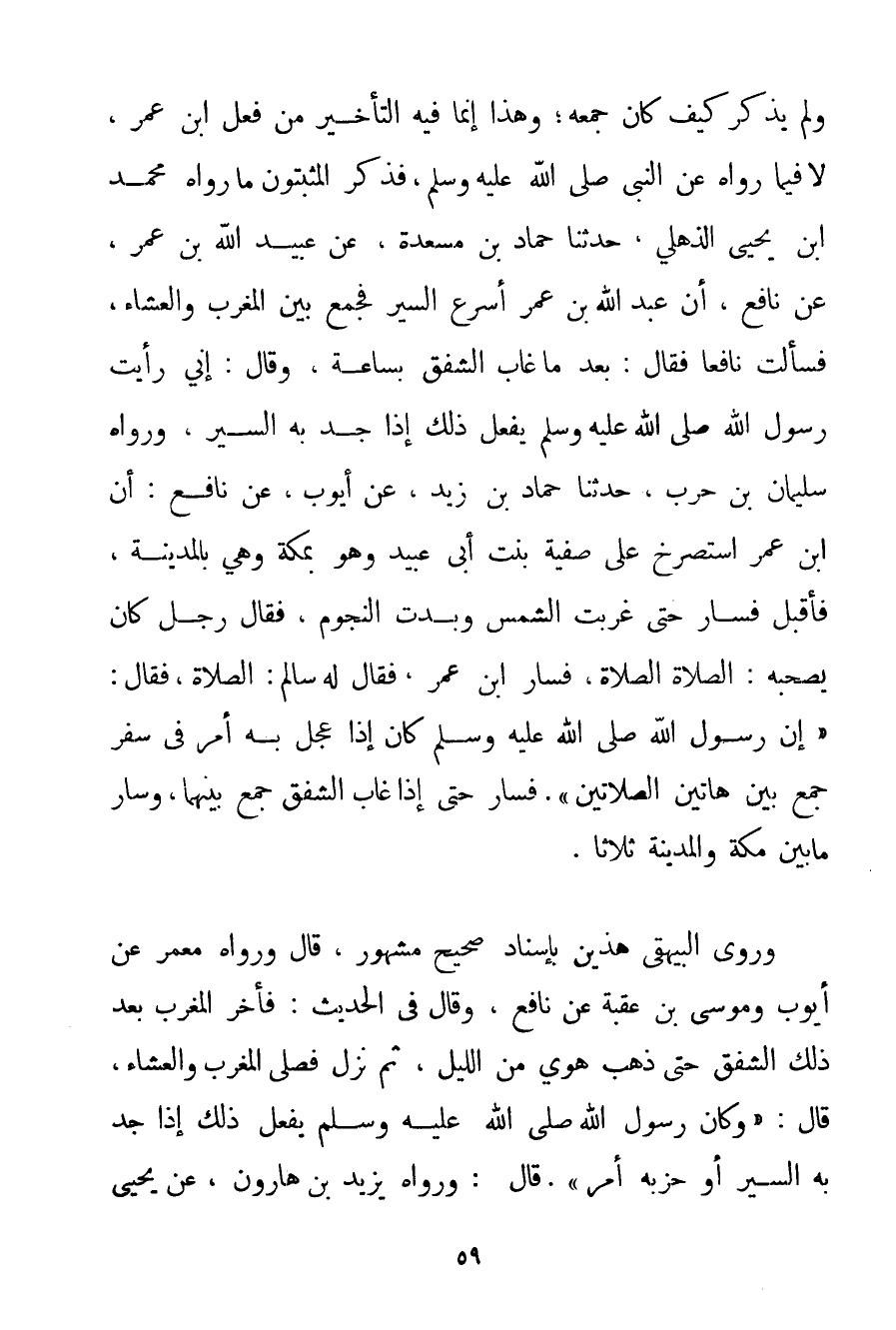 وَلَمْ يَذْكُرْ كَيْفَ كَانَ جَمْعُهُ؛ وَهَذَا إنَّمَا فِيهِ التَّأْخِيرُ مِنْ فِعْلِ ابْنِ عُمَرَ لَا فِيمَا رَوَاهُ عَنْ النَّبِيِّ صَلَّى اللَّهُ عَلَيْهِ وَسَلَّمَ فَذَكَرَ الْمُثْبِتُونَ مَا رَوَاهُ مُحَمَّدُ بْنُ يَحْيَى الذهلي حَدَّثَنَا حَمَّادُ بْنُ مُسْعِدَةَ عَنْ عُبَيْدِ اللَّهِ بْنِ عُمَرَ عَنْ نَافِعٍ أَنَّ {عَبْدَ اللَّهِ بْنَ عُمَرَ أَسْرَعَ السَّيْرَ فَجَمَعَ بَيْنَ الْمَغْرِبِ وَالْعِشَاءِ فَسَأَلْت نَافِعًا فَقَالَ: بَعْدَ مَا غَابَ الشَّفَقُ بِسَاعَةِ وَقَالَ: إنِّي رَأَيْت رَسُولَ اللَّهِ صَلَّى اللَّهُ عَلَيْهِ وَسَلَّمَ يَفْعَلُ ذَلِكَ إذَا جَدَّ بِهِ السَّيْرُ} وَرَوَاهُ سُلَيْمَانُ بْنُ حَرْبٍ حَدَّثَنَا حَمَّادُ بْنُ زَيْدٍ عَنْ أَيُّوبَ عَنْ نَافِعٍ: أَنَّ ابْنَ عُمَرَ اسْتَصْرَخَ عَلَى صَفِيَّةَ بِنْتِ أَبِي عُبَيْدٍ وَهُوَ بِمَكَّةَ وَهِيَ بِالْمَدِينَةِ فَأَقْبَلَ فَسَارَ حَتَّى غَرَبَتْ الشَّمْسُ وَبَدَتْ النُّجُومُ فَقَالَ رَجُلٌ كَانَ يَصْحَبُهُ: الصَّلَاةَ الصَّلَاةَ فَسَارَ ابْنُ عُمَرَ فَقَالَ لَهُ سَالِمٌ: الصَّلَاةَ فَقَالَ: {إنَّ رَسُولَ اللَّهِ صَلَّى اللَّهُ عَلَيْهِ وَسَلَّمَ كَانَ إذَا عَجَّلَ بِهِ أَمْرٌ فِي سَفَرٍ جَمَعَ بَيْنَ هَاتَيْنِ الصَّلَاتَيْنِ} . فَسَارَ حَتَّى إذَا غَابَ الشَّفَقُ جَمَعَ بَيْنَهُمَا وَسَارَ مَا بَيْنَ مَكَّةَ وَالْمَدِينَةِ ثَلَاثًا. وَرَوَى البيهقي هَذَيْنِ بِإِسْنَادٍ صَحِيحٍ مَشْهُورٍ قَالَ وَرَوَاهُ مَعْمَرٌ عَنْ أَيُّوبَ وَمُوسَى بْنِ عُقْبَةَ عَنْ {نَافِعٍ وَقَالَ فِي الْحَدِيثِ: فَأَخَّرَ الْمَغْرِبَ بَعْدَ ذَلِكَ الشَّفَقِ حَتَّى ذَهَبَ هَوِيٌّ مِنْ اللَّيْلِ ثُمَّ نَزَلَ فَصَلَّى الْمَغْرِبَ وَالْعِشَاءَ قَالَ: وَكَانَ رَسُولُ اللَّهِ صَلَّى اللَّهُ عَلَيْهِ وَسَلَّمَ يَفْعَلُ ذَلِكَ إذَا جَدَّ بِهِ السَّيْرُ أَوْ حَزَبَهُ أَمْرٌ} . قَالَ: وَرَوَاهُ يَزِيدُ بْنُ هَارُونَ عَنْ يَحْيَى