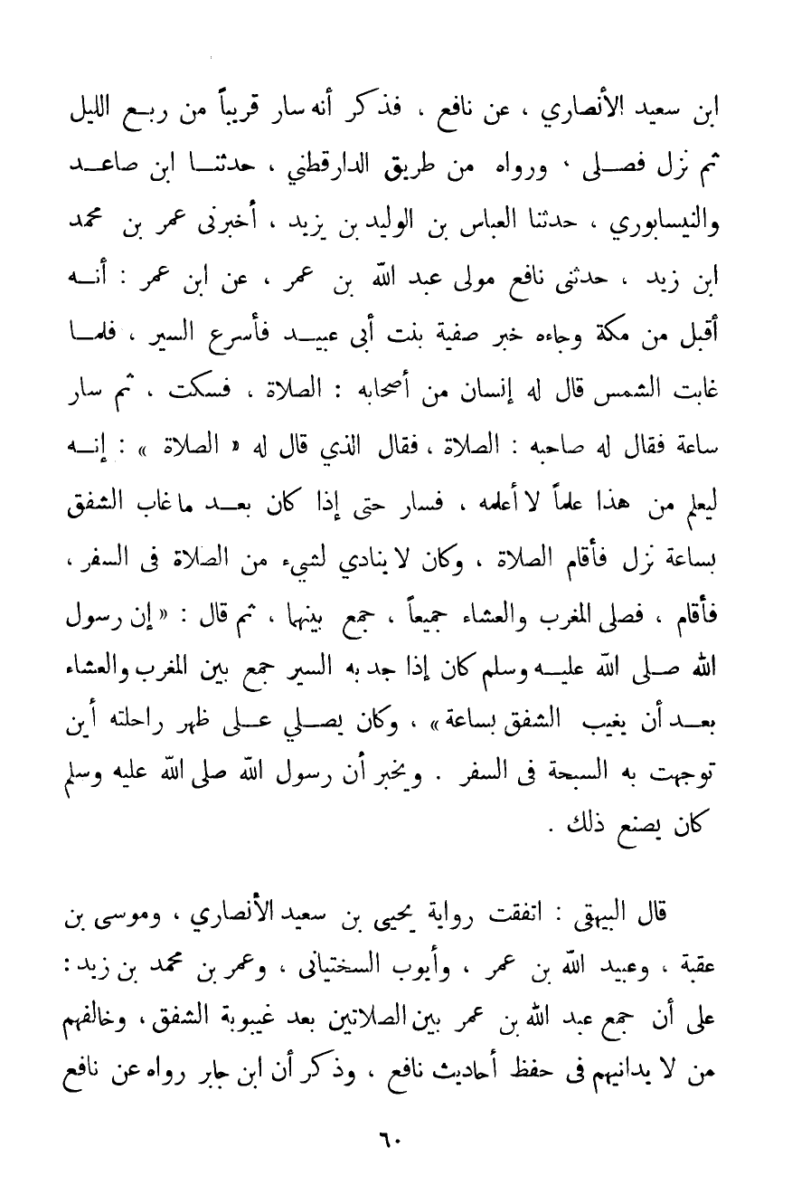 بْنِ سَعِيدٍ الْأَنْصَارِيِّ عَنْ نَافِعٍ فَذَكَرَ أَنَّهُ سَارَ قَرِيبًا مِنْ رُبُعِ اللَّيْلِ ثُمَّ نَزَلَ فَصَلَّى وَرَوَاهُ مِنْ طَرِيقِ الدارقطني حَدَّثَنَا ابْنُ صَاعِدٍ والنيسابوري حَدَّثَنَا الْعَبَّاسُ بْنُ الْوَلِيدِ بْنِ يَزِيدَ أَخْبَرَنِي عُمَرُ بْنُ مُحَمَّدٍ بْنِ زَيْدٍ حَدَّثَنِي نَافِعٌ مَوْلَى عَبْدِ اللَّهِ بْنِ عُمَرَ عَنْ ابْنِ عُمَرَ: أَنَّهُ أَقْبَلَ مِنْ مَكَّةَ وَجَاءَهُ خَبَرُ صَفِيَّةَ بِنْتِ أَبِي عُبَيْدٍ فَأَسْرَعَ السَّيْرَ فَلَمَّا غَابَتْ الشَّمْسُ قَالَ لَهُ إنْسَانٌ مِنْ أَصْحَابِهِ: الصَّلَاةَ فَسَكَتَ ثُمَّ سَارَ سَاعَةً فَقَالَ لَهُ صَاحِبُهُ: الصَّلَاةَ فَقَالَ الَّذِي قَالَ لَهُ " الصَّلَاةَ ": إنَّهُ لَيَعْلَمُ مِنْ هَذَا عِلْمًا لَا أَعْلَمُهُ فَسَارَ حَتَّى إذَا كَانَ بَعْدَ مَا غَابَ الشَّفَقُ بِسَاعَةٍ نَزَلَ فَأَقَامَ الصَّلَاةَ وَكَانَ لَا يُنَادِي لِشَيْءٍ مِنْ الصَّلَاةِ فِي السَّفَرِ فَأَقَامَ فَصَلَّى الْمَغْرِبَ وَالْعِشَاءَ جَمِيعًا جَمَعَ بَيْنَهُمَا ثُمَّ قَالَ: {إنَّ رَسُولَ اللَّهِ صَلَّى اللَّهُ عَلَيْهِ وَسَلَّمَ كَانَ إذَا جَدَّ بِهِ السَّيْرُ جَمَعَ بَيْنَ الْمَغْرِبِ وَالْعِشَاءِ بَعْدَ أَنْ يَغِيبَ الشَّفَقُ بِسَاعَةِ وَكَانَ يُصَلِّي عَلَى ظَهْرِ رَاحِلَتِهِ أَيْنَ تَوَجَّهَتْ بِهِ السُّبْحَةُ فِي السَّفَرِ} . وَيُخْبِرُ أَنَّ رَسُولَ اللَّهِ صَلَّى اللَّهُ عَلَيْهِ وَسَلَّمَ كَانَ يَصْنَعُ ذَلِكَ. قَالَ البيهقي: اتَّفَقَتْ رِوَايَةُ يَحْيَى بْنِ سَعِيدٍ الْأَنْصَارِيِّ وَمُوسَى بْنِ عُقْبَةَ وَعُبَيْدِ اللَّهِ بْنِ عُمَرَ وَأَيُّوبَ السختياني وَعُمَرَ بْنِ مُحَمَّدِ بْنِ زَيْدٍ: عَلَى أَنَّ جَمْعَ عَبْدِ اللَّهِ بْنِ عُمَرَ بَيْنَ الصَّلَاتَيْنِ بَعْدَ غَيْبُوبَةِ الشَّفَقِ وَخَالَفَهُمْ مَنْ لَا يُدَانِيهِمْ فِي حِفْظِ أَحَادِيثِ نَافِعٍ وَذَكَرَ أَنَّ ابْنَ جَابِرٍ رَوَاهُ عَنْ نَافِعٍ