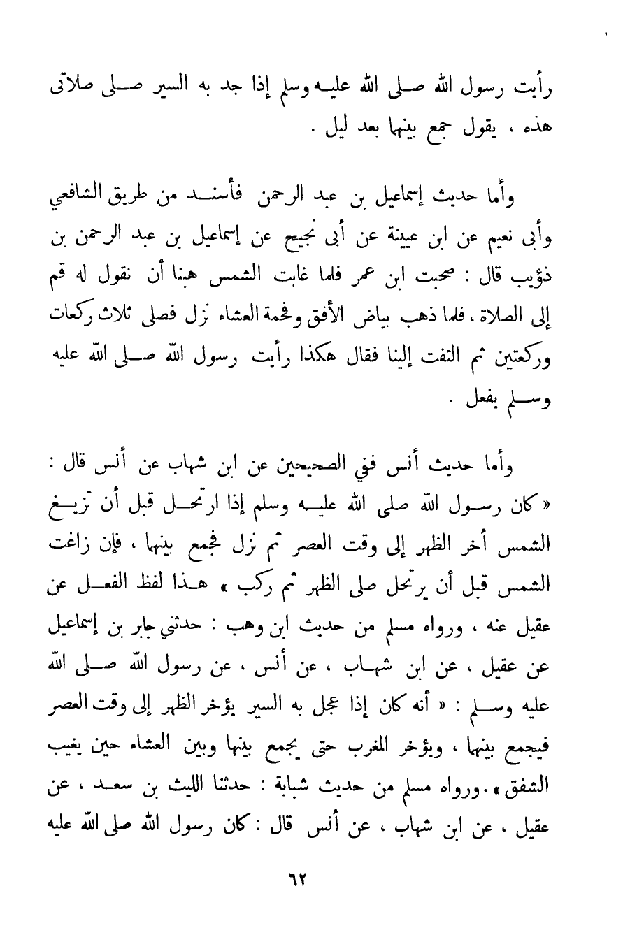 رَأَيْت رَسُولَ اللَّهِ صَلَّى اللَّهُ عَلَيْهِ وَسَلَّمَ إذَا جَدَّ بِهِ السَّيْرُ صَلَّى صَلَاتِي هَذِهِ يَقُولُ جَمَعَ بَيْنَهُمَا بَعْدَ لَيْلٍ} . وَأَمَّا حَدِيثُ إسْمَاعِيلَ بْنِ عَبْدِ الرَّحْمَنِ فَأُسْنِدَ مِنْ طَرِيقِ الشَّافِعِيِّ وَأَبِي نُعَيْمٍ عَنْ ابْنِ عُيَيْنَة عَنْ أَبِي نَجِيحٍ عَنْ {إسْمَاعِيلَ بْنِ عَبْدِ الرَّحْمَنِ بْنِ ذُؤَيْبٍ قَالَ: صَحِبْت ابْنَ عُمَرَ فَلَمَّا غَابَتْ الشَّمْسُ هِبْنَا أَنْ نَقُولَ لَهُ قُمْ إلَى الصَّلَاةِ فَلَمَّا ذَهَبَ بَيَاضُ الْأُفُقِ وَفَحْمَةُ الْعِشَاءِ نَزَلَ فَصَلَّى ثَلَاثَ رَكَعَاتٍ وَرَكْعَتَيْنِ ثُمَّ الْتَفَتَ إلَيْنَا فَقَالَ هَكَذَا رَأَيْت رَسُولَ اللَّهِ صَلَّى اللَّهُ عَلَيْهِ وَسَلَّمَ يَفْعَلُ} . وَأَمَّا حَدِيثُ أَنَسٍ فَفِي الصَّحِيحَيْنِ عَنْ ابْنِ شِهَابٍ عَنْ أَنَسٍ قَالَ: {كَانَ رَسُولُ اللَّهِ صَلَّى اللَّهُ عَلَيْهِ وَسَلَّمَ إذَا ارْتَحَلَ قَبْلَ أَنْ تَزِيغَ الشَّمْسُ أَخَّرَ الظُّهْرَ إلَى وَقْتِ الْعَصْرِ ثُمَّ نَزَلَ فَجَمَعَ بَيْنَهُمَا فَإِنْ زَاغَتْ الشَّمْسُ قَبْلَ أَنْ يَرْتَحِلَ صَلَّى الظُّهْرَ ثُمَّ رَكِبَ} هَذَا لَفْظُ الْفِعْلِ عَنْ عَقِيلٍ عَنْهُ وَرَوَاهُ مُسْلِمٌ مِنْ حَدِيثِ ابْنِ وَهْبٍ: حَدَّثَنِي جَابِرُ بْنُ إسْمَاعِيلَ عَنْ عَقِيلٍ عَنْ ابْنِ شِهَابٍ عَنْ أَنَسٍ عَنْ رَسُولِ اللَّهِ صَلَّى اللَّهُ عَلَيْهِ وَسَلَّمَ {أَنَّهُ كَانَ إذَا عَجَّلَ بِهِ السَّيْرُ يُؤَخِّرُ الظُّهْرَ إلَى وَقْتِ الْعَصْرِ فَيَجْمَعُ بَيْنَهُمَا وَيُؤَخِّرُ الْمَغْرِبَ حَتَّى يَجْمَعَ بَيْنَهَا وَبَيْنَ الْعِشَاءِ حِينَ يَغِيبُ الشَّفَقُ} . وَرَوَاهُ مُسْلِمٌ مِنْ حَدِيثِ شَبَّابَةَ: حَدَّثَنَا اللَّيْثُ بْنُ سَعْدٍ عَنْ عَقِيلٍ عَنْ ابْنِ شِهَابٍ عَنْ أَنَسٍ قَالَ: {كَانَ رَسُولُ اللَّهِ صَلَّى اللَّهُ عَلَيْهِ وَسَلَّمَ