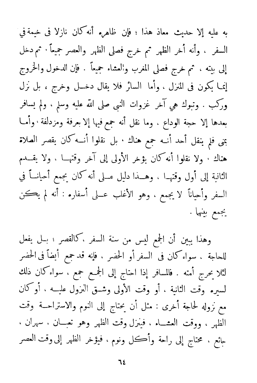 بِهِ عَلَيْهِ إلَّا حَدِيثَ مُعَاذٍ هَذَا؛ فَإِنَّ ظَاهِرَهُ أَنَّهُ كَانَ نَازِلًا فِي خَيْمَةٍ فِي السَّفَرِ وَأَنَّهُ أَخَّرَ الظُّهْرَ ثُمَّ خَرَجَ فَصَلَّى الظُّهْرَ وَالْعَصْرَ جَمِيعًا ثُمَّ دَخَلَ إلَى بَيْتِهِ ثُمَّ خَرَجَ فَصَلَّى الْمَغْرِبَ وَالْعِشَاءَ جَمِيعًا. فَإِنَّ الدُّخُولَ وَالْخُرُوجَ إنَّمَا يَكُونُ فِي الْمَنْزِلِ وَأَمَّا السَّائِرُ فَلَا يُقَالُ دَخَلَ وَخَرَجَ بَلْ نَزَلَ وَرَكِبَ. وَتَبُوكُ هِيَ آخِرُ غَزَوَاتِ النَّبِيِّ صَلَّى اللَّهُ عَلَيْهِ وَسَلَّمَ وَلَمْ يُسَافِرْ بَعْدَهَا إلَّا حِجَّةَ الْوَدَاعِ وَمَا نُقِلَ أَنَّهُ جَمَعَ فِيهَا إلَّا بِعَرَفَةَ وَمُزْدَلِفَةَ وَأَمَّا بِمِنًى فِلْم يَنْقُلْ أَحَدٌ أَنَّهُ جَمَعَ هُنَاكَ بَلْ نَقَلُوا أَنَّهُ كَانَ يَقْصُرُ الصَّلَاةَ هُنَاكَ وَلَا نَقَلُوا أَنَّهُ كَانَ يُؤَخِّرُ الْأُولَى إلَى آخِرِ وَقْتِهَا وَلَا يُقَدِّمُ الثَّانِيَةَ إلَى أَوَّلِ وَقْتِهَا وَهَذَا دَلِيلٌ عَلَى أَنَّهُ كَانَ يَجْمَعُ أَحْيَانًا فِي السَّفَرِ وَأَحْيَانًا لَا يَجْمَعُ وَهُوَ الْأَغْلَبُ عَلَى أَسْفَارِهِ: أَنَّهُ لَمْ يَكُنْ يَجْمَعُ بَيْنَهُمَا. وَهَذَا يُبَيِّنُ أَنَّ الْجَمْعَ لَيْسَ مِنْ سُنَّةِ السَّفَرِ كَالْقَصْرِ؛ بَلْ يُفْعَلُ لِلْحَاجَةِ سَوَاءٌ كَانَ فِي السَّفَرِ أَوْ الْحَضَرِ فَإِنَّهُ قَدْ جَمَعَ أَيْضًا فِي الْحَضَرِ لِئَلَّا يُحْرِجَ أُمَّتَهُ. فَالْمُسَافِرُ إذَا احْتَاجَ إلَى الْجَمْعِ جَمَعَ سَوَاءٌ كَانَ ذَلِكَ لِسَيْرِهِ وَقْتَ الثَّانِيَةِ أَوْ وَقْتَ الْأُولَى وَشَقَّ النُّزُولُ عَلَيْهِ أَوْ كَانَ مَعَ نُزُولِهِ لِحَاجَةٍ أُخْرَى: مِثْلَ أَنْ يَحْتَاجَ إلَى النَّوْمِ وَالِاسْتِرَاحَةِ وَقْتَ الظُّهْرِ وَوَقْتَ الْعِشَاءِ فَيَنْزِلُ وَقْتَ الظُّهْرِ وَهُوَ تعبان سَهْرَانُ جَائِعٌ مُحْتَاجٌ إلَى رَاحَةٍ وَأَكْلٍ وَنَوْمٍ فَيُؤَخِّرُ الظُّهْرَ إلَى وَقْتِ الْعَصْرِ