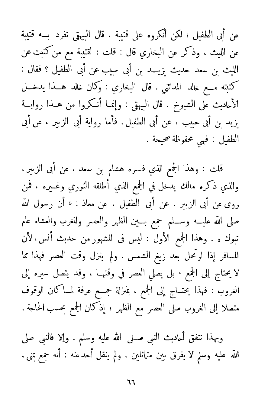 أَبِي الطُّفَيْلِ؛ لَكِنْ أَنْكَرُوهُ عَلَى قُتَيْبَةَ قَالَ البيهقي تَفَرَّدَ بِهِ قُتَيْبَةُ عَنْ اللَّيْثِ وَذَكَرَ عَنْ الْبُخَارِيِّ قَالَ: قُلْت: لقتيبة مَعَ مَنْ كَتَبْت عَنْ اللَّيْثِ بْنِ سَعْدٍ حَدِيثَ يَزِيدَ بْنِ أَبِي حَبِيبٍ عَنْ أَبِي الطُّفَيْلِ؟ فَقَالَ: كَتَبْته مَعَ خَالِدٍ الْمَدَائِنِيِّ. قَالَ الْبُخَارِيُّ: وَكَانَ خَالِدٌ هَذَا يُدْخِلُ الْأَحَادِيثَ عَلَى الشُّيُوخِ. قَالَ البيهقي: وَإِنَّمَا أَنْكَرُوا مِنْ هَذَا رِوَايَةَ يَزِيدَ بْنِ أَبِي حَبِيبٍ عَنْ أَبِي الطُّفَيْلِ. فَأَمَّا رِوَايَةُ أَبِي الزُّبَيْرِ عَنْ أَبِي الطُّفَيْل: فَهِيَ مَحْفُوظَةٌ صَحِيحَةٌ. قُلْت: وَهَذَا الْجَمْعُ الَّذِي فَسَّرَهُ هِشَامُ بْنُ سَعْدٍ عَنْ أَبِي الزُّبَيْرِ وَاَلَّذِي ذَكَرَهُ مَالِكٌ يَدْخُلُ فِي الْجَمْعِ الَّذِي أَطْلَقَهُ الثَّوْرِيُّ وَغَيْرُهُ فَمَنْ رَوَى عَنْ أَبِي الزُّبَيْرِ عَنْ أَبِي الطُّفَيْلِ عَنْ مُعَاذٍ: {أَنَّ رَسُولَ اللَّهِ صَلَّى اللَّهُ عَلَيْهِ وَسَلَّمَ جَمَعَ بَيْنَ الظُّهْرِ وَالْعَصْرِ وَالْمَغْرِبِ وَالْعِشَاءِ عَامَ تَبُوكَ} . وَهَذَا الْجَمْعُ الْأَوَّلُ: لَيْسَ فِي الْمَشْهُورِ مِنْ حَدِيثِ أَنَسٍ لِأَنَّ الْمُسَافِرَ إذَا ارْتَحَلَ بَعْدَ زَيْغِ الشَّمْسِ. وَلَمْ يَنْزِلْ وَقْتَ الْعَصْرِ فَهَذَا مِمَّا لَا يَحْتَاجُ إلَى الْجَمْعِ بَلْ يُصَلِّي الْعَصْرَ فِي وَقْتِهَا وَقَدْ يَتَّصِلُ سَيْرُهُ إلَى الْغُرُوبِ: فَهَذَا يَحْتَاجُ إلَى الْجَمْعِ بِمَنْزِلَةِ جَمْعِ عَرَفَةَ لَمَّا كَانَ الْوُقُوفُ مُتَّصِلًا إلَى الْغُرُوبِ صَلَّى الْعَصْرَ مَعَ الظُّهْرِ؛ إذْ كَانَ الْجَمْعُ بِحَسَبِ الْحَاجَةِ. وَبِهَذَا تَتَّفِقُ أَحَادِيثُ النَّبِيِّ صَلَّى اللَّهُ عَلَيْهِ وَسَلَّمَ. وَإِلَّا فَالنَّبِيُّ صَلَّى اللَّهُ عَلَيْهِ وَسَلَّمَ لَا يُفَرِّقُ بَيْنَ مُتَمَاثِلَيْنِ وَلَمْ يَنْقُلْ أَحَدٌ عَنْهُ: أَنَّهُ جَمَعَ بِمِنًى