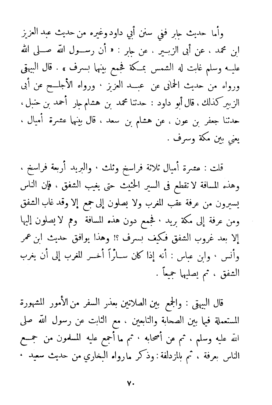 وَأَمَّا حَدِيثُ جَابِرٍ فَفِي سُنَنِ أَبِي دَاوُد وَغَيْرِهِ مِنْ حَدِيثِ عَبْدِ الْعَزِيزِ بْنِ مُحَمَّدٍ عَنْ أَبِي الزُّبَيْرِ عَنْ جَابِرٍ: {أَنَّ رَسُولَ اللَّهِ صَلَّى اللَّهُ عَلَيْهِ وَسَلَّمَ غَابَتْ لَهُ الشَّمْسُ بِمَكَّةَ فَجَمَعَ بَيْنَهُمَا بِسَرَفِ} . قَالَ البيهقي وَرَوَاهُ مِنْ حَدِيثِ الحماني عَنْ عَبْدِ الْعَزِيزِ وَرَوَاهُ الْأَجْلَحُ عَنْ أَبِي الزُّبَيْرِ كَذَلِكَ قَالَ أَبُو دَاوُد: حَدَّثَنَا مُحَمَّدُ بْنُ هِشَامٍ جَارِ أَحْمَد بْنِ حَنْبَلٍ حَدَّثَنَا جَعْفَرُ بْنُ عَوْنٍ. عَنْ هِشَامِ بْنِ سَعْدٍ قَالَ بَيْنَهُمَا عَشَرَةُ أَمْيَالٍ يَعْنِي بَيْنَ مَكَّةَ وَسَرِفٍ. قُلْت: عَشَرَةُ أَمْيَالٍ ثَلَاثَةُ فَرَاسِخَ وَثُلُثٌ وَالْبَرِيدُ أَرْبَعَةُ فَرَاسِخَ وَهَذِهِ الْمَسَافَةُ لَا تُقْطَعُ فِي السَّيْرِ الْحَثِيثِ حَتَّى يَغِيبَ الشَّفَقُ فَإِنَّ النَّاسَ يَسِيرُونَ مِنْ عَرَفَةَ عَقِبَ الْمَغْرِبِ وَلَا يَصِلُونَ إلَى جَمْعٍ إلَّا وَقَدْ غَابَ الشَّفَقُ وَمِنْ عَرَفَةَ إلَى مَكَّةَ بَرِيدٌ فَجَمَعَ دُونَ هَذِهِ الْمَسَافَةِ وَهُمْ لَا يَصِلُونَ إلَيْهَا إلَّا بَعْدَ غُرُوبِ الشَّفَقِ فَكَيْفَ بِسَرِفِ وَهَذَا يُوَافِقُ حَدِيثَ ابْنِ عُمَرَ وَأَنَسٍ وَابْنِ عَبَّاسٍ: أَنَّهُ إذَا كَانَ سَائِرًا أَخَّرَ الْمَغْرِبَ إلَى أَنْ يَغْرُبَ الشَّفَقُ ثُمَّ يُصَلِّيهِمَا جَمِيعًا. قَالَ البيهقي: وَالْجَمْعُ بَيْنَ الصَّلَاتَيْنِ بِعُذْرِ السَّفَرِ مِنْ الْأُمُورِ الْمَشْهُورَةِ الْمُسْتَعْمَلَةِ فِيمَا بَيْنَ الصَّحَابَةِ وَالتَّابِعِينَ مَعَ الثَّابِتِ عَنْ رَسُولِ اللَّهِ صَلَّى اللَّهُ عَلَيْهِ وَسَلَّمَ ثُمَّ عَنْ أَصْحَابِهِ ثُمَّ مَا أَجْمَعَ عَلَيْهِ الْمُسْلِمُونَ مِنْ جَمْعِ النَّاسِ بِعَرَفَةَ ثُمَّ بِالْمُزْدَلِفَةِ: وَذَكَرَ مَا رَوَاهُ الْبُخَارِيُّ مِنْ حَدِيثِ سَعِيدٍ