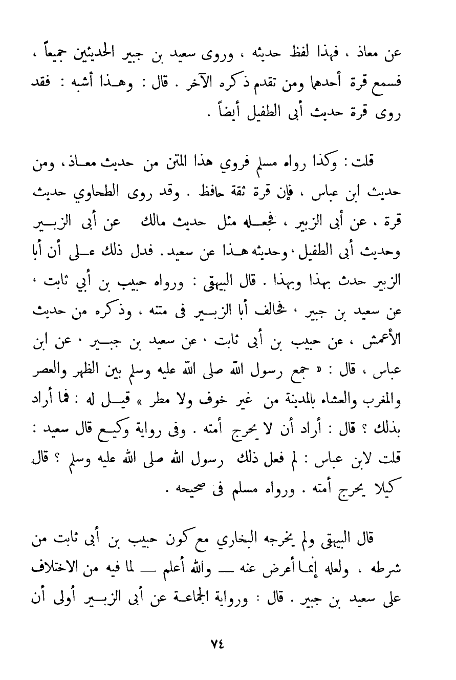 عَنْ مُعَاذٍ فَهَذَا لَفْظُ حَدِيثِهِ وَرَوَى سَعِيدُ بْنُ جُبَيْرٍ الْحَدِيثَيْنِ جَمِيعًا فَسَمِعَ قُرَّةُ أَحَدَهُمَا وَمَنْ تَقَدَّمَ ذَكَرَهُ الْآخَرُ. قَالَ: وَهَذَا أَشْبَهُ: فَقَدْ رَوَى قُرَّةُ حَدِيثَ أَبِي الطُّفَيْلِ أَيْضًا. قُلْت: وَكَذَا رَوَاهُ مُسْلِمٌ فَرُوِيَ هَذَا الْمَتْنُ مِنْ حَدِيثِ مُعَاذٍ وَمِنْ حَدِيثِ ابْنِ عَبَّاسٍ فَإِنَّ قُرَّةَ ثِقَةٌ حَافِظٌ. وَقَدْ رَوَى الطَّحَاوِي حَدِيثَ قُرَّةَ عَنْ أَبِي الزُّبَيْرِ فَجَعَلَهُ مِثْلَ حَدِيثِ مَالِكٍ عَنْ أَبِي الزُّبَيْرِ حَدِيثَ أَبِي الطُّفَيْلِ وَحَدِيثَهُ هَذَا عَنْ سَعِيدٍ. فَدَلَّ ذَلِكَ عَلَى أَنَّ أَبَا الزُّبَيْرِ حَدَّثَ بِهَذَا وَبِهَذَا. قَالَ البيهقي: وَرَوَاهُ حَبِيبُ بْنُ أَبِي ثَابِتٍ عَنْ سَعِيدِ بْنِ جُبَيْرٍ فَخَالَفَ أَبَا الزُّبَيْرِ فِي مَتْنِهِ وَذَكَرَهُ مِنْ حَدِيثِ الْأَعْمَشِ عَنْ حَبِيبِ بْنِ أَبِي ثَابِتٍ عَنْ سَعِيدِ بْنِ جُبَيْرٍ عَنْ ابْنِ عَبَّاسٍ قَالَ: {جَمَعَ رَسُولُ اللَّهِ صَلَّى اللَّهُ عَلَيْهِ وَسَلَّمَ بَيْنَ الظُّهْرِ وَالْعَصْرِ وَالْمَغْرِبِ وَالْعِشَاءِ بِالْمَدِينَةِ مِنْ غَيْرِ خَوْفٍ وَلَا مَطَرٍ} قِيلَ لَهُ: فَمَا أَرَادَ بِذَلِكَ؟ قَالَ: أَرَادَ أَنْ لَا يُحْرِجَ أُمَّتَهُ. وَفِي رِوَايَةِ وَكِيعٍ قَالَ سَعِيدٌ: قُلْت لِابْنِ عَبَّاسٍ: لِمَ فَعَلَ ذَلِكَ رَسُولُ اللَّهِ صَلَّى اللَّهُ عَلَيْهِ وَسَلَّمَ؟ قَالَ كَيْلَا يُحْرِجَ أُمَّتَهُ. وَرَوَاهُ مُسْلِمٌ فِي صَحِيحِهِ. قَالَ البيهقي وَلَمْ يُخْرِجْهُ الْبُخَارِيُّ مَعَ كَوْنِ حَبِيبِ بْنِ أَبِي ثَابِتٍ مِنْ شَرْطِهِ وَلَعَلَّهُ إنَّمَا أَعْرَضَ عَنْهُ - وَاَللَّهُ أَعْلَمُ - لِمَا فِيهِ مِنْ الِاخْتِلَافِ عَلَى سَعِيدِ بْنِ جُبَيْرٍ. قَالَ: وَرِوَايَةُ الْجَمَاعَةِ عَنْ أَبِي الزُّبَيْرِ أَوْلَى أَنْ