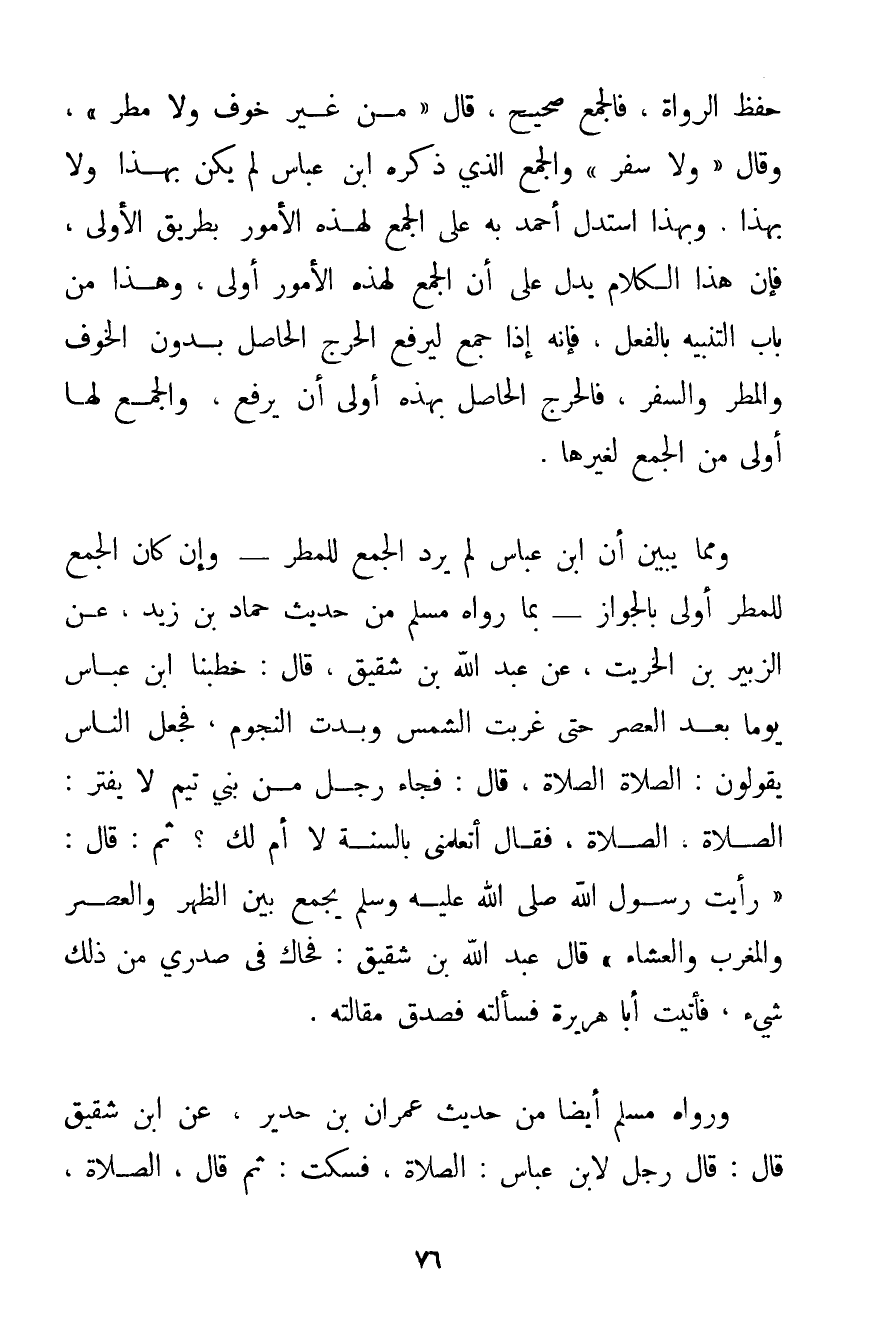حِفْظِ الرُّوَاةِ فَالْجَمْعُ صَحِيحٌ قَالَ {مِنْ غَيْرِ خَوْفٍ وَلَا مَطَرٍ} وَقَالَ " وَلَا سَفَرٍ " وَالْجَمْعُ الَّذِي ذَكَرَهُ ابْنُ عَبَّاسٍ لَمْ يَكُنْ بِهَذَا وَلَا بِهَذَا. وَبِهَذَا اسْتَدَلَّ أَحْمَد بِهِ عَلَى الْجَمْعِ لِهَذِهِ الْأُمُورِ بِطَرِيقِ الْأَوْلَى فَإِنَّ هَذَا الْكَلَامَ يَدُلُّ عَلَى أَنَّ الْجَمْعَ لِهَذِهِ الْأُمُورِ أَوْلَى وَهَذَا مِنْ بَابِ التَّنْبِيهِ بِالْفِعْلِ فَإِنَّهُ إذَا جَمَعَ لِيَرْفَعَ الْحَرَجَ الْحَاصِلَ بِدُونِ الْخَوْفِ وَالْمَطَرِ وَالسَّفَرِ فَالْحَرَجُ الْحَاصِلُ بِهَذِهِ أَوْلَى أَنْ يُرْفَعَ وَالْجَمْعُ لَهَا أَوْلَى مِنْ الْجَمْعِ لِغَيْرِهَا. وَمِمَّا يُبَيِّنُ أَنَّ ابْنَ عَبَّاسٍ لَمْ يُرِدْ الْجَمْعَ لِلْمَطَرِ - وَإِنْ كَانَ الْجَمْعُ لِلْمَطَرِ أَوْلَى بِالْجَوَازِ - بِمَا رَوَاهُ مُسْلِمٌ مِنْ حَدِيثِ حَمَّادِ بْنِ زَيْدٍ عَنْ الزُّبَيْرِ بْنِ الْخِرِّيتِ عَنْ {عَبْدِ اللَّهِ بْنِ شَقِيقٍ قَالَ: خَطَبَنَا ابْنُ عَبَّاسٍ يَوْمًا بَعْدَ الْعَصْرِ حَتَّى غَرَبَتْ الشَّمْسُ وَبَدَتْ النُّجُومُ فَجَعَلَ النَّاسُ يَقُولُونَ: الصَّلَاةَ الصَّلَاةَ قَالَ: فَجَاءَ رَجُلٌ مِنْ بَنِي تَيْمٍ لَا يَفْتُرُ: الصَّلَاةَ الصَّلَاةَ فَقَالَ أَتُعَلِّمُنِي بِالسُّنَّةِ لَا أُمَّ لَك؟ ثُمَّ: قَالَ: رَأَيْت رَسُولَ اللَّهِ صَلَّى اللَّهُ عَلَيْهِ وَسَلَّمَ يَجْمَعُ بَيْنَ الظُّهْرِ وَالْعَصْرِ وَالْمَغْرِبِ وَالْعِشَاءِ} قَالَ عَبْدُ اللَّهِ بْنُ شَقِيقٍ: فَحَاكَ فِي صَدْرِي مِنْ ذَلِكَ شَيْءٌ فَأَتَيْت أَبَا هُرَيْرَةَ فَسَأَلْته فَصَدَّقَ مَقَالَتَهُ. وَرَوَاهُ مُسْلِمٌ أَيْضًا مِنْ حَدِيثِ عِمْرَانَ بْنِ حدير {عَنْ ابْنِ شَقِيقٍ قَالَ: قَالَ رَجُلٌ لِابْنِ عَبَّاسٍ: الصَّلَاةَ فَسَكَتَ: ثُمَّ قَالَ الصَّلَاةَ