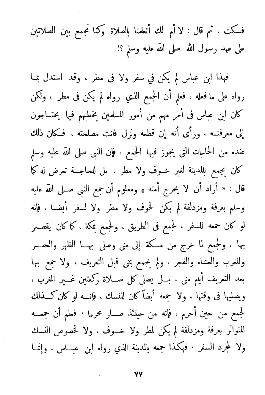 فَسَكَتَ ثُمَّ قَالَ: لَا أُمَّ لَك أَتُعَلِّمُنَا بِالصَّلَاةِ وَكُنَّا نَجْمَعُ بَيْنَ الصَّلَاتَيْنِ عَلَى عَهْدِ رَسُولِ اللَّهِ صَلَّى اللَّهُ عَلَيْهِ وَسَلَّمَ} فَهَذَا ابْنُ عَبَّاسٍ لَمْ يَكُنْ فِي سَفَرٍ وَلَا فِي مَطَرٍ وَقَدْ اسْتَدَلَّ بِمَا رَوَاهُ عَلَى مَا فَعَلَهُ فَعُلِمَ أَنَّ الْجَمْعَ الَّذِي رَوَاهُ لَمْ يَكُنْ فِي مَطَرٍ وَلَكِنْ كَانَ ابْنُ عَبَّاسٍ فِي أَمْرٍ مُهِمٍّ مِنْ أُمُورِ الْمُسْلِمِينَ يَخْطُبُهُمْ فِيمَا يَحْتَاجُونَ إلَى مَعْرِفَتِهِ وَرَأَى أَنَّهُ إنْ قَطَعَهُ وَنَزَلَ فَاتَتْ مَصْلَحَتُهُ فَكَانَ ذَلِكَ عِنْدَهُ مِنْ الْحَاجَاتِ الَّتِي يَجُوزُ فِيهَا الْجَمْعُ فَإِنَّ النَّبِيَّ صَلَّى اللَّهُ عَلَيْهِ وَسَلَّمَ كَانَ يَجْمَعُ بِالْمَدِينَةِ لِغَيْرِ خَوْفٍ وَلَا مَطَرٍ بَلْ لِلْحَاجَةِ تَعْرِضُ لَهُ كَمَا قَالَ: " أَرَادَ أَنْ لَا يُحْرِجَ أُمَّتَهُ " وَمَعْلُومٌ أَنَّ جَمْعَ النَّبِيِّ صَلَّى اللَّهُ عَلَيْهِ وَسَلَّمَ بِعَرَفَةَ وَمُزْدَلِفَةَ لَمْ يَكُنْ لِخَوْفٍ وَلَا مَطَرٍ وَلَا لِسَفَرِ أَيْضًا فَإِنَّهُ لَوْ كَانَ جَمْعُهُ لِلسَّفَرِ لَجَمَعَ فِي الطَّرِيقِ وَلَجَمَعَ بِمَكَّةَ كَمَا كَانَ يَقْصُرُ بِهَا وَلَجَمَعَ لَمَّا خَرَجَ مِنْ مَكَّةَ إلَى مِنًى وَصَلَّى بِهَا الظُّهْرَ وَالْعَصْرَ وَالْمَغْرِبَ وَالْعِشَاءَ وَالْفَجْرَ وَلَمْ يَجْمَعْ بِمِنَى قَبْلَ التَّعْرِيفِ وَلَا جَمَعَ بِهَا بَعْدَ التَّعْرِيفِ أَيَّامَ مِنًى بَلْ يُصَلِّي كُلَّ صَلَاةٍ رَكْعَتَيْنِ غَيْرَ الْمَغْرِبِ وَيُصَلِّيهَا فِي وَقْتِهَا وَلَا جَمْعُهُ أَيْضًا كَانَ لِلنُّسُكِ فَإِنَّهُ لَوْ كَانَ كَذَلِكَ لَجَمَعَ مِنْ حِينِ أَحْرَمَ فَإِنَّهُ مِنْ حِينَئِذٍ صَارَ مُحْرِمَا فَعُلِمَ أَنَّ جَمْعَهُ الْمُتَوَاتِرَ بِعَرَفَةَ وَمُزْدَلِفَةَ لَمْ يَكُنْ لِمَطَرٍ وَلَا خَوْفٍ وَلَا لِخُصُوصِ النُّسُكِ وَلَا لِمُجَرَّدِ السَّفَرِ فَهَكَذَا جَمْعُهُ بِالْمَدِينَةِ الَّذِي رَوَاهُ ابْنُ عَبَّاسٍ وَإِنَّمَا