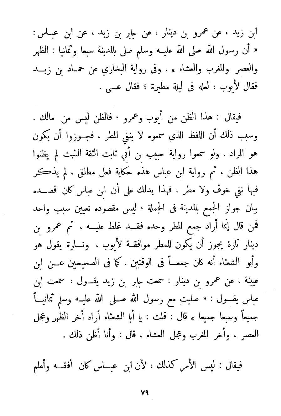 ابْنِ زَيْدٍ عَنْ عَمْرِو بْنِ دِينَارٍ عَنْ جَابِرِ بْنِ زَيْدٍ عَنْ ابْنِ عَبَّاسٍ: {أَنَّ رَسُولَ اللَّهِ صَلَّى اللَّهُ عَلَيْهِ وَسَلَّمَ صَلَّى بِالْمَدِينَةِ سَبْعًا وَثَمَانِيًا: الظُّهْرَ وَالْعَصْرَ وَالْمَغْرِبَ وَالْعِشَاءَ} . وَفِي رِوَايَةِ الْبُخَارِيِّ عَنْ حَمَّادِ بْنِ زَيْدٍ فَقَالَ لِأَيُّوبِ: لَعَلَّهُ فِي لَيْلَةٍ مَطِيرَةٍ؟ فَقَالَ عَسَى. فَيُقَالُ: هَذَا الظَّنُّ مِنْ أَيُّوبَ وَعَمْرٍو فَالظَّنُّ لَيْسَ مِنْ مَالِكٍ. وَسَبَبُ ذَلِكَ أَنَّ اللَّفْظَ الَّذِي سَمِعُوهُ لَا يَنْفِي الْمَطَرَ فَجَوَّزُوا أَنْ يَكُونَ هُوَ الْمُرَادَ وَلَوْ سَمِعُوا رِوَايَةَ حَبِيبِ بْنِ أَبِي ثَابِتٍ الثِّقَةِ الثَّبْتِ لَمْ يَظُنُّوا هَذَا الظَّنَّ ثُمَّ رِوَايَةُ ابْنِ عَبَّاسٍ هَذِهِ حِكَايَةُ فِعْلٍ مُطْلَقٍ لِمَ ذَكَرَ فِيهَا نَفْيَ خَوْفٍ وَلَا مَطَرٍ فَهَذَا يَدُلُّك عَلَى أَنَّ ابْنَ عَبَّاسٍ كَانَ قَصْدُهُ بَيَانَ جَوَازِ الْجَمْعِ بِالْمَدِينَةِ فِي الْجُمْلَةِ لَيْسَ مَقْصُودُهُ تَعْيِينَ سَبَبٍ وَاحِدٍ فَمَنْ قَالَ إنَّمَا أَرَادَ جَمْعَ الْمَطَرِ وَحْدَهُ فَقَدْ غَلِطَ عَلَيْهِ ثُمَّ عَمْرُو بْنُ دِينَارٍ تَارَةً يُجَوِّزُ أَنْ يَكُونَ لِلْمَطَرِ مُوَافَقَةً لِأَيُّوبِ وَتَارَةً يَقُولُ هُوَ وَأَبُو الشَّعْثَاءِ أَنَّهُ كَانَ جَمْعًا فِي الْوَقْتَيْنِ كَمَا فِي الصَّحِيحَيْنِ عَنْ ابْنِ عُيَيْنَة عَنْ {عَمْرِو بْنِ دِينَارٍ: سَمِعْت جَابِرَ بْنَ زَيْدٍ يَقُولُ: سَمِعْت ابْنَ عَبَّاسٍ يَقُولُ: صَلَّيْت مَعَ رَسُولِ اللَّهِ صَلَّى اللَّهُ عَلَيْهِ وَسَلَّمَ ثَمَانِيًا جَمِيعًا وَسَبْعًا جَمِيعًا قَالَ: قُلْت: يَا أَبَا الشَّعْثَاءِ أَرَاهُ أَخَّرَ الظُّهْرَ وَعَجَّلَ الْعَصْرَ وَأَخَّرَ الْمَغْرِبَ وَعَجَّلَ الْعِشَاءَ قَالَ: وَأَنَا أَظُنُّ ذَلِكَ} . فَيُقَالُ: لَيْسَ الْأَمْرُ كَذَلِكَ؛ لِأَنَّ ابْنَ عَبَّاسٍ كَانَ أَفْقَهَ وَأَعْلَمَ
