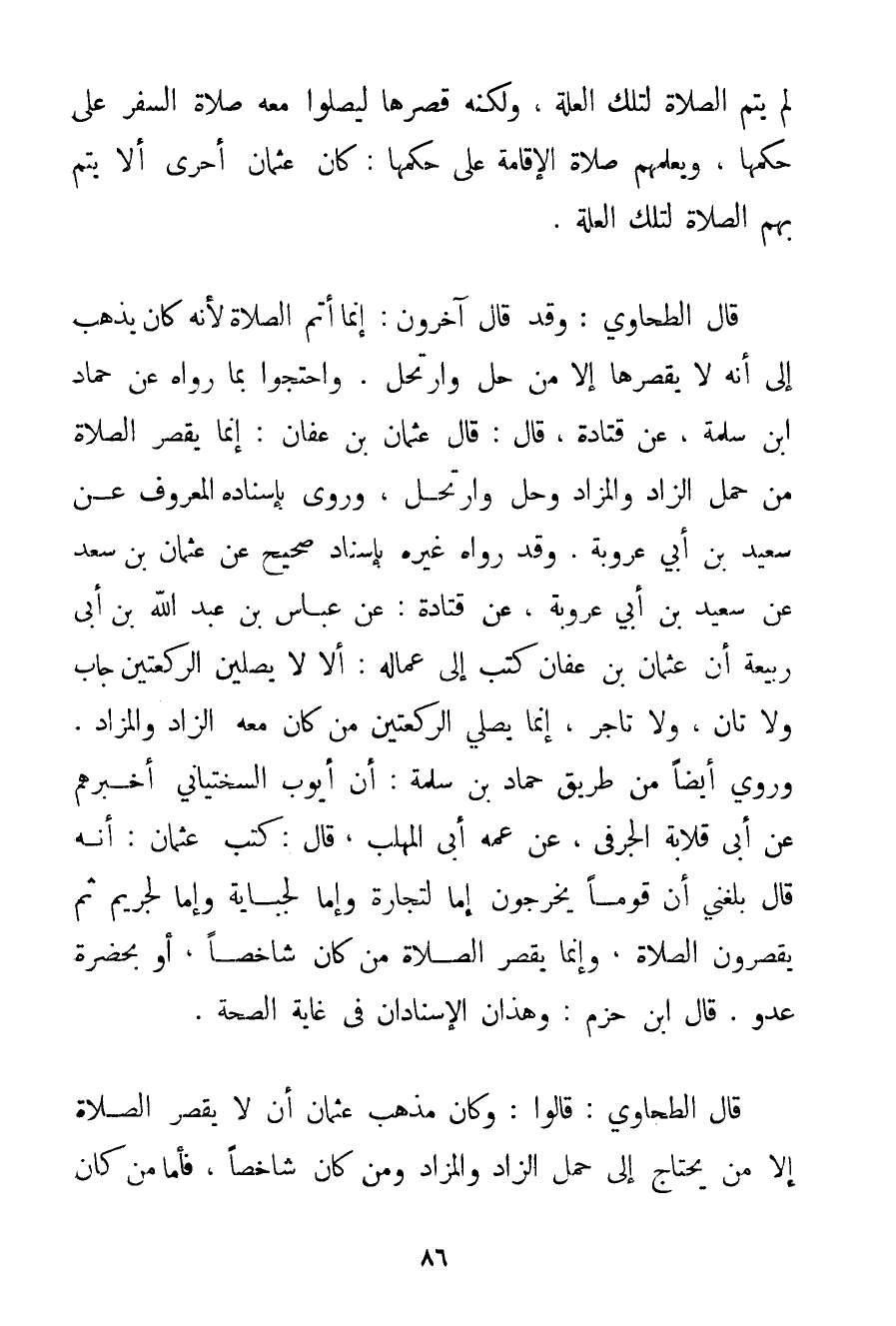 لَمْ يُتِمَّ الصَّلَاةَ لِتِلْكَ الْعِلَّةِ وَلَكِنَّهُ قَصَرَهَا لِيُصَلُّوا مَعَهُ صَلَاةَ السَّفَرِ عَلَى حُكْمِهَا وَيُعَلِّمَهُمْ صَلَاةَ الْإِقَامَةِ عَلَى حُكْمِهَا: كَانَ عُثْمَانُ أَحْرَى أَلَّا يُتِمَّ بِهِمْ الصَّلَاةَ لِتِلْكَ الْعِلَّةِ. قَالَ الطَّحَاوِي: وَقَدْ قَالَ آخَرُونَ: إنَّمَا أَتَمَّ الصَّلَاةَ لِأَنَّهُ كَانَ يَذْهَبُ إلَى أَنَّهُ لَا يَقْصُرُهَا إلَّا مَنْ حَلَّ وَارْتَحَلَ. وَاحْتَجُّوا بِمَا رَوَاهُ عَنْ حَمَّادِ بْنِ سَلَمَةَ عَنْ قتادة قَالَ: قَالَ عُثْمَانُ بْنُ عفان: إنَّمَا يَقْصُرُ الصَّلَاةَ مَنْ حَمَلَ الزَّادَ وَالْمَزَادَ وَحَلَّ وَارْتَحَلَ وَرُوِيَ بِإِسْنَادِهِ الْمَعْرُوفِ عَنْ سَعِيدِ بْنِ أَبِي عَرُوبَةَ. وَقَدْ رَوَاهُ غَيْرُهُ بِإِسْنَادٍ صَحِيحٍ عَنْ [عُثْمَانَ بْنِ سَعْدٍ] (1) عَنْ سَعِيدِ بْنِ أَبِي عَرُوبَةَ عَنْ قتادة: عَنْ عَيَّاشِ بْنِ عَبْدِ اللَّهِ بْنِ أَبِي رَبِيعَةَ أَنَّ عُثْمَانَ بْنَ عفان كَتَبَ إلَى عُمَّالِهِ: أَلَا لَا يُصَلِّيَن الرَّكْعَتَيْنِ جَابٍ [وَلَا تان] (2) وَلَا تَاجِرٌ إنَّمَا يُصَلِّي الرَّكْعَتَيْنِ مَنْ كَانَ مَعَهُ الزَّادُ وَالْمَزَادُ. وَرُوِيَ أَيْضًا مِنْ طَرِيقِ حَمَّادِ بْنِ سَلَمَةَ: أَنَّ أَيُّوبَ السختياني أَخْبَرَهُمْ عَنْ أَبِي قِلاَبَة الجرمي عَنْ عَمِّهِ أَبِي الْمُهَلَّبِ قَالَ: كَتَبَ عُثْمَانُ: أَنَّهُ قَالَ بَلَغَنِي أَنَّ قَوْمًا يَخْرُجُونَ إمَّا لِتِجَارَةِ وَإِمَّا لِجِبَايَةِ وَإِمَّا [لِجَرِيمٍ] (3) ثُمَّ يَقْصُرُونَ الصَّلَاةَ وَإِنَّمَا يَقْصُرُ الصَّلَاةَ مَنْ كَانَ شَاخِصًا أَوْ بِحَضْرَةِ عَدُوٍّ. قَالَ ابْنُ حَزْمٍ: وَهَذَانِ الْإِسْنَادَانِ فِي غَايَةِ الصِّحَّةِ. قَالَ الطَّحَاوِي: قَالُوا: وَكَانَ مَذْهَبُ عُثْمَانَ أَنْ لَا يَقْصُرَ الصَّلَاةَ إلَّا مَنْ يَحْتَاجُ إلَى حَمْلِ الزَّادِ وَالْمَزَادِ وَمَنْ كَانَ شَاخِصًا فَأَمَّا مَنْ كَانَ