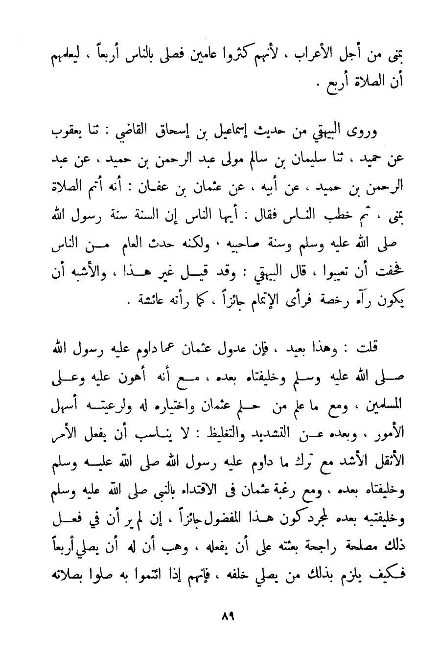 بِمِنَى مِنْ أَجْلِ الْأَعْرَابِ لِأَنَّهُمْ كَثُرُوا [عَامَئِذٍ] (1) فَصَلَّى بِالنَّاسِ أَرْبَعًا لِيُعْلِمَهُمْ أَنَّ الصَّلَاةَ أَرْبَعٌ. وَرَوَى البيهقي مِنْ حَدِيثِ [مُوسَى] (2) بْنِ إسْحَاقَ الْقَاضِي: ثَنَا [يَعْقُوبُ بْنُ حُمَيْدٍ] (3) ثَنَا سُلَيْمَانُ بْنُ سَالِمٍ مَوْلَى عَبْدِ الرَّحْمَنِ بْنِ حميد عَنْ عَبْدِ الرَّحْمَنِ بْنِ حميد عَنْ أَبِيهِ عَنْ عُثْمَانَ بْنِ عفان: أَنَّهُ أَتَمَّ الصَّلَاةَ بِمِنَى ثُمَّ خَطَبَ النَّاسَ فَقَالَ: أَيُّهَا النَّاسُ إنَّ السُّنَّةَ سُنَّةُ رَسُولِ اللَّهِ صَلَّى اللَّهُ عَلَيْهِ وَسَلَّمَ وَسُنَّةُ صَاحِبَيْهِ وَلَكِنَّهُ حَدَثَ [طَغَام] (4) مِنْ النَّاسِ فَخِفْت أَنْ [يَسْتَنُّوا] (5)) قَالَ البيهقي: وَقَدْ قِيلَ غَيْرُ هَذَا وَالْأَشْبَهُ أَنْ يَكُونَ رَآهُ رُخْصَةً فَرَأَى الْإِتْمَامَ جَائِزًا كَمَا رَأَتْهُ عَائِشَةُ. قُلْت: وَهَذَا بَعِيدٌ فَإِنَّ عُدُولَ عُثْمَانَ عَمَّا دَاوَمَ عَلَيْهِ رَسُولُ اللَّهِ صَلَّى اللَّهُ عَلَيْهِ وَسَلَّمَ وَخَلِيفَتَاهُ بَعْدَهُ مَعَ أَنَّهُ أَهْوَنُ عَلَيْهِ وَعَلَى الْمُسْلِمِينَ وَمَعَ مَا عُلِمَ مِنْ حِلْمِ عُثْمَانَ وَاخْتِيَارِهِ لَهُ وَلِرَعِيَّتِهِ أَسْهَلُ الْأُمُورِ وَبُعْدُهُ عَنْ التَّشْدِيدِ وَالتَّغْلِيظِ: لَا يُنَاسِبُ أَنْ يَفْعَلَ الْأَمْرَ الْأَثْقَلَ الْأَشَدَّ مَعَ تَرْكِ مَا دَاوَمَ عَلَيْهِ رَسُولُ اللَّهِ صَلَّى اللَّهُ عَلَيْهِ وَسَلَّمَ وَخَلِيفَتَاهُ بَعْدَهُ وَمَعَ رَغْبَةِ عُثْمَانَ فِي الِاقْتِدَاءِ بِالنَّبِيِّ صَلَّى اللَّهُ عَلَيْهِ وَسَلَّمَ وَخَلِيفَتَيْهِ بَعْدَهُ لِمُجَرَّدِ كَوْنِ هَذَا الْمَفْضُولِ جَائِزًا إنْ لَمْ يَرَ أَنَّ فِي فِعْلِ ذَلِكَ مَصْلَحَةً رَاجِحَةً بَعَثَتْهُ عَلَى أَنْ يَفْعَلَهُ وَهَبْ أَنَّ لَهُ أَنْ يُصَلِّيَ أَرْبَعًا فَكَيْفَ يُلْزِمُ بِذَلِكَ مَنْ يُصَلِّي خَلْفَهُ فَإِنَّهُمْ إذَا ائْتَمُّوا بِهِ صَلَّوْا بِصَلَاتِهِ