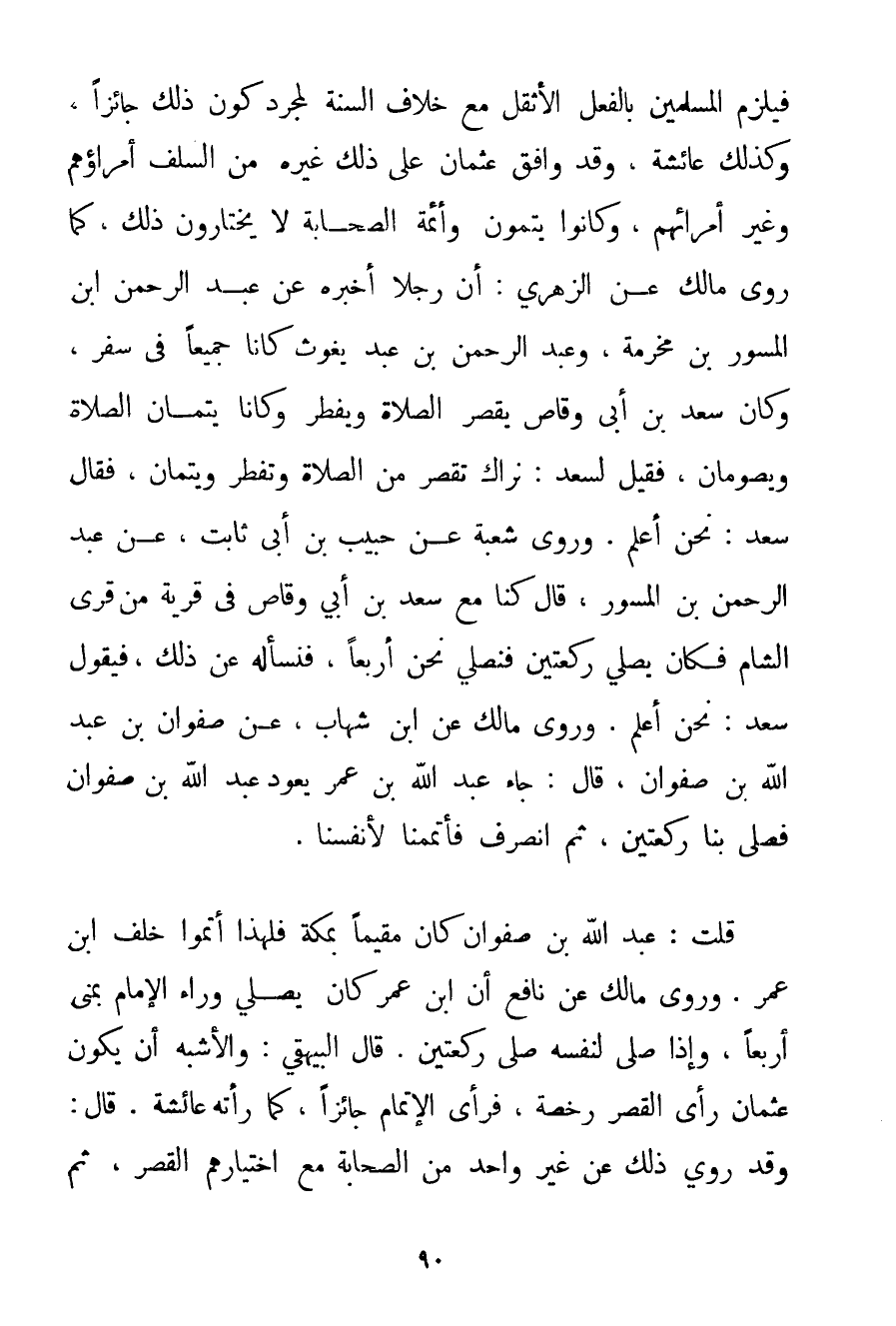 فَيُلْزِمُ الْمُسْلِمِينَ بِالْفِعْلِ الْأَثْقَلِ مَعَ خِلَافِ السُّنَّةِ لِمُجَرَّدِ كَوْنِ ذَلِكَ جَائِزًا وَكَذَلِكَ عَائِشَةُ وَقَدْ وَافَقَ عُثْمَانَ عَلَى ذَلِكَ غَيْرُهُ مِنْ السَّلَفِ أُمَرَاؤُهُمْ وَغَيْرُ أُمَرَائِهِمْ وَكَانُوا يُتِمُّونَ وَأَئِمَّةُ الصَّحَابَةِ لَا يَخْتَارُونَ ذَلِكَ كَمَا رَوَى مَالِكٌ عَنْ الزُّهْرِيِّ: أَنَّ رَجُلًا أَخْبَرَهُ عَنْ عَبْدِ الرَّحْمَنِ بْنِ الْمِسْوَرِ بْنِ مخرمة وَعَبْدِ الرَّحْمَنِ بْنِ عَبْدِ يَغُوثَ كَانَا جَمِيعًا فِي سَفَرٍ وَكَانَ سَعْدُ بْنُ أَبِي وَقَّاصٍ يُقْصِرُ الصَّلَاةَ وَيُفْطِرُ وَكَانَا يُتِمَّانِ الصَّلَاةَ وَيَصُومَانِ فَقِيلَ لِسَعْدِ: نَرَاك تُقْصِرُ مِنْ الصَّلَاةِ وَتُفْطِرُ وَيُتِمَّانِ فَقَالَ سَعْدٌ: نَحْنُ أَعْلَمُ. وَرَوَى شُعْبَةُ عَنْ حَبِيبِ بْنِ أَبِي ثَابِتٍ عَنْ عَبْدِ الرَّحْمَنِ بْنِ الْمِسْوَرِ قَالَ كُنَّا مَعَ سَعْدِ بْنِ أَبِي وَقَّاصٍ فِي قَرْيَةٍ مِنْ قُرَى الشَّامِ فَكَانَ يُصَلِّي رَكْعَتَيْنِ فَنُصَلِّي نَحْنُ أَرْبَعًا فَنَسْأَلُهُ عَنْ ذَلِكَ فَيَقُولُ سَعْدٌ: نَحْنُ أَعْلَمُ. وَرَوَى مَالِكٌ عَنْ ابْنِ شِهَابٍ عَنْ صَفْوَانَ بْنِ عَبْدِ اللَّهِ بْنِ صَفْوَانَ قَالَ: جَاءَ عَبْدُ اللَّهِ بْنُ عُمَرَ يَعُودُ عَبْدَ اللَّهِ بْنَ صَفْوَانَ فَصَلَّى بِنَا رَكْعَتَيْنِ ثُمَّ انْصَرَفَ فَأَتْمَمْنَا لِأَنْفُسِنَا. قُلْت: عَبْدُ اللَّهِ بْنُ صَفْوَانَ كَانَ مُقِيمًا بِمَكَّةَ فَلِهَذَا أَتَمُّوا خَلْفَ ابْنِ عُمَرَ. وَرَوَى مَالِكٌ عَنْ نَافِعٍ أَنَّ ابْنَ عُمَرَ كَانَ يُصَلِّي وَرَاءَ الْإِمَامِ بِمِنَى أَرْبَعًا وَإِذَا صَلَّى لِنَفْسِهِ صَلَّى رَكْعَتَيْنِ. قَالَ البيهقي: وَالْأَشْبَهُ أَنْ يَكُونَ عُثْمَانُ رَأَى الْقَصْرَ رُخْصَةً فَرَأَى الْإِتْمَامَ جَائِزًا كَمَا رَأَتْهُ عَائِشَةُ. قَالَ: وَقَدْ رُوِيَ ذَلِكَ عَنْ غَيْرِ وَاحِدٍ مِنْ الصَّحَابَةِ مَعَ اخْتِيَارِهِمْ الْقَصْرَ ثُمَّ