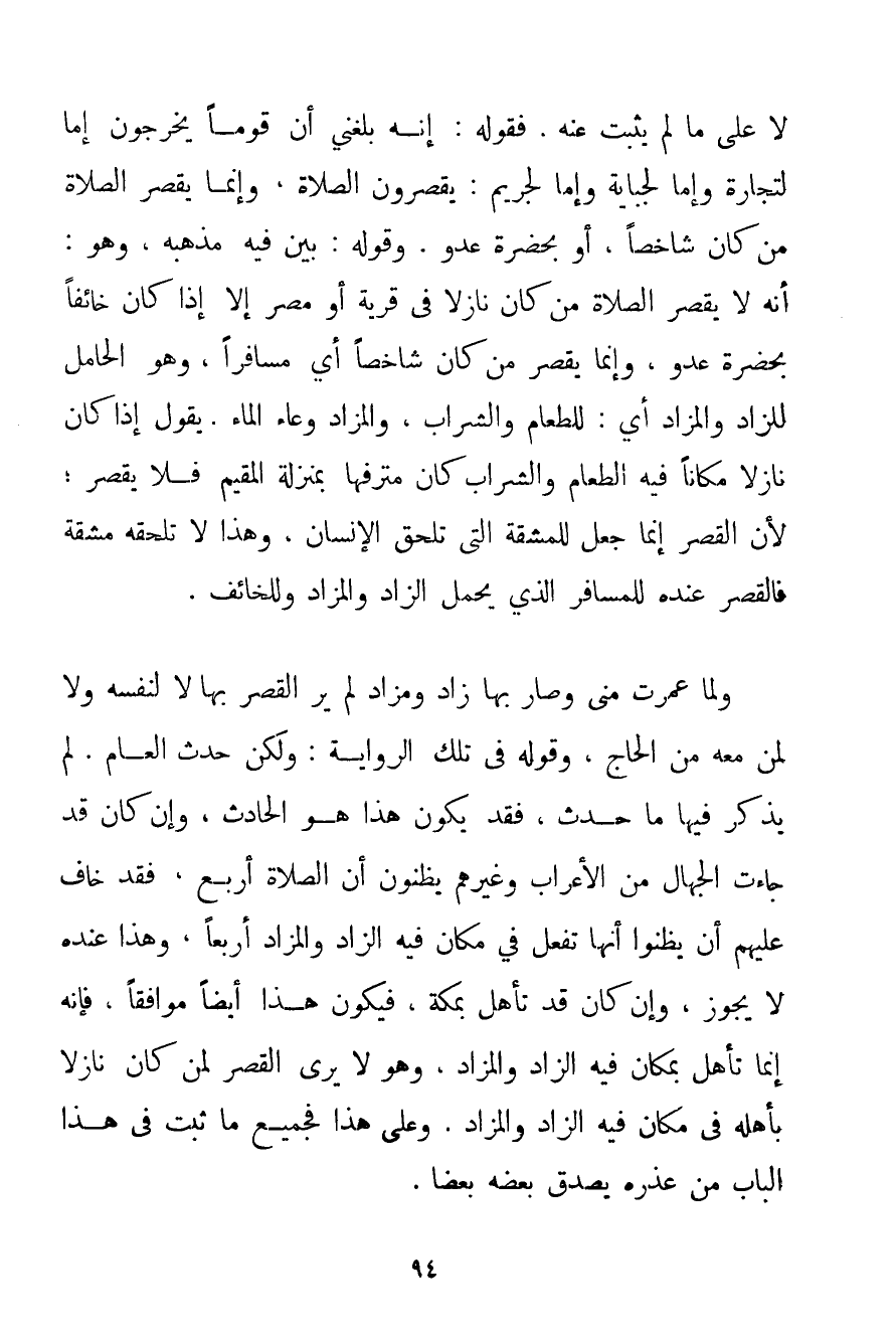 لَا عَلَى مَا لَمْ يَثْبُتْ عَنْهُ. فَقَوْلُهُ: إنَّهُ بَلَغَنِي أَنَّ قَوْمًا يَخْرُجُونَ إمَّا لِتِجَارَةِ وَإِمَّا لِجِبَايَةِ وَإِمَّا لِجَرِيمِ: يَقْصُرُونَ الصَّلَاةَ وَإِنَّمَا يَقْصُرُ الصَّلَاةَ مَنْ كَانَ شَاخِصًا أَوْ بِحَضْرَةِ عَدُوٍّ. وَقَوْلُهُ: بَيَّنَ فِيهِ مَذْهَبَهُ وَهُوَ: أَنَّهُ لَا يَقْصُرُ الصَّلَاةَ مَنْ كَانَ نَازِلًا فِي قَرْيَةٍ أَوْ مِصْرٍ إلَّا إذَا كَانَ خَائِفًا بِحَضْرَةِ عَدُوٍّ وَإِنَّمَا يَقْصُرُ مَنْ كَانَ شَاخِصًا أَيْ مُسَافِرًا وَهُوَ الْحَامِلُ لِلزَّادِ وَالْمَزَادِ أَيْ: لِلطَّعَامِ وَالشَّرَابِ وَالْمَزَادُ وِعَاءُ الْمَاءِ. يَقُولُ إذَا كَانَ نَازِلًا مَكَانًا فِيهِ الطَّعَامُ وَالشَّرَابُ كَانَ مُتَرَفِّهًا بِمَنْزِلَةِ الْمُقِيمِ فَلَا يَقْصُرُ؛ لِأَنَّ الْقَصْرَ إنَّمَا جُعِلَ لِلْمَشَقَّةِ الَّتِي تَلْحَقُ الْإِنْسَانَ وَهَذَا لَا تَلْحَقُهُ مَشَقَّةٌ فَالْقَصْرُ عِنْدَهُ لِلْمُسَافِرِ الَّذِي يَحْمِلُ الزَّادَ وَالْمَزَادَ وَلِلْخَائِفِ. وَلَمَّا عَمُرَتْ مِنًى وَصَارَ بِهَا زَادٌ وَمَزَادٌ لَمْ يَرَ الْقَصْرَ بِهَا لَا لِنَفْسِهِ وَلَا لِمَنْ مَعَهُ مِنْ الْحَاجِّ وَقَوْلُهُ فِي تِلْكَ الرِّوَايَةِ: وَلَكِنْ حَدَثَ الْعَامُ لَمْ يَذْكُرْ فِيهَا مَا حَدَثَ فَقَدْ يَكُونُ هَذَا هُوَ الْحَادِثَ وَإِنْ كَانَ قَدْ جَاءَتْ الْجُهَّالُ مِنْ الْأَعْرَابِ وَغَيْرِهِمْ يَظُنُّونَ أَنَّ الصَّلَاةَ أَرْبَعٌ فَقَدْ خَافَ عَلَيْهِمْ أَنْ يَظُنُّوا أَنَّهَا تُفْعَلُ فِي مَكَانٍ فِيهِ الزَّادُ وَالْمَزَادُ أَرْبَعًا وَهَذَا عِنْدَهُ لَا يَجُوزُ وَإِنْ كَانَ قَدْ تَأَهَّلَ بِمَكَّةَ فَيَكُونُ هَذَا أَيْضًا مُوَافِقًا فَإِنَّهُ إنَّمَا تَأَهَّلَ بِمَكَانٍ فِيهِ الزَّادُ وَالْمَزَادُ وَهُوَ لَا يَرَى الْقَصْرَ لِمَنْ كَانَ نَازِلًا بِأَهْلِهِ فِي مَكَانٍ فِيهِ الزَّادُ وَالْمَزَادُ. وَعَلَى هَذَا فَجَمِيعُ مَا ثَبَتَ فِي هَذَا الْبَابِ مِنْ عُذْرِهِ يُصَدِّقُ بَعْضُهُ بَعْضًا.