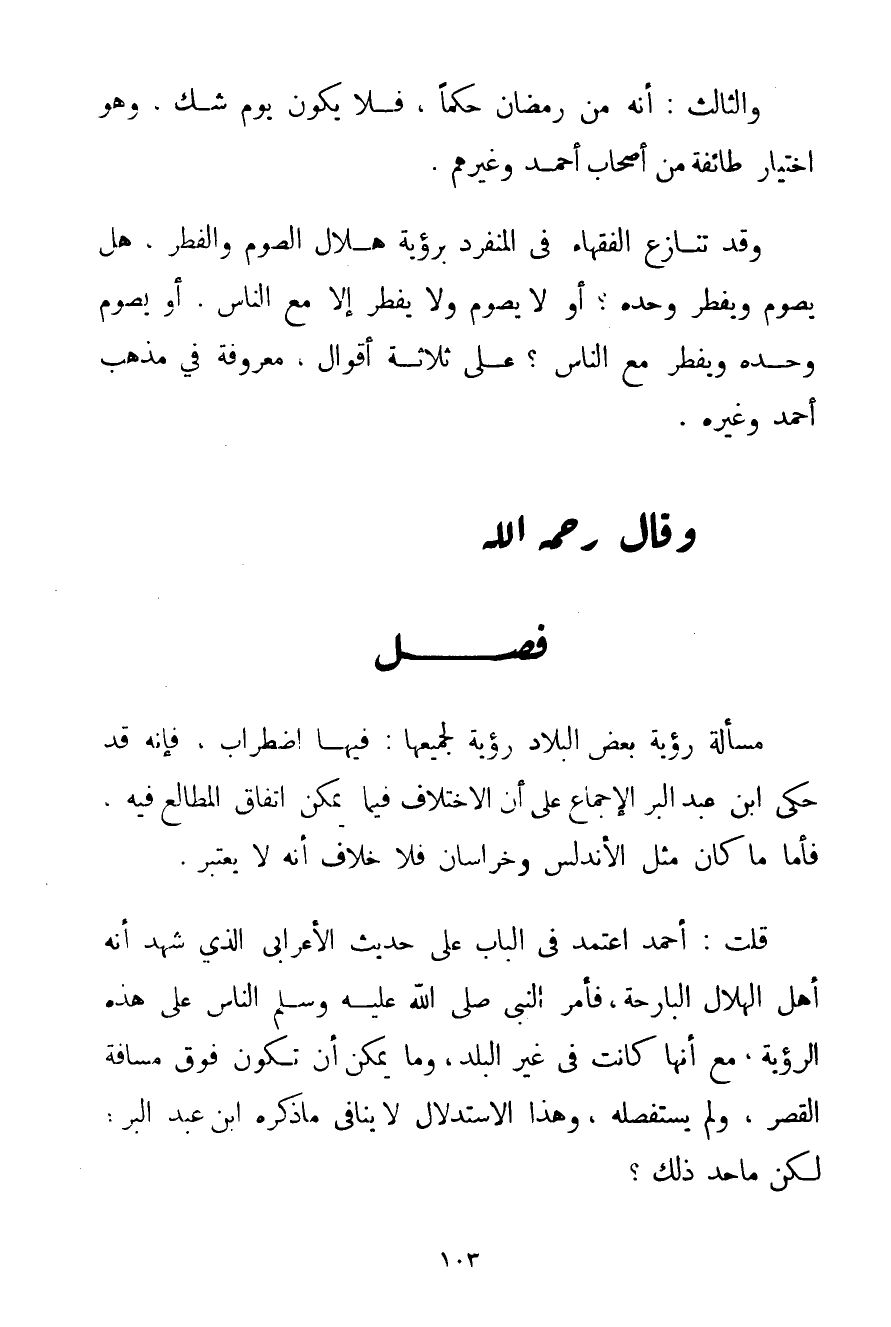 وَالثَّالِثُ: أَنَّهُ مِنْ رَمَضَانَ حُكْمًا فَلَا يَكُونُ يَوْمَ شَكٍّ وَهُوَ اخْتِيَارُ طَائِفَةٍ مِنْ أَصْحَابِ أَحْمَد وَغَيْرِهِمْ. وَقَدْ تَنَازَعَ الْفُقَهَاءُ فِي الْمُنْفَرِدِ بِرُؤْيَةِ هِلَالِ الصَّوْمِ وَالْفِطْرِ هَلْ يَصُومُ وَيُفْطِرُ وَحْدَهُ؟ أَوْ لَا يَصُومُ وَلَا يُفْطِرُ إلَّا مَعَ النَّاسِ؟ أَوْ يَصُومُ وَحْدَهُ وَيُفْطِرُ مَعَ النَّاسِ؟ عَلَى ثَلَاثَةِ أَقْوَالٍ مَعْرُوفَةٍ فِي مَذْهَبِ أَحْمَد وَغَيْرِهِ.