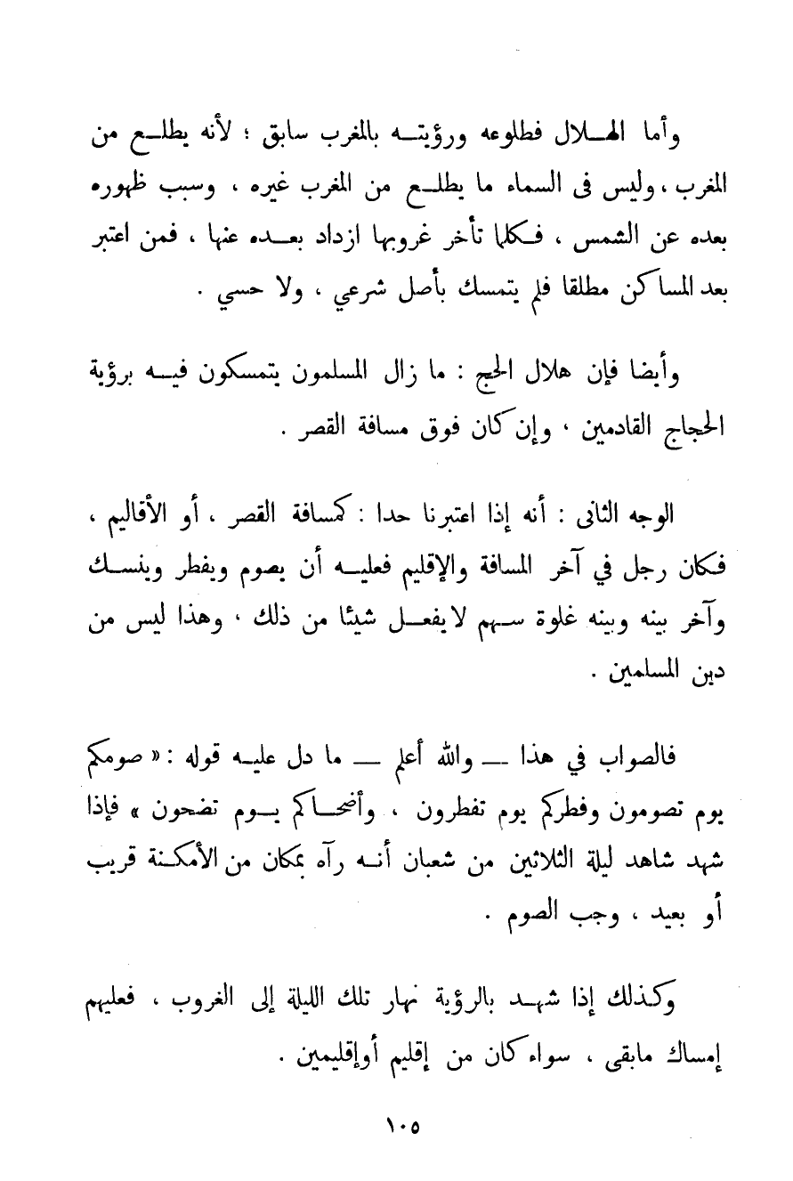 وَأَمَّا الْهِلَالُ فَطُلُوعُهُ وَرُؤْيَتُهُ بِالْمَغْرِبِ سَابِقٌ؛ لِأَنَّهُ يَطْلُعُ مِنْ الْمَغْرِبِ وَلَيْسَ فِي السَّمَاءِ مَا يَطْلُعُ مِنْ الْمَغْرِبِ غَيْرُهُ وَسَبَبُ ظُهُورِهِ بُعْدُهُ عَنْ الشَّمْسِ فَكُلَّمَا تَأَخَّرَ غُرُوبُهَا ازْدَادَ بُعْدُهُ عَنْهَا فَمَنْ اعْتَبَرَ بُعْدَ الْمَسَاكِنِ مُطْلَقًا فَلَمْ يَتَمَسَّكْ بِأَصْلِ شَرْعِيٍّ وَلَا حِسِّيٍّ. وَأَيْضًا فَإِنَّ هِلَالَ الْحَجِّ: مَا زَالَ الْمُسْلِمُونَ يَتَمَسَّكُونَ فِيهِ بِرُؤْيَةِ الْحُجَّاجِ الْقَادِمِينَ وَإِنْ كَانَ فَوْقَ مَسَافَةِ الْقَصْرِ. الْوَجْهُ الثَّانِي: أَنَّهُ إذَا اعْتَبَرْنَا حَدًّا: كَمَسَافَةِ الْقَصْرِ أَوْ الْأَقَالِيمَ فَكَانَ رَجُلٌ فِي آخِرِ الْمَسَافَةِ وَالْإِقْلِيمِ فَعَلَيْهِ أَنْ يَصُومَ وَيُفْطِرَ وَيَنْسُكَ وَآخَرُ بَيْنَهُ وَبَيْنَهُ غَلْوَةُ سَهْمٍ لَا يَفْعَلُ شَيْئًا مِنْ ذَلِكَ وَهَذَا لَيْسَ مِنْ دِينِ الْمُسْلِمِينَ. فَالصَّوَابُ فِي هَذَا - وَاَللَّهُ أَعْلَمُ مَا دَلَّ عَلَيْهِ قَوْلُهُ: {صَوْمُكُمْ يَوْمَ تَصُومُونَ وَفِطْرُكُمْ يَوْمَ تُفْطِرُونَ وَأَضْحَاكُمْ يَوْمَ تُضَحُّونَ} فَإِذَا شَهِدَ شَاهِدٌ لَيْلَةَ الثَّلَاثِينَ مِنْ شَعْبَانَ أَنَّهُ رَآهُ بِمَكَانِ مِنْ الْأَمْكِنَةِ قَرِيبٍ أَوْ بَعِيدٍ وَجَبَ الصَّوْمُ. وَكَذَلِكَ إذَا شَهِدَ بِالرُّؤْيَةِ نَهَارَ تِلْكَ اللَّيْلَةِ إلَى الْغُرُوبِ فَعَلَيْهِمْ إمْسَاكُ مَا بَقِيَ سَوَاءٌ كَانَ مِنْ إقْلِيمٍ أَوْ إقْلِيمَيْنِ.