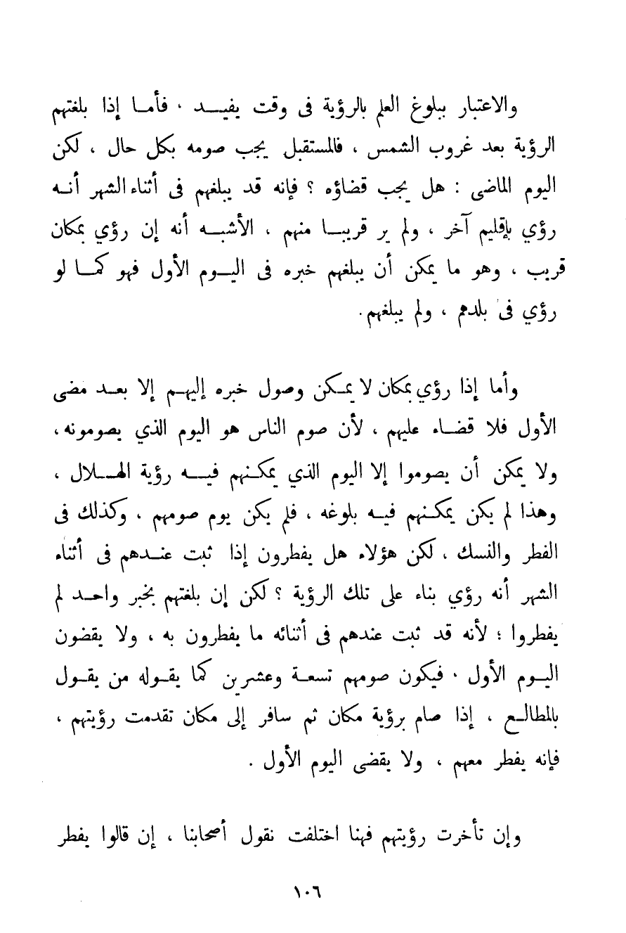 وَأَمَّا إذَا رُئِيَ بِمَكَانٍ لَا يُمْكِنُ وُصُولُ خَبَرِهِ إلَيْهِمْ إلَّا بَعْدَ مُضِيِّ الْأَوَّلِ فَلَا قَضَاءَ عَلَيْهِمْ لِأَنَّ صَوْمَ النَّاسِ هُوَ الْيَوْمُ الَّذِي يَصُومُونَهُ وَلَا يُمْكِنُ أَنْ يَصُومُوا إلَّا الْيَوْمَ الَّذِي يُمْكِنُهُمْ فِيهِ رُؤْيَةُ الْهِلَالِ وَهَذَا لَمْ يَكُنْ يُمْكِنُهُمْ فِيهِ بُلُوغُهُ فَلَمْ يَكُنْ يَوْمَ صَوْمِهِمْ وَكَذَلِكَ فِي الْفِطْرِ وَالنُّسُكِ لَكِنَّ هَؤُلَاءِ هَلْ يُفْطِرُونَ إذَا ثَبَتَ عِنْدَهُمْ فِي أَثْنَاءِ الشَّهْرِ أَنَّهُ رُئِيَ بِنَاءً عَلَى تِلْكَ الرُّؤْيَةِ؟ لَكِنْ إنْ بَلَغَتْهُمْ بِخَبَرِ وَاحِدٍ لَمْ يُفْطِرُوا؛ لِأَنَّهُ قَدْ ثَبَتَ عِنْدَهُمْ فِي أَثْنَائِهِ مَا يُفْطِرُونَ بِهِ وَلَا يَقْضُونَ الْيَوْمَ الْأَوَّلَ فَيَكُونُ صَوْمُهُمْ تِسْعَةً وَعِشْرِينَ كَمَا يَقُولُهُ مَنْ يَقُولُ بِالْمَطَالِعِ إذَا صَامَ بِرُؤْيَةِ مَكَانٍ ثُمَّ سَافَرَ إلَى مَكَانٍ تَقَدَّمَتْ رُؤْيَتُهُمْ فَإِنَّهُ يُفْطِرُ مَعَهُمْ وَلَا يَقْضِي الْيَوْمَ الْأَوَّلَ. وَإِنْ تَأَخَّرَتْ رُؤْيَتُهُمْ فَهُنَا اخْتَلَفَتْ نُقُولُ أَصْحَابِنَا إنْ قَالُوا يُفْطِرُ