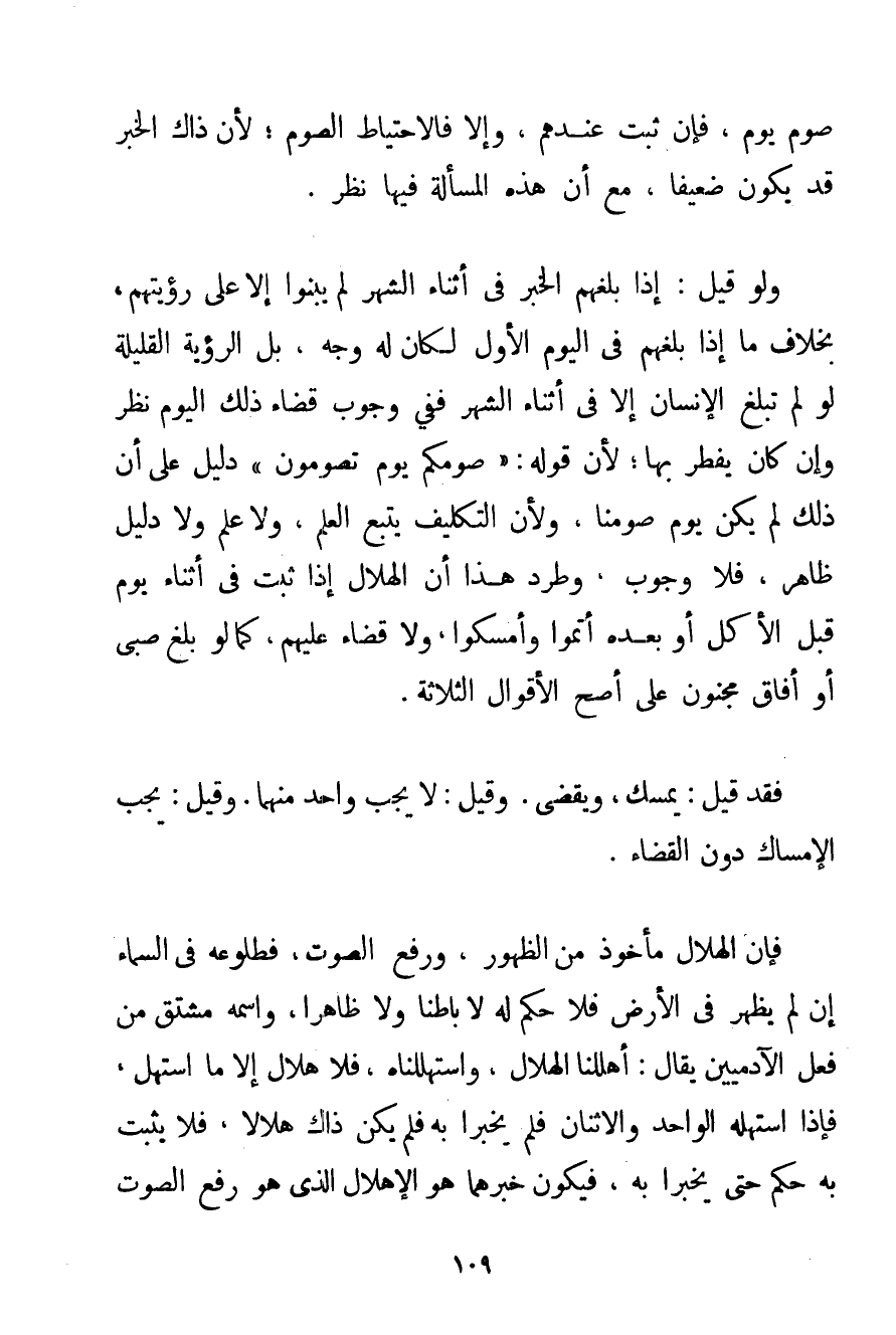 صَوْمِ يَوْمٍ فَإِنْ ثَبَتَ عِنْدَهُمْ وَإِلَّا فَالِاحْتِيَاطُ الصَّوْمُ؛ لِأَنَّ ذَاكَ الْخَبَرَ قَدْ يَكُونُ ضَعِيفًا مَعَ أَنَّ هَذِهِ الْمَسْأَلَةَ فِيهَا نَظَرٌ. وَلَوْ قِيلَ: إذَا بَلَغَهُمْ الْخَبَرُ فِي أَثْنَاءِ الشَّهْرِ لَمْ يَبْنُوا إلَّا عَلَى رُؤْيَتِهِمْ بِخِلَافِ مَا إذَا بَلَغَهُمْ فِي الْيَوْمِ الْأَوَّلِ لَكَانَ لَهُ وَجْهٌ بَلْ الرُّؤْيَةُ الْقَلِيلَةُ لَوْ لَمْ تَبْلُغْ الْإِنْسَانَ إلَّا فِي أَثْنَاءِ الشَّهْرِ فَفِي وُجُوبِ قَضَاءِ ذَلِكَ الْيَوْمِ نَظَرٌ وَإِنْ كَانَ يُفْطِرُ بِهَا؛ لِأَنَّ قَوْلَهُ: {صَوْمُكُمْ يَوْمَ تَصُومُونَ} دَلِيلٌ عَلَى أَنَّ ذَلِكَ لَمْ يَكُنْ يَوْمَ صَوْمِنَا وَلِأَنَّ التَّكْلِيفَ يَتْبَعُ الْعِلْمَ وَلَا عِلْمَ وَلَا دَلِيلَ ظَاهِرٌ فَلَا وُجُوبَ وَطَرْدُ هَذَا أَنَّ الْهِلَالَ إذَا ثَبَتَ فِي أَثْنَاءِ يَوْمٍ قَبْلَ الْأَكْلِ أَوْ بَعْدَهُ أَتَمُّوا وَأَمْسَكُوا وَلَا قَضَاءَ عَلَيْهِمْ كَمَا لَوْ بَلَغَ صَبِيٌّ أَوْ أَفَاقَ مَجْنُونٌ عَلَى أَصَحِّ الْأَقْوَالِ الثَّلَاثَةِ. فَقَدْ قِيلَ: يُمْسِكُ وَيَقْضِي. وَقِيلَ: لَا يَجِبُ وَاحِدٌ مِنْهُمَا. وَقِيلَ: يَجِبُ الْإِمْسَاكُ دُونَ الْقَضَاءِ.