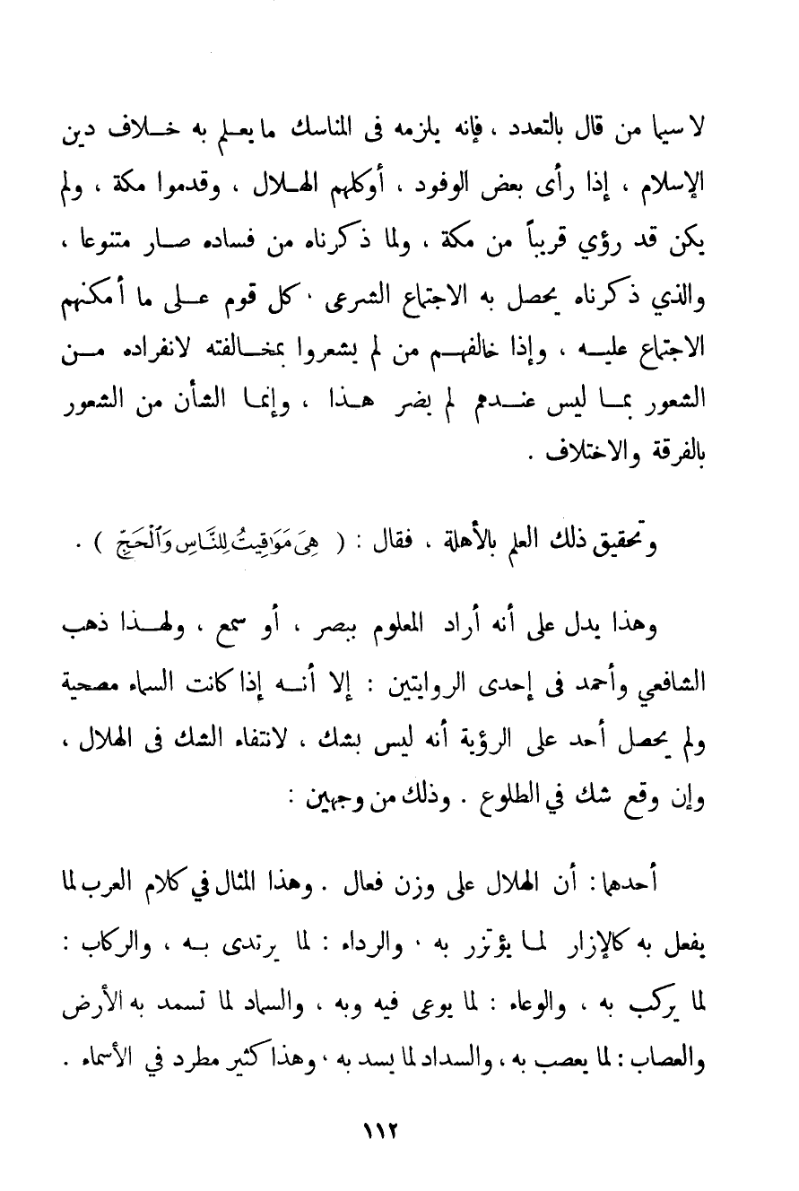 لَا سِيَّمَا مَنْ قَالَ بِالتَّعَدُّدِ فَإِنَّهُ يَلْزَمُهُ فِي الْمَنَاسِكِ مَا يُعْلَمُ بِهِ خِلَافُ دِينِ الْإِسْلَامِ إذَا رَأَى بَعْضُ الْوُفُودِ أَوْ كُلُّهُمْ الْهِلَالَ وَقَدِمُوا مَكَّةَ وَلَمْ يَكُنْ قَدْ رُئِيَ قَرِيبًا مِنْ مَكَّةَ وَلِمَا ذَكَرْنَاهُ مِنْ فَسَادِهِ صَارَ مُتَنَوِّعًا وَاَلَّذِي ذَكَرْنَاهُ يَحْصُلُ بِهِ الِاجْتِمَاعُ الشَّرْعِيُّ كُلُّ قَوْمٍ عَلَى مَا أَمْكَنَهُمْ الِاجْتِمَاعُ عَلَيْهِ وَإِذَا خَالَفَهُمْ مَنْ لَمْ يَشْعُرُوا بِمُخَالَفَتِهِ لِانْفِرَادِهِ مِنْ الشُّعُورِ بِمَا لَيْسَ عِنْدَهُمْ لَمْ يَضُرَّ هَذَا وَإِنَّمَا الشَّأْنُ مِنْ الشُّعُورِ بِالْفُرْقَةِ وَالِاخْتِلَافِ. وَتَحْقِيقُ ذَلِكَ الْعِلْمُ بِالْأَهِلَّةِ فَقَالَ: {هِيَ مَوَاقِيتُ لِلنَّاسِ وَالْحَجِّ} . وَهَذَا يَدُلُّ عَلَى أَنَّهُ أَرَادَ الْمَعْلُومَ بِبَصَرِ أَوْ سَمْعٍ وَلِهَذَا ذَهَبَ الشَّافِعِيِّ وَأَحْمَد فِي إحْدَى الرِّوَايَتَيْنِ: إلَى أَنَّهُ إذَا كَانَتْ السَّمَاءُ مُصْحِيَةً وَلَمْ يَحْصُلْ أَحَدٌ عَلَى الرُّؤْيَةِ أَنَّهُ لَيْسَ بِشَكِّ لِانْتِفَاءِ الشَّكِّ فِي الْهِلَالِ وَإِنْ وَقَعَ شَكٌّ فِي الطُّلُوعِ. وَذَلِكَ مِنْ وَجْهَيْنِ: أَحَدُهُمَا: أَنَّ الْهِلَالَ عَلَى وَزْنِ فِعَالٍ. وَهَذَا الْمِثَالُ فِي كَلَامِ الْعَرَبِ لِمَا يُفْعَلُ بِهِ كَالْإِزَارِ لِمَا يؤتزر بِهِ وَالرِّدَاءِ: لِمَا يُرْتَدَى بِهِ وَالرِّكَابِ: لِمَا يُرْكَبُ بِهِ وَالْوِعَاءِ: لِمَا يُوعَى فِيهِ وَبِهِ والسماد لِمَا تُسَمَّدُ بِهِ الْأَرْضُ وَالْعِصَابِ: لِمَا يُعْصَبُ بِهِ وَالسِّدَادِ لِمَا يُسَدُّ بِهِ وَهَذَا كَثِيرٌ مُطَّرِدٌ فِي الْأَسْمَاءِ.